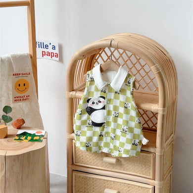 2402371LS-夏季薄款無袖短爬方格熊貓爬服