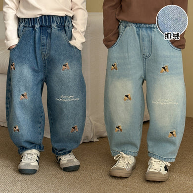 DK250689PA-秋冬季韓版抓絨狗狗刺繡牛仔長褲