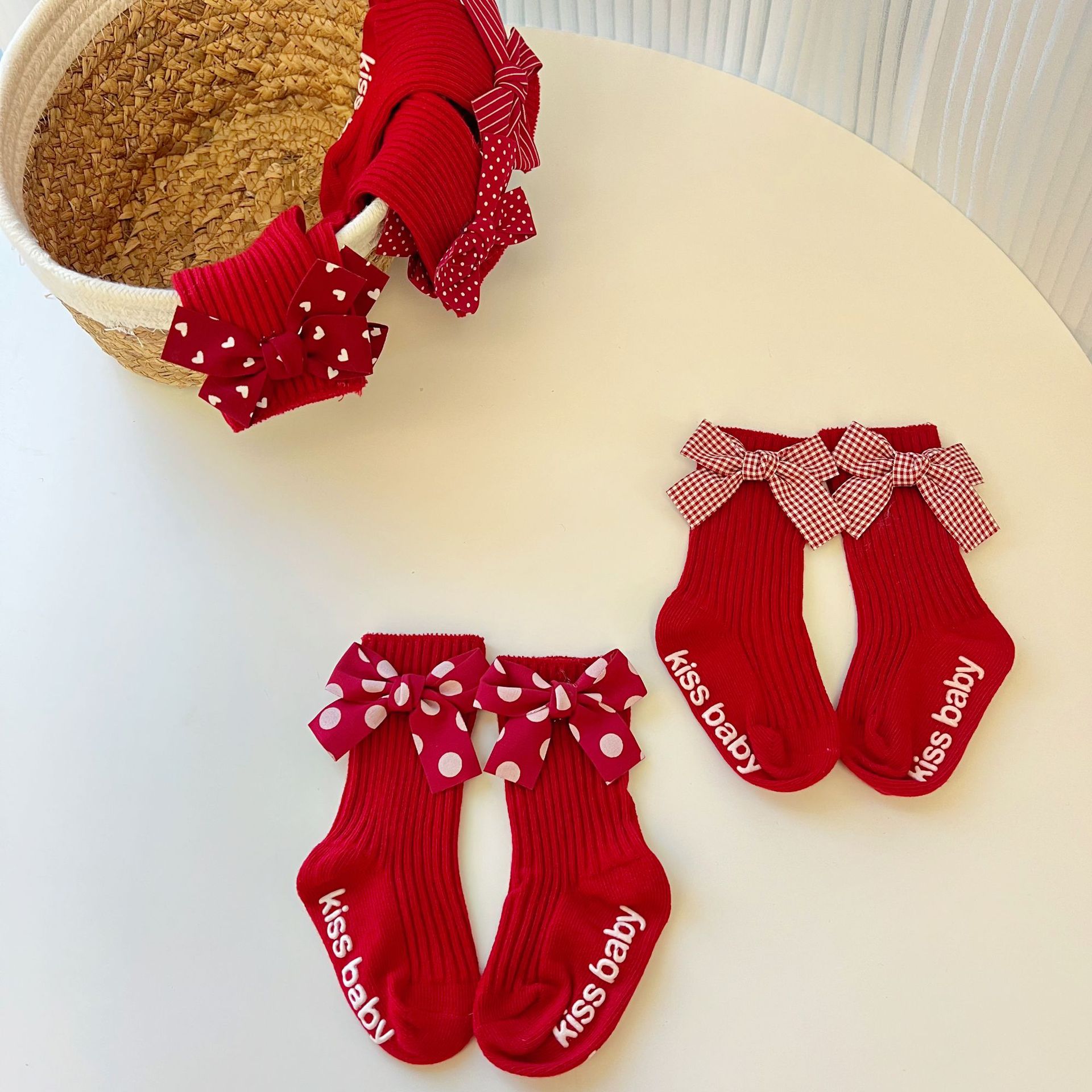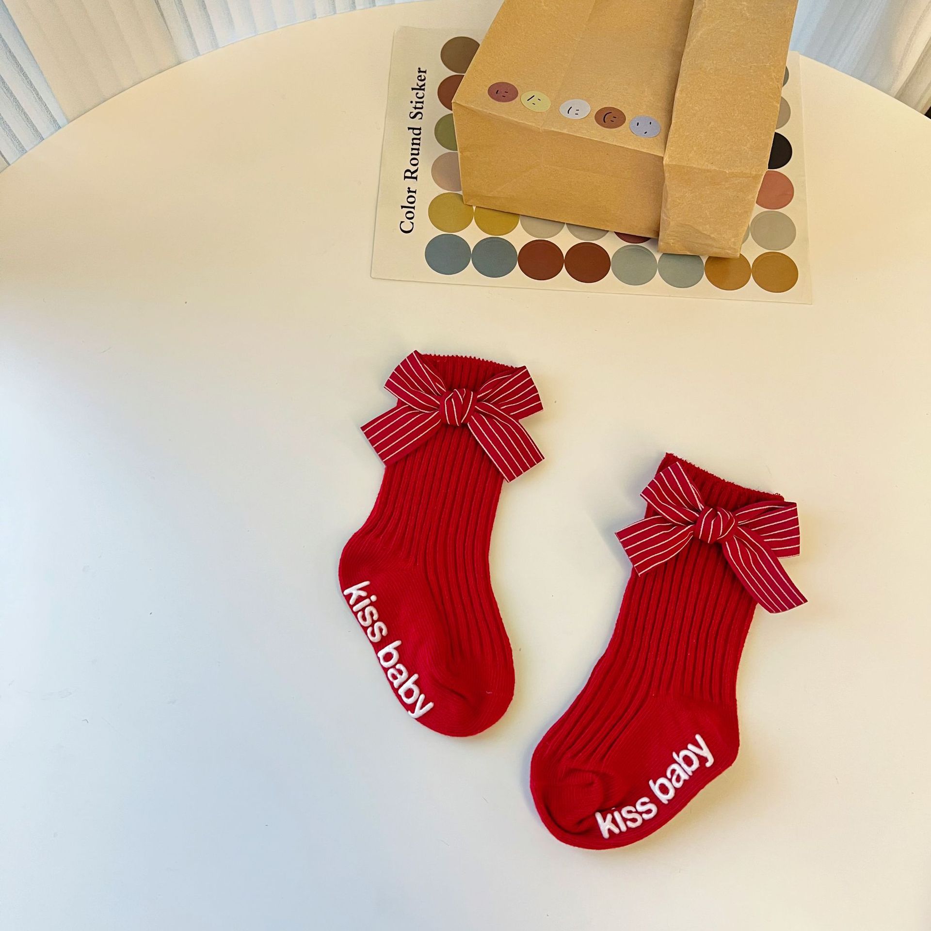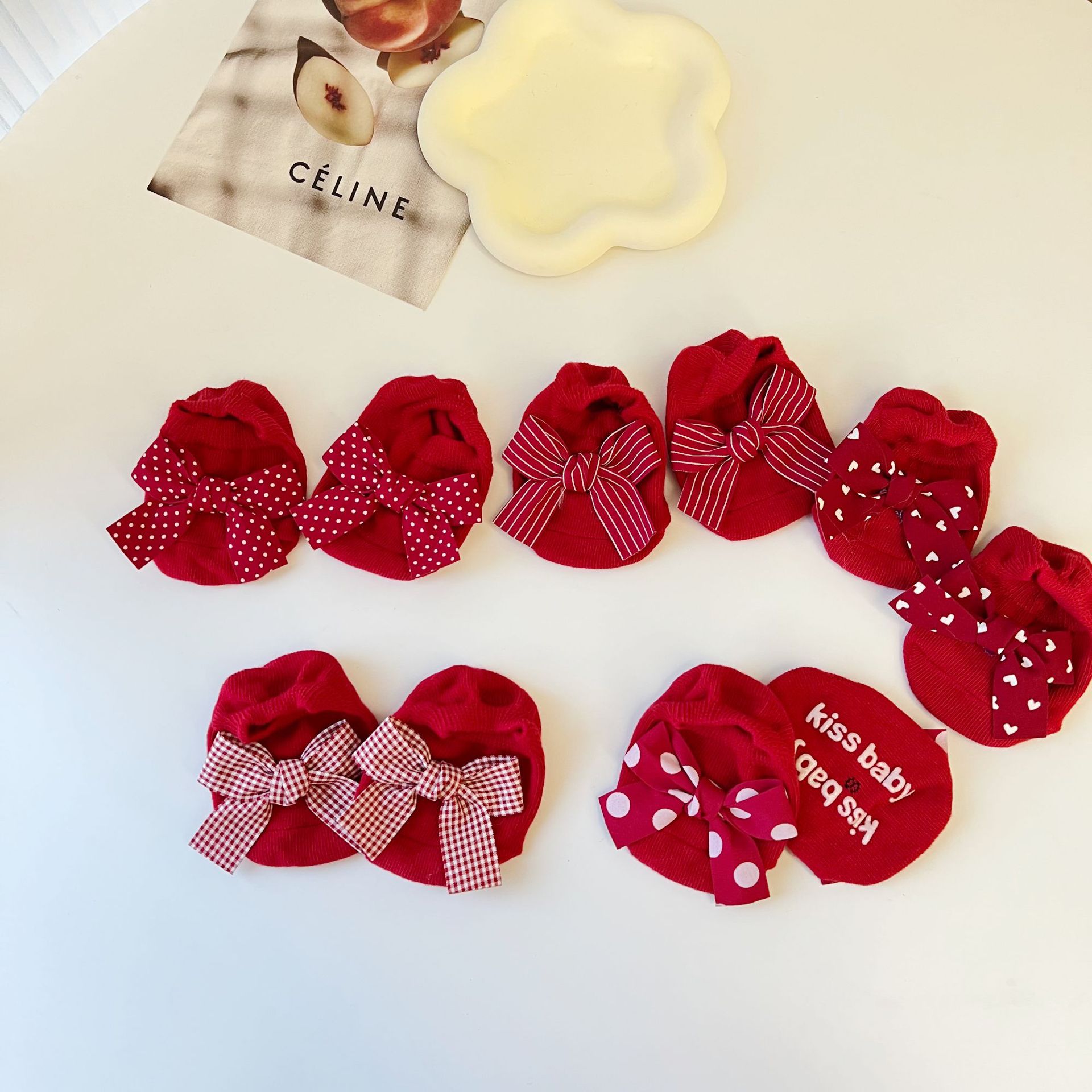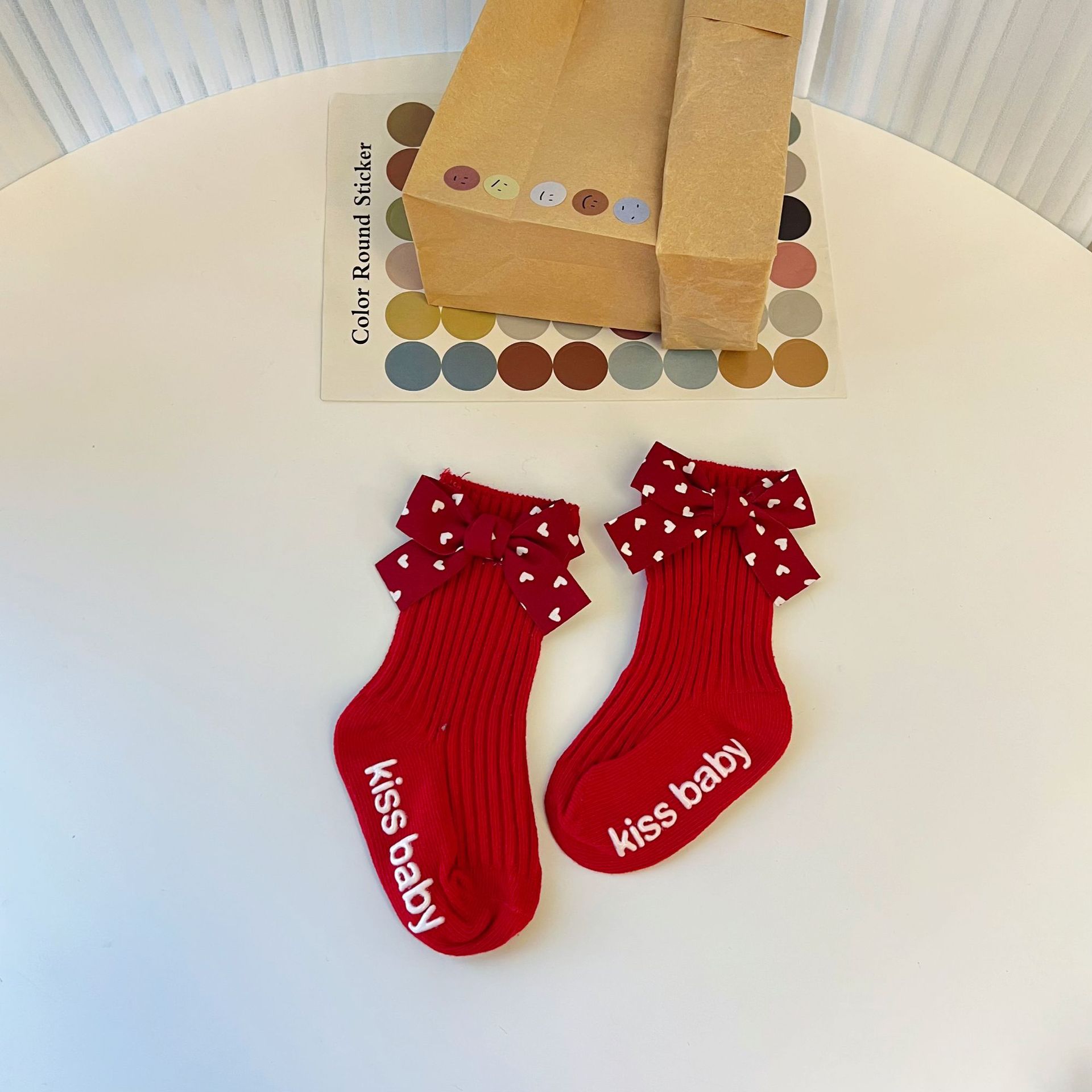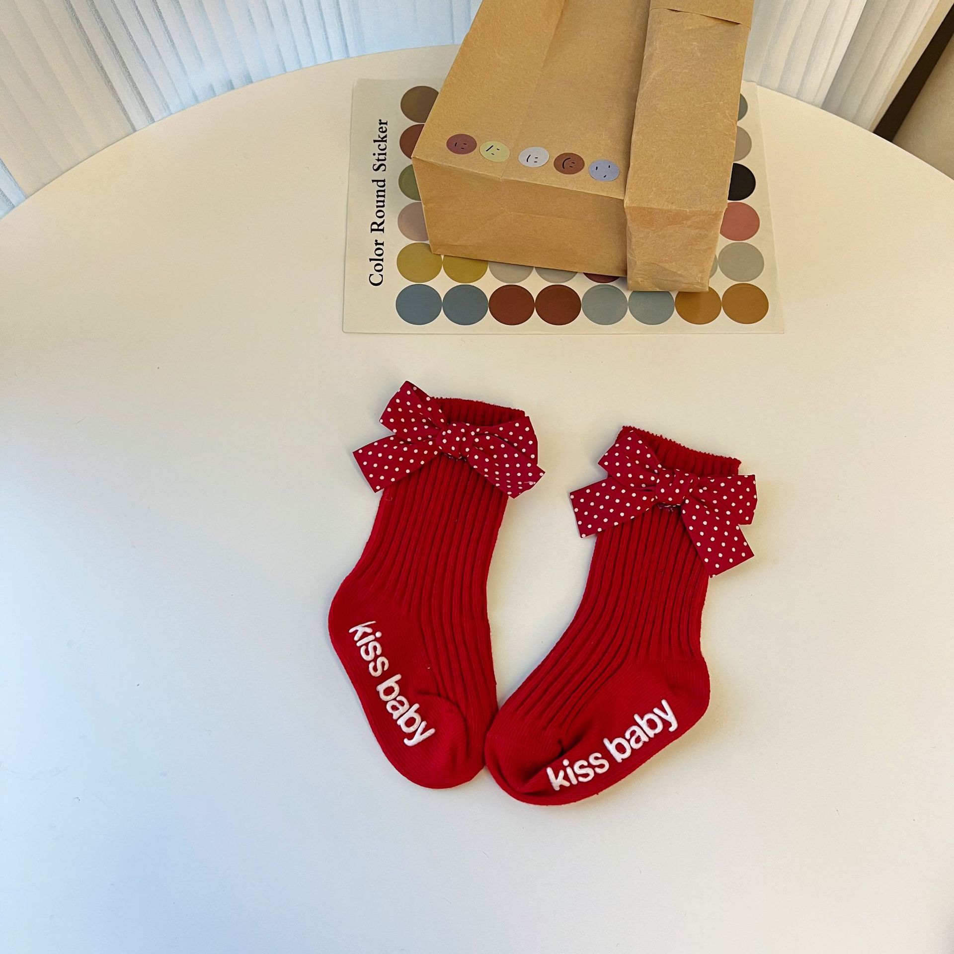 121110AC-Polka dot love big red bow cute shallow mouth double needle middle tube socks non-slip floor socks