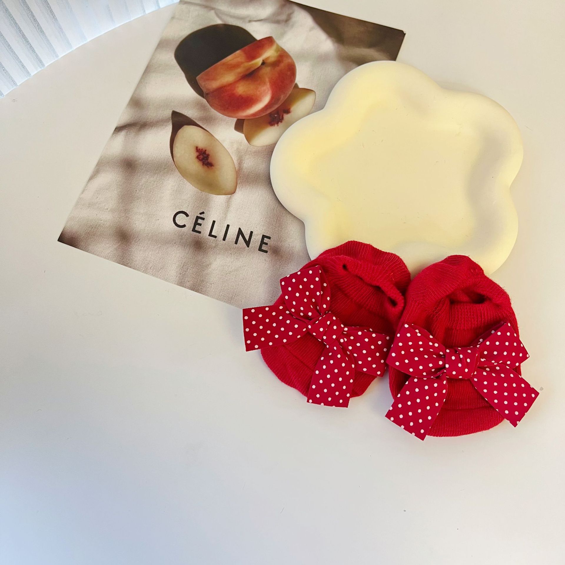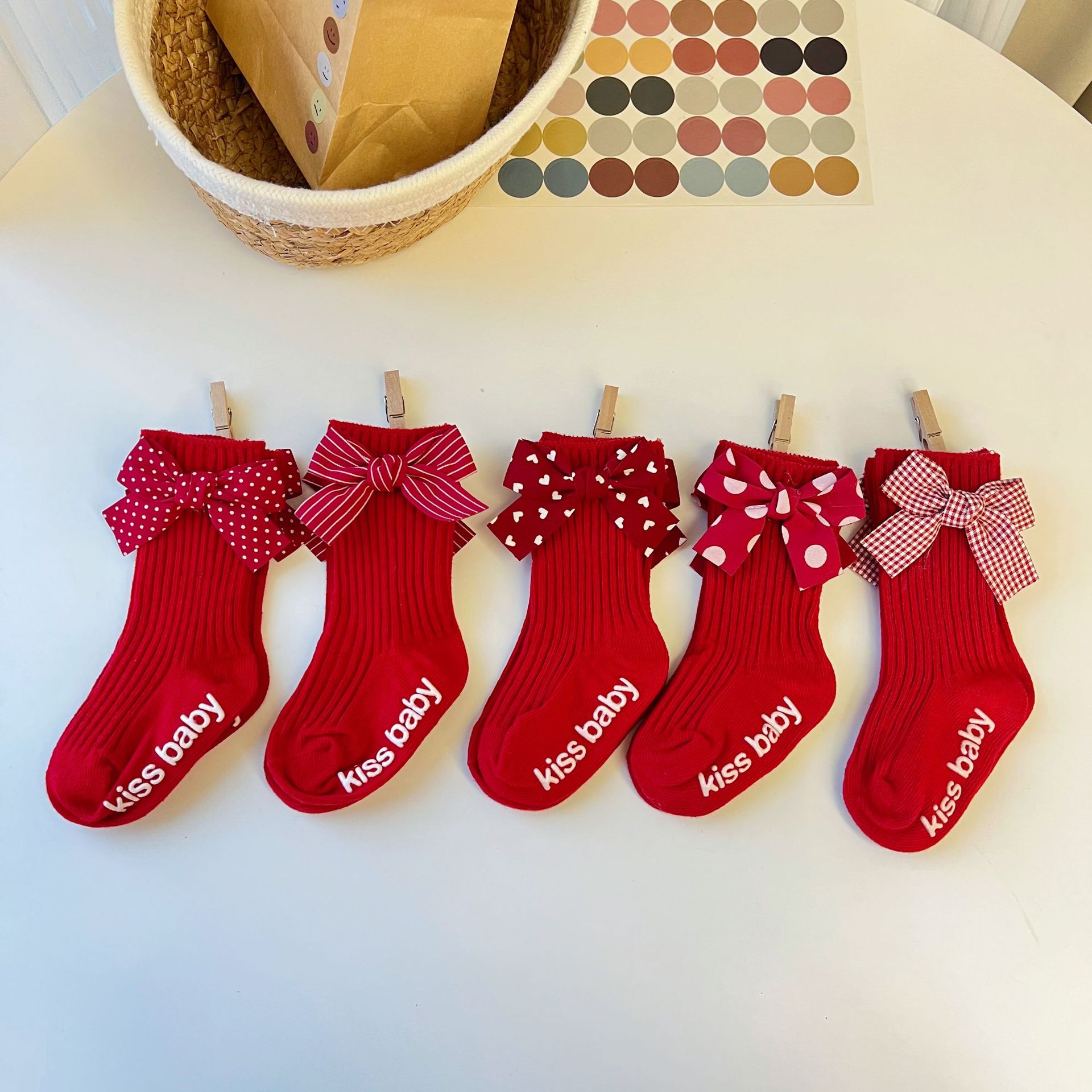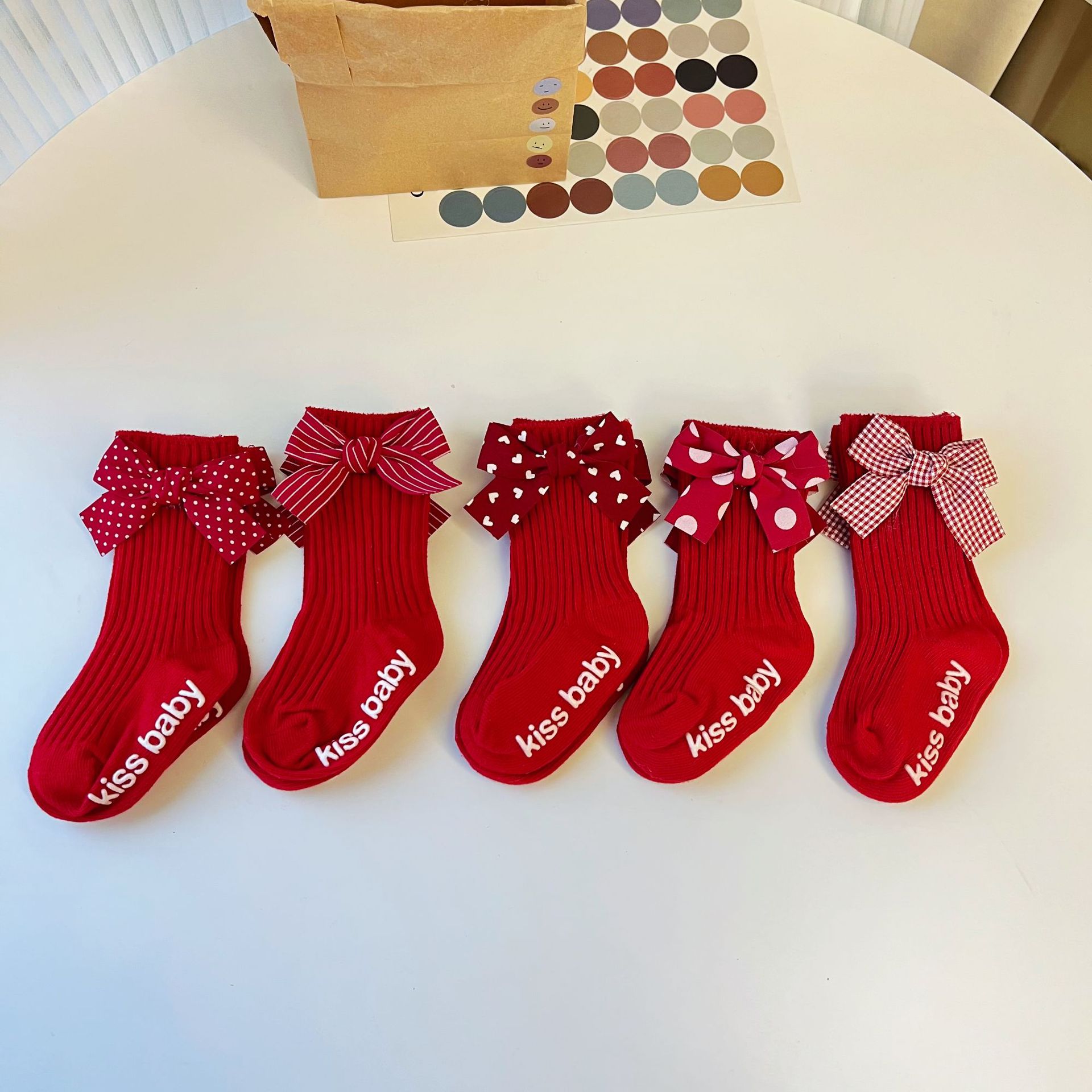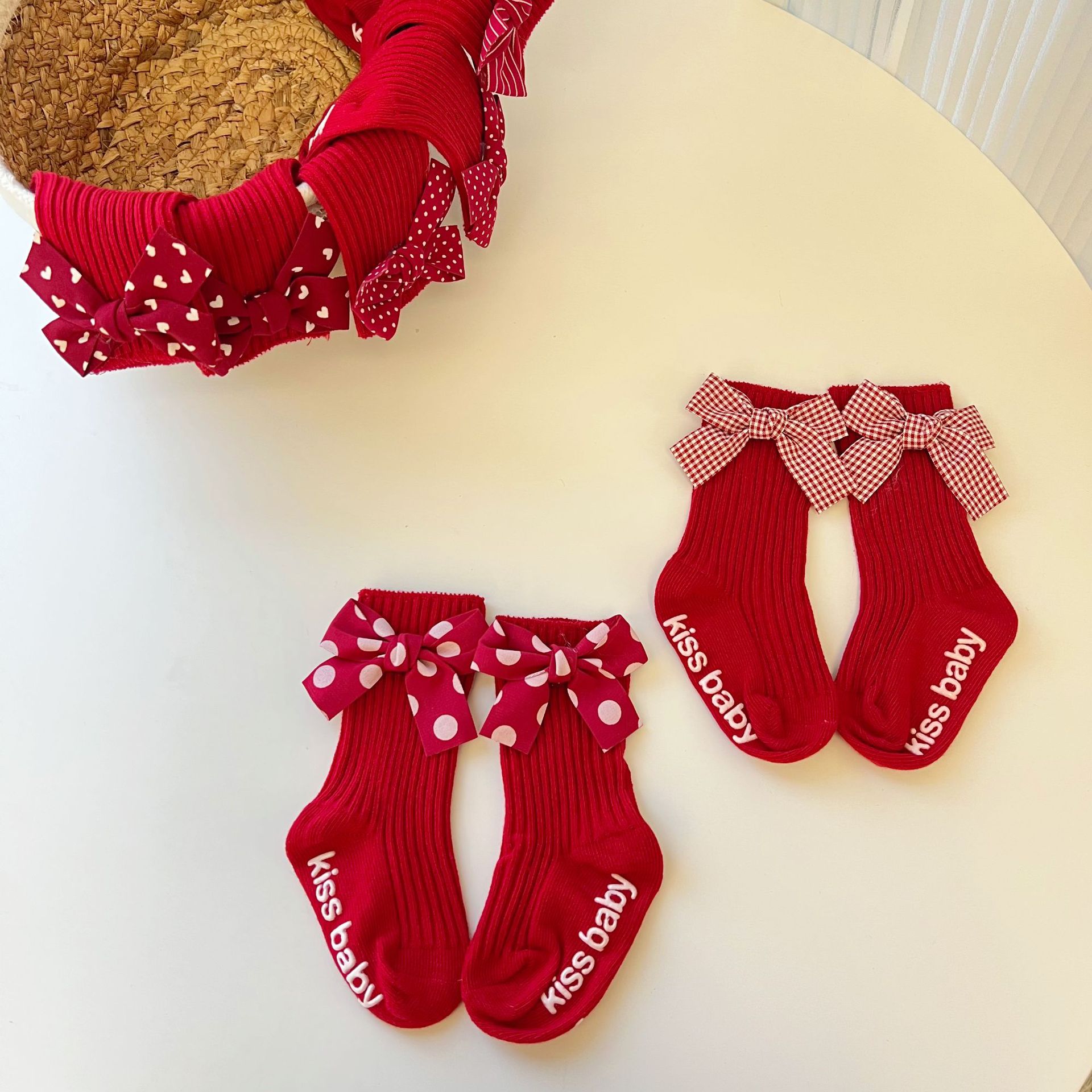 121110AC-Polka dot love big red bow cute shallow mouth double needle middle tube socks non-slip floor socks