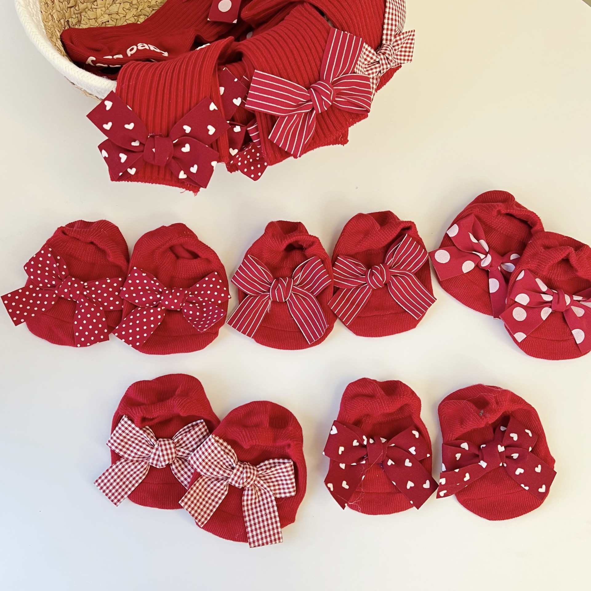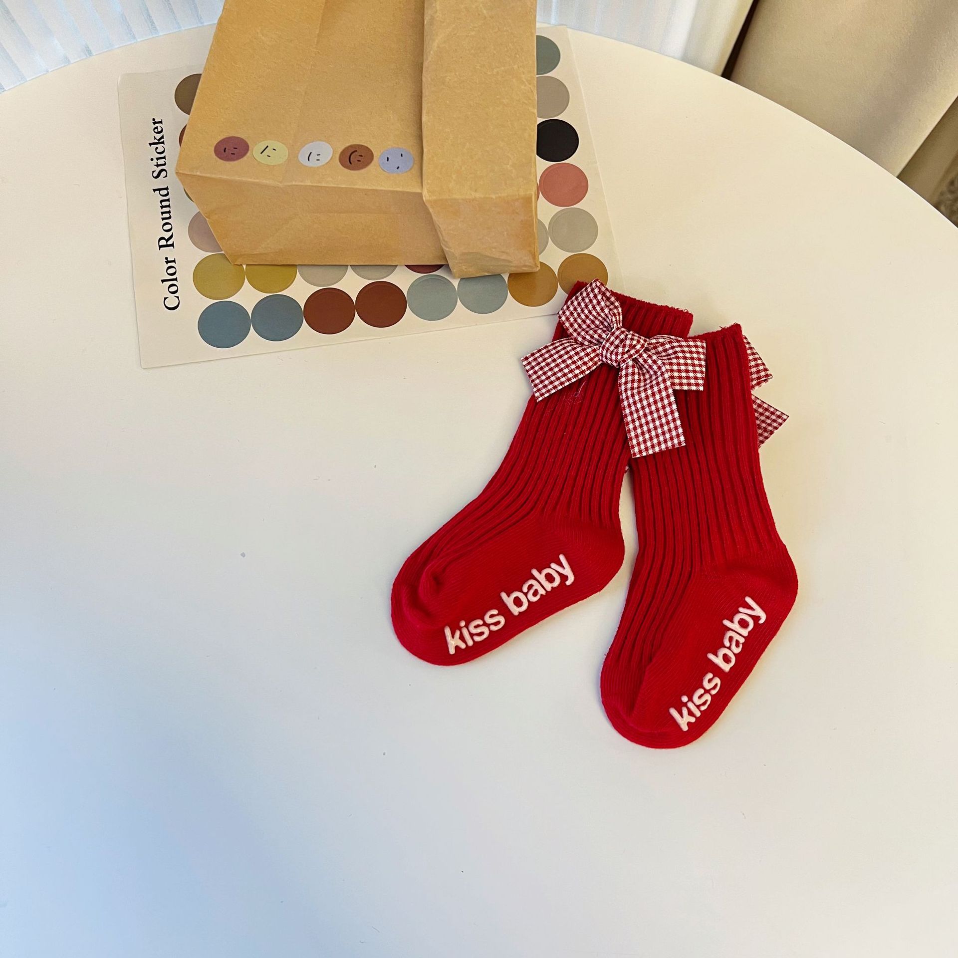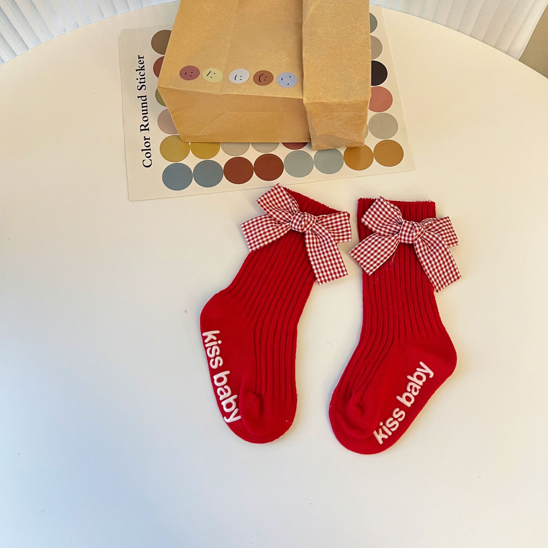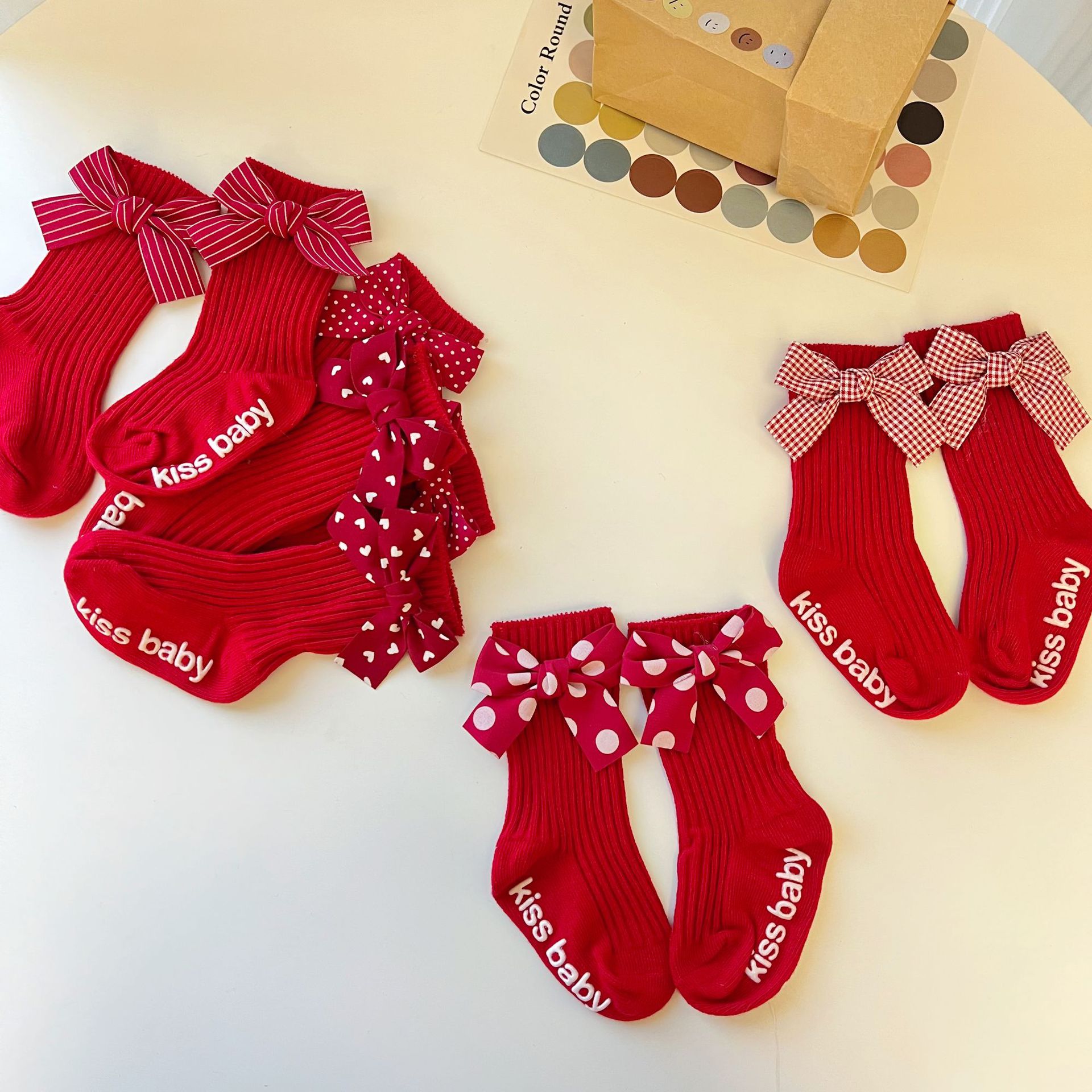 121110AC-Polka dot love big red bow cute shallow mouth double needle middle tube socks non-slip floor socks