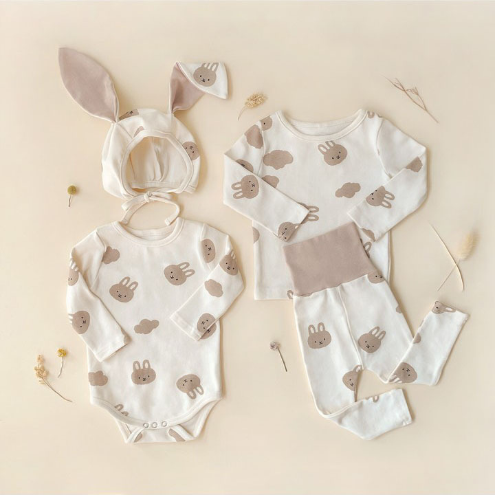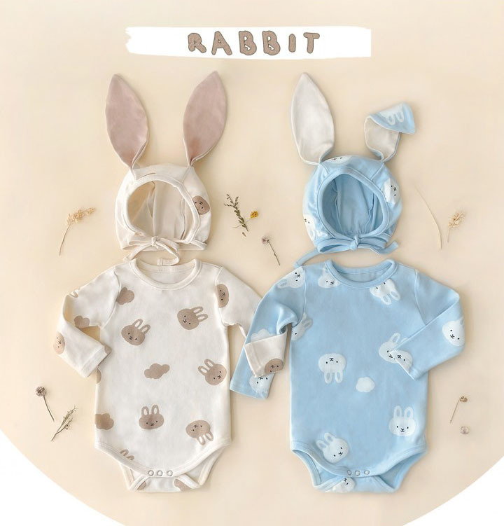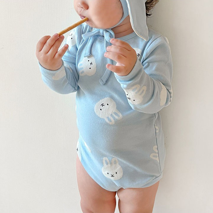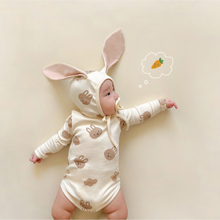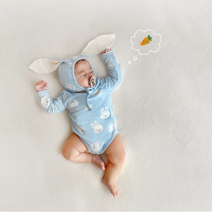 30106LS-Spring Korean version of bunny full print bodysuit + hat two-piece set