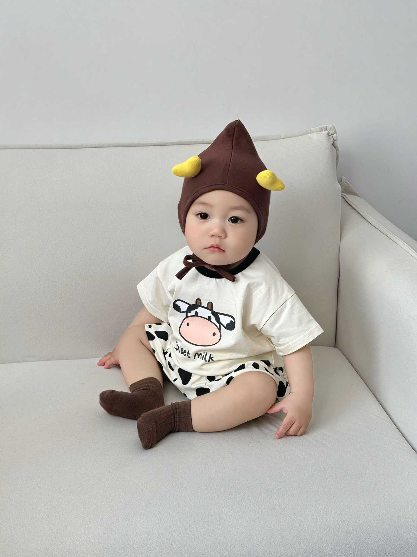 52803LS-Summer Korean version of small round neck calf print top + shorts + hat set