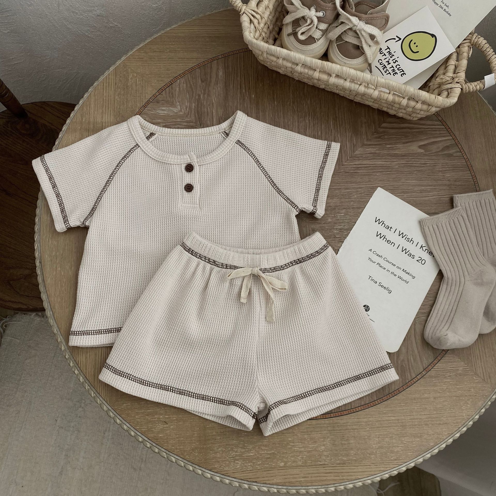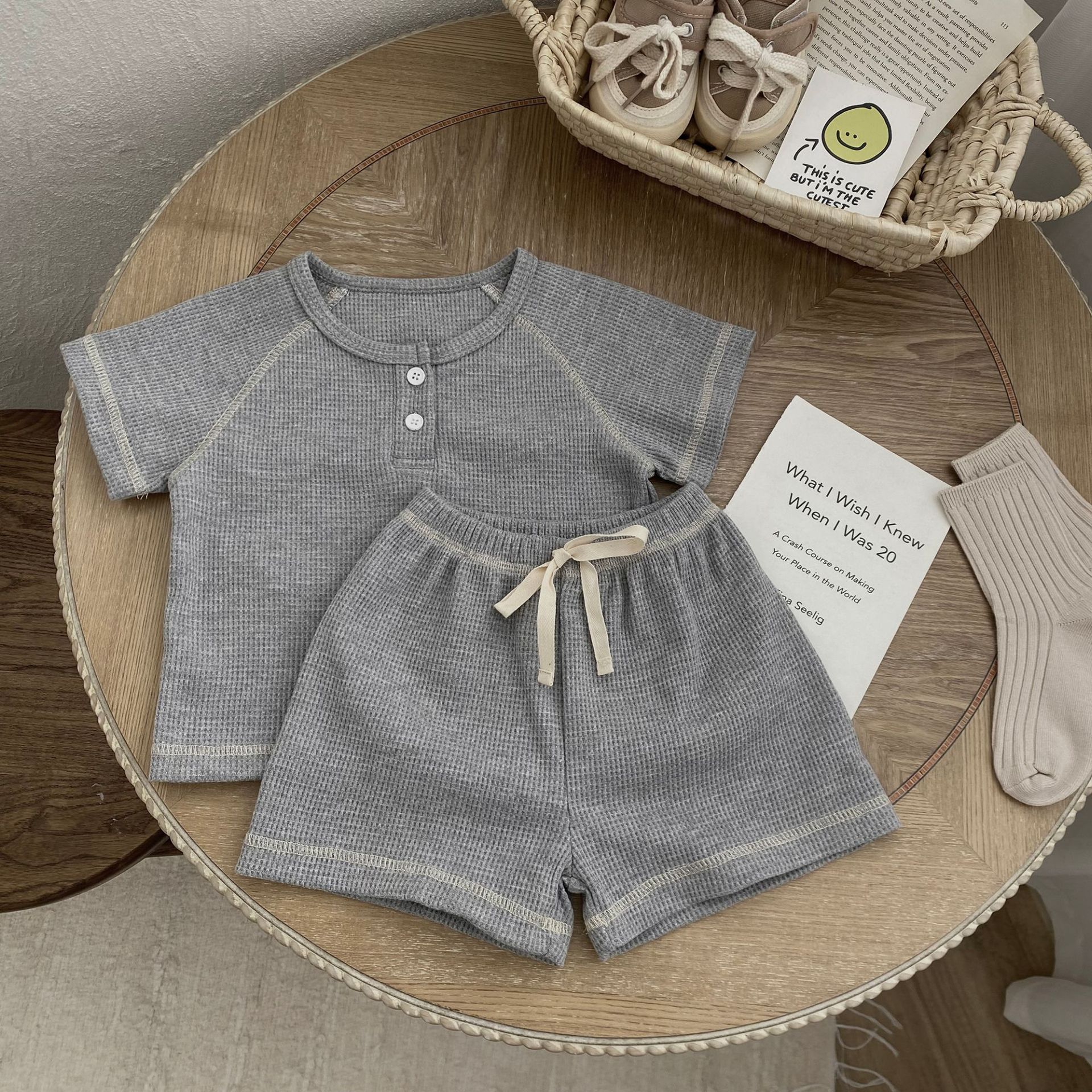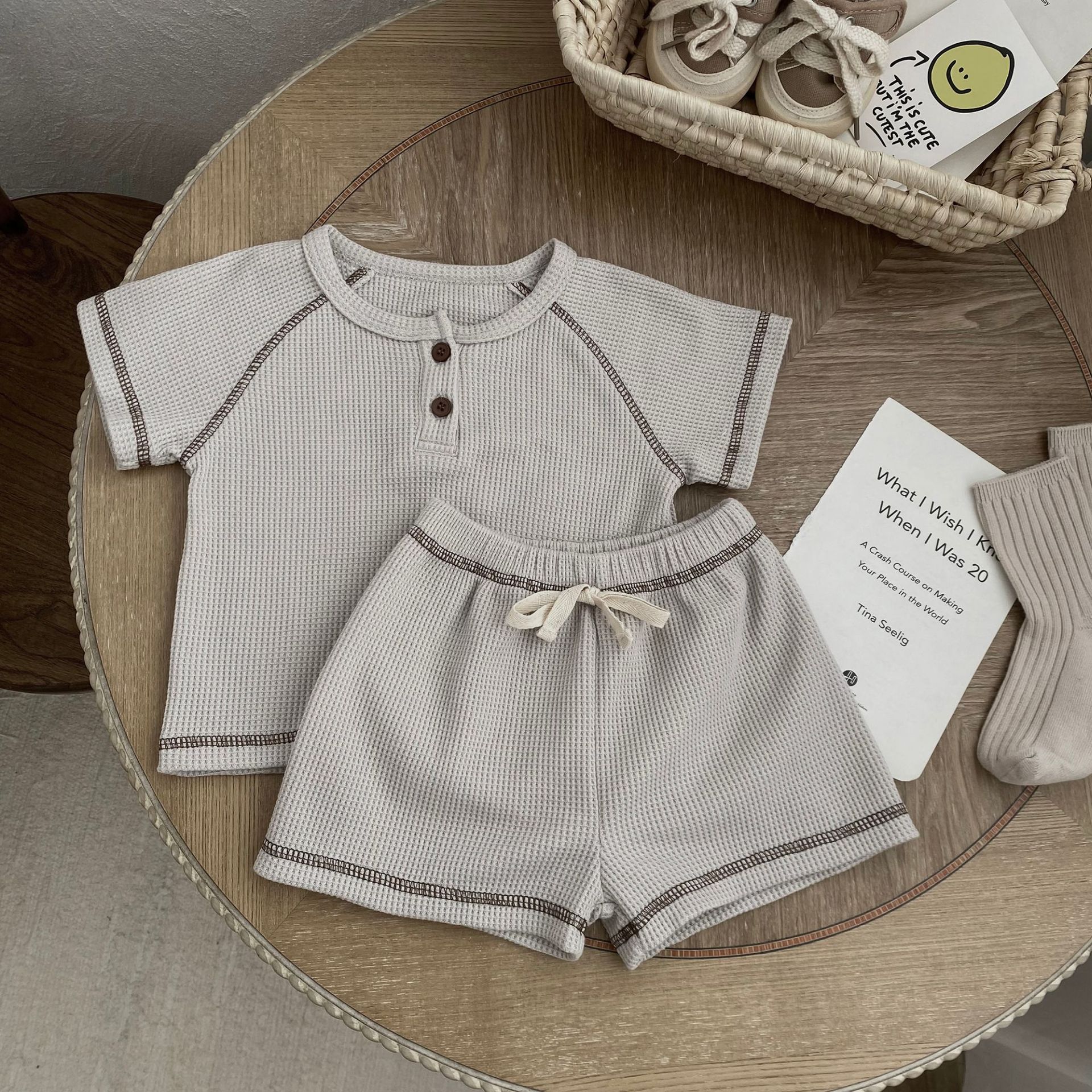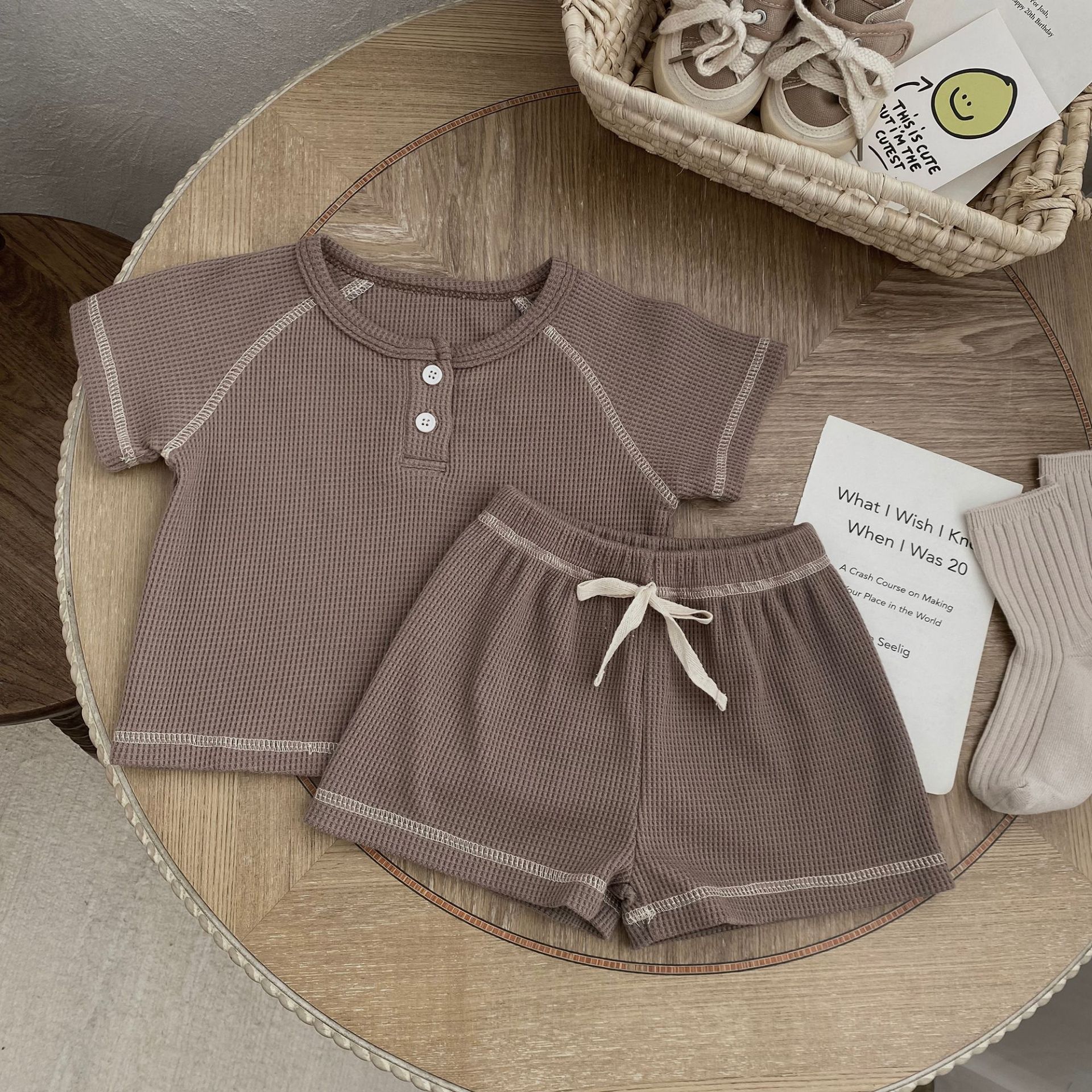 70105LS-Summer Korean waffle short-sleeved top + shorts two-piece set