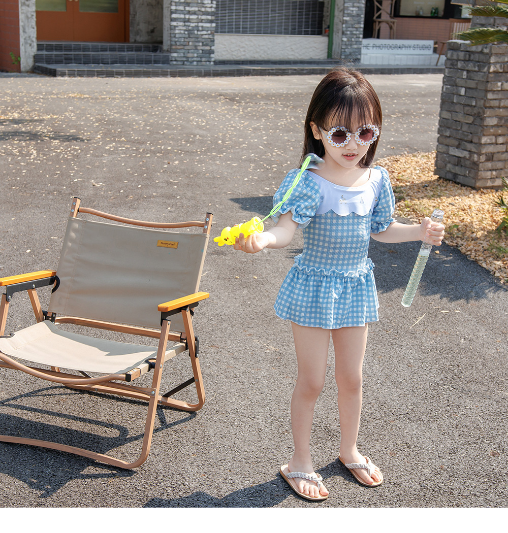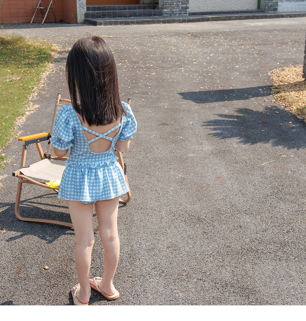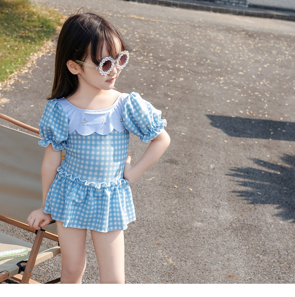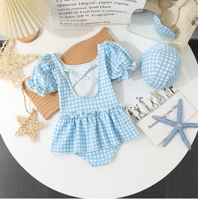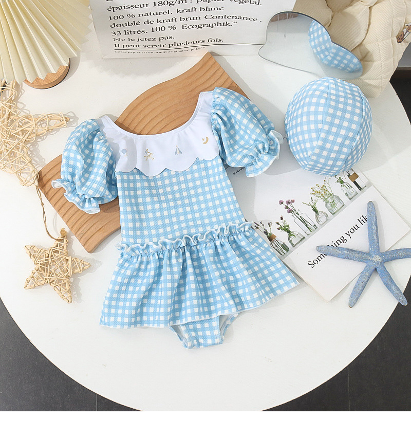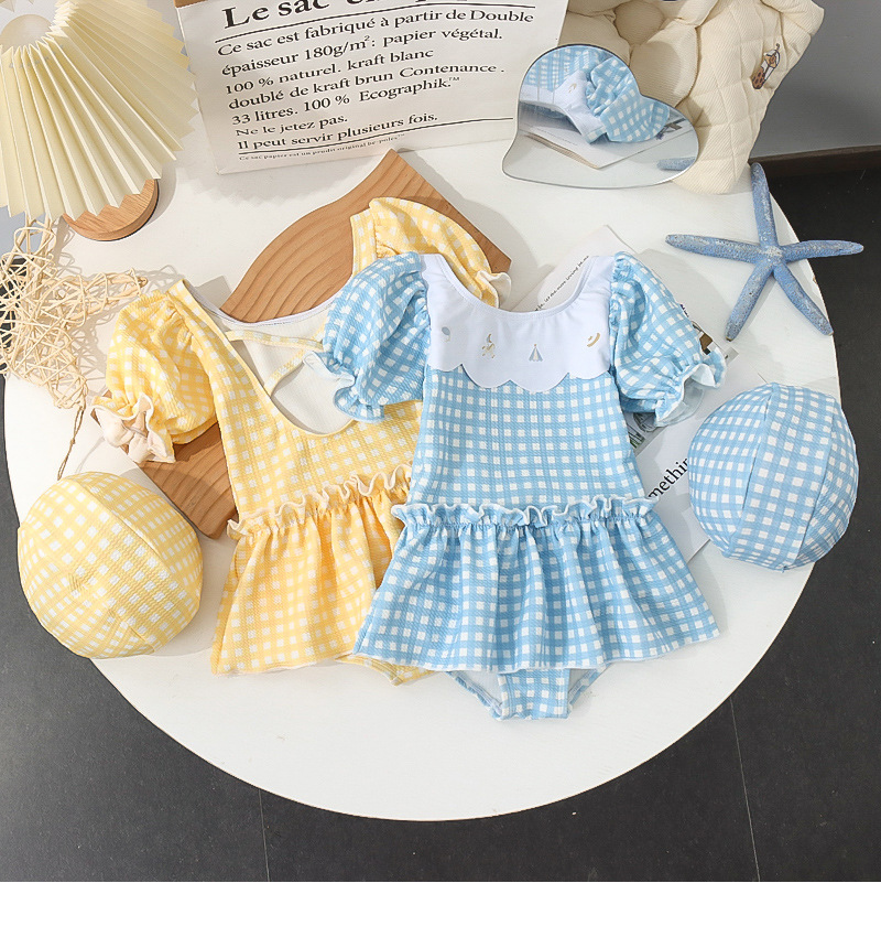 7126LS-Baby Girls Cartoon Cute Plaid One-Piece Swimsuit + Swimming Cap