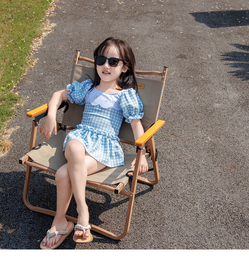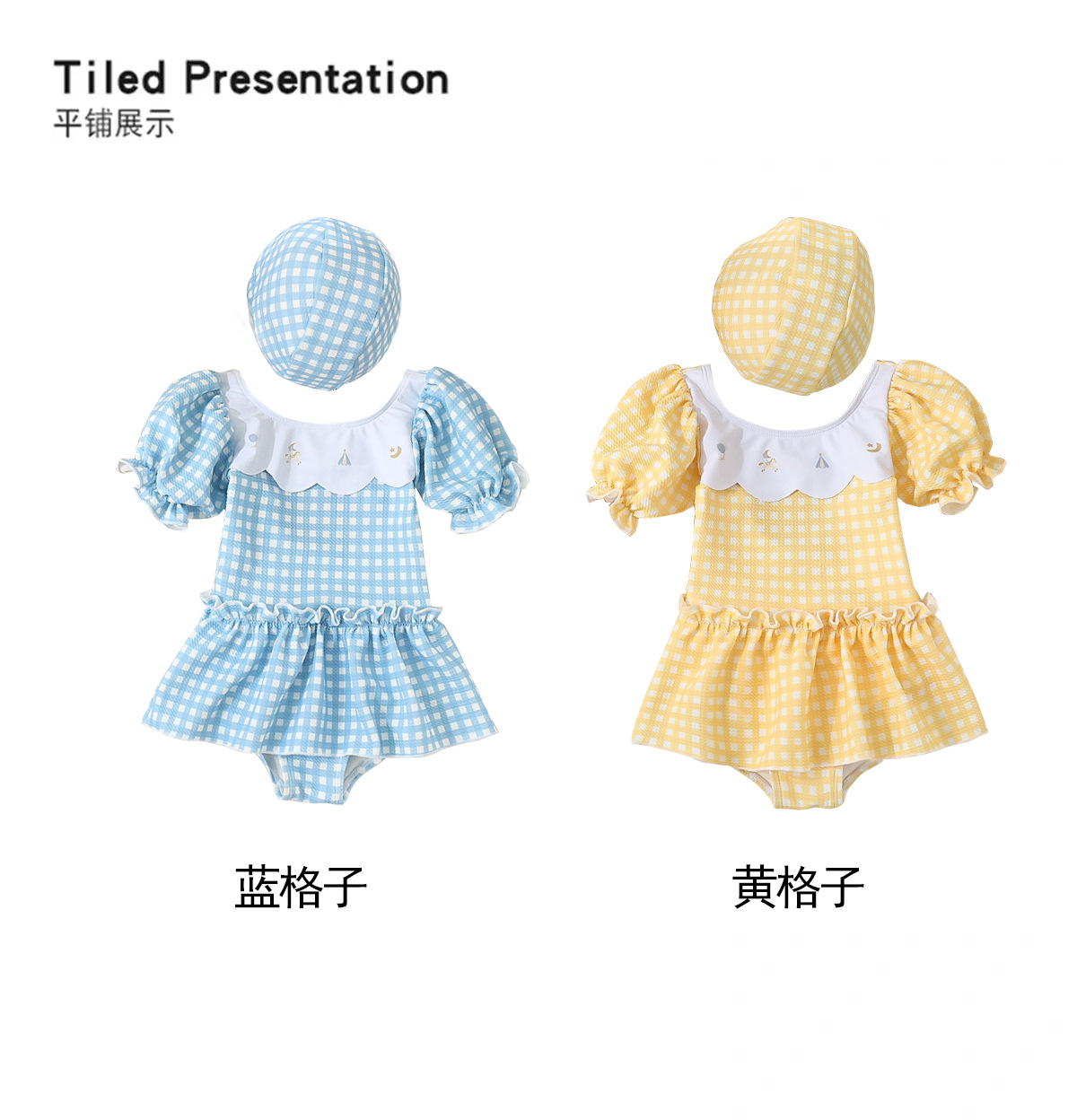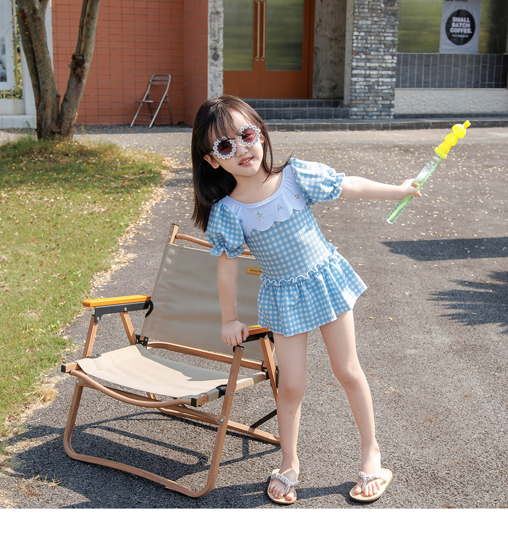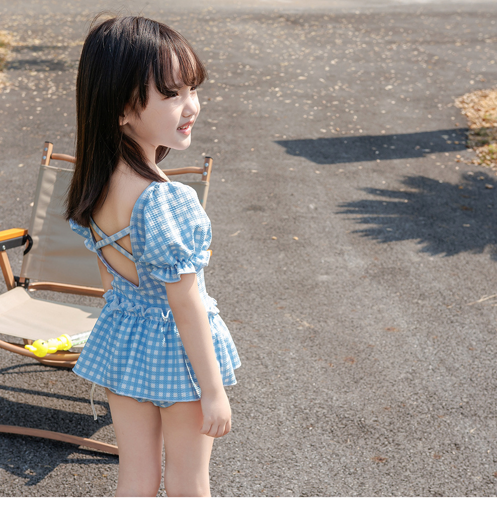 7126LS-Baby Girls Cartoon Cute Plaid One-Piece Swimsuit + Swimming Cap