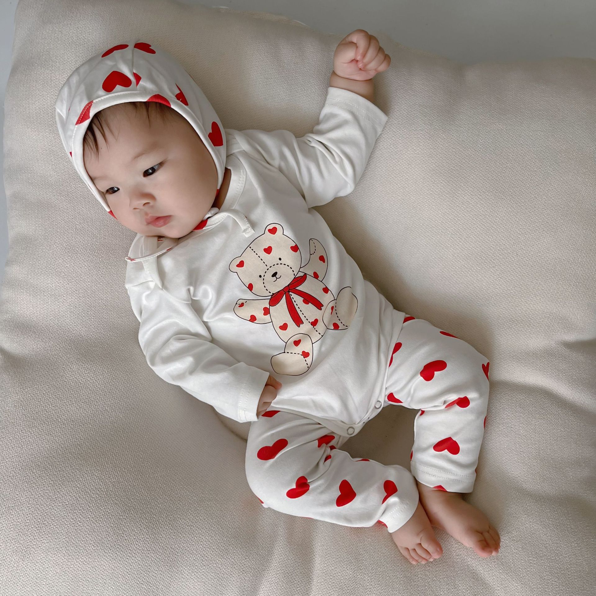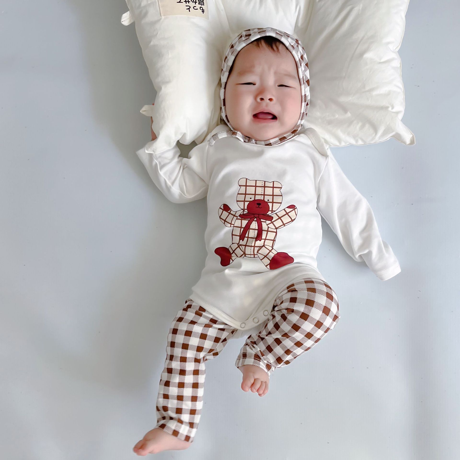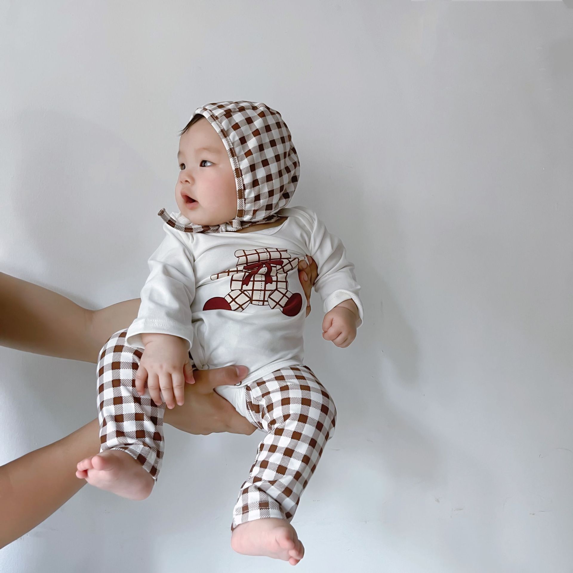 72205LS-Autumn Korean version of the heart checkered bear bodysuit + pants + hat three-piece set