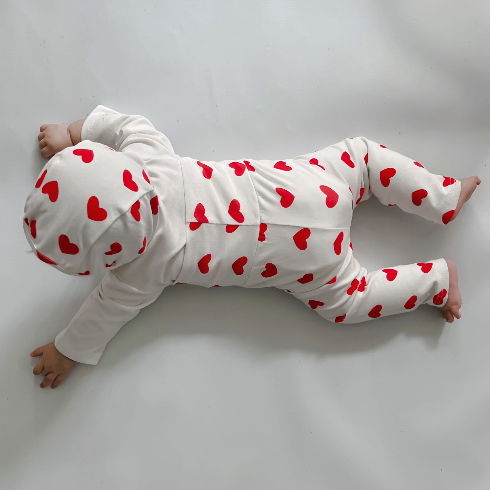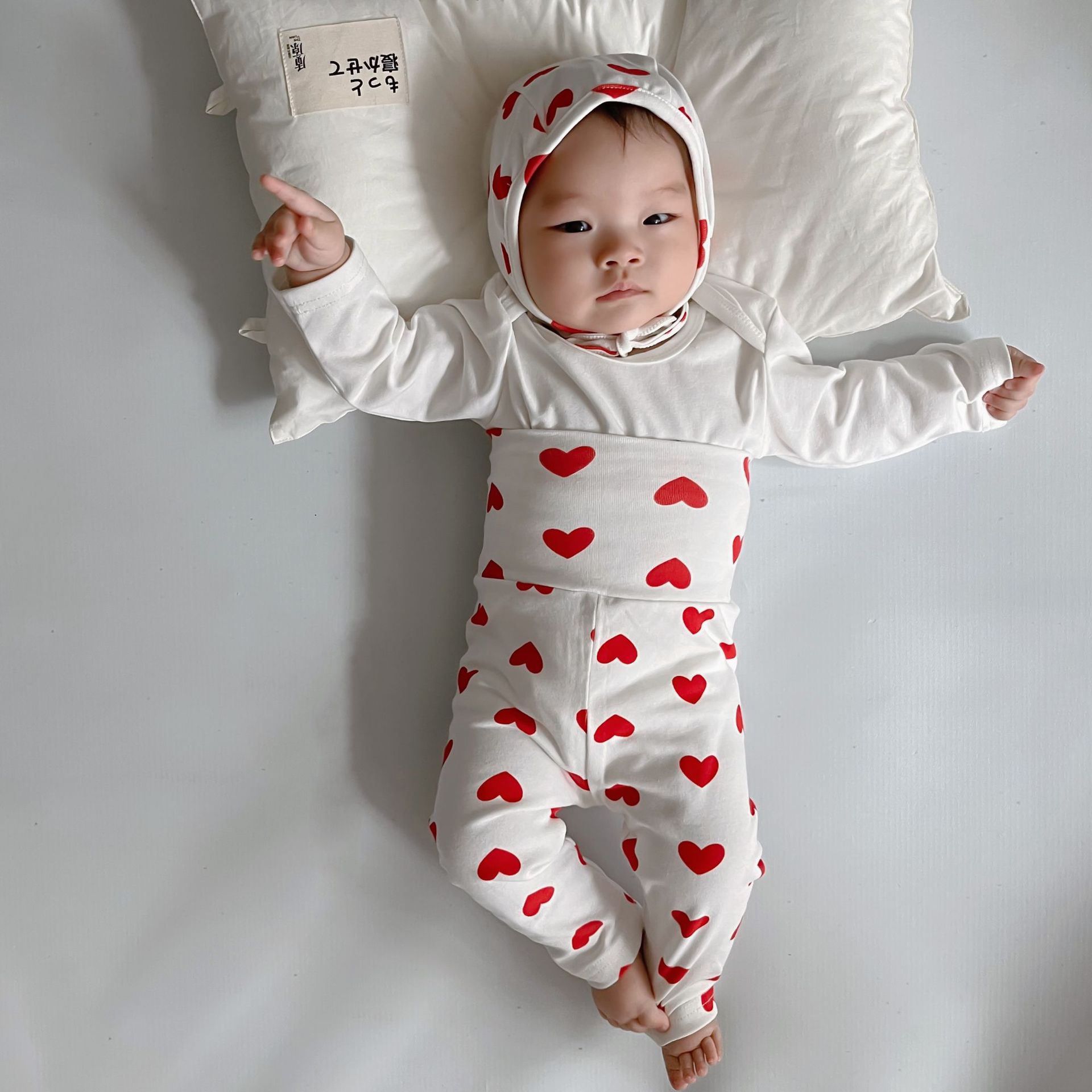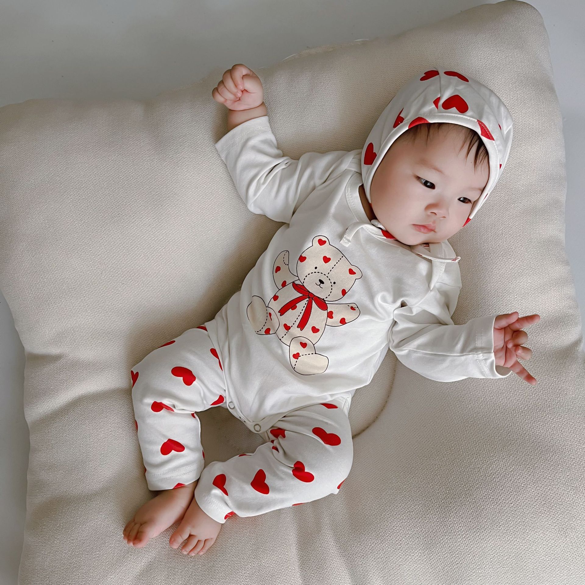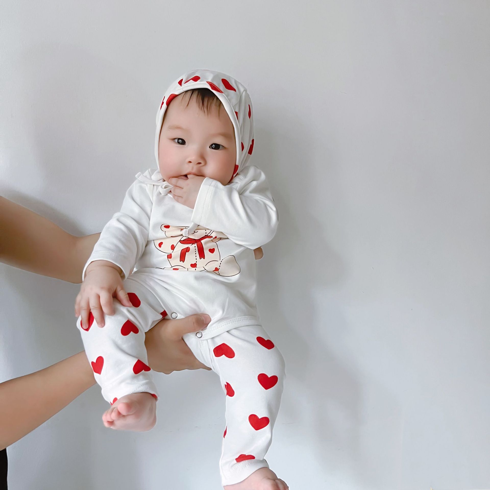 72205LS-Autumn Korean version of the heart checkered bear bodysuit + pants + hat three-piece set