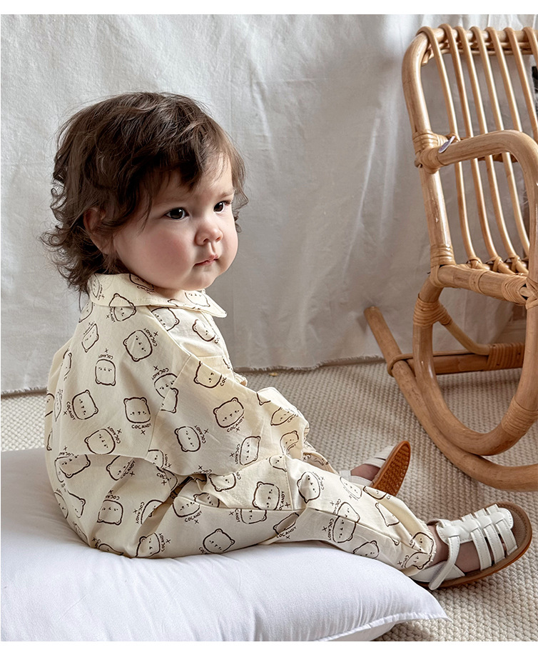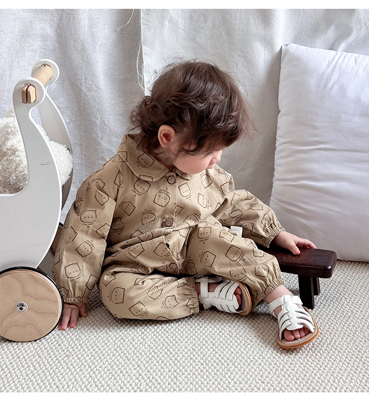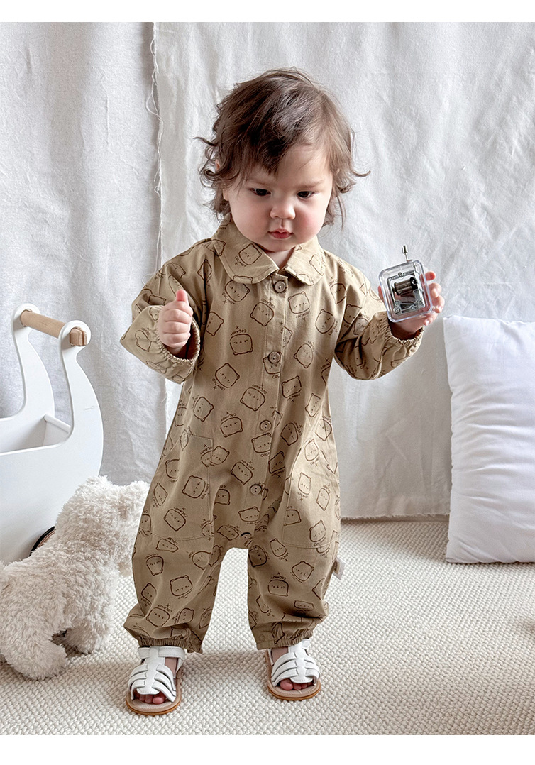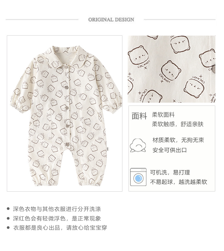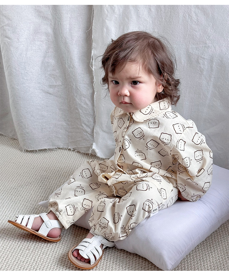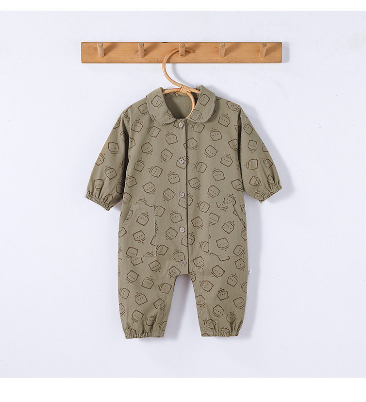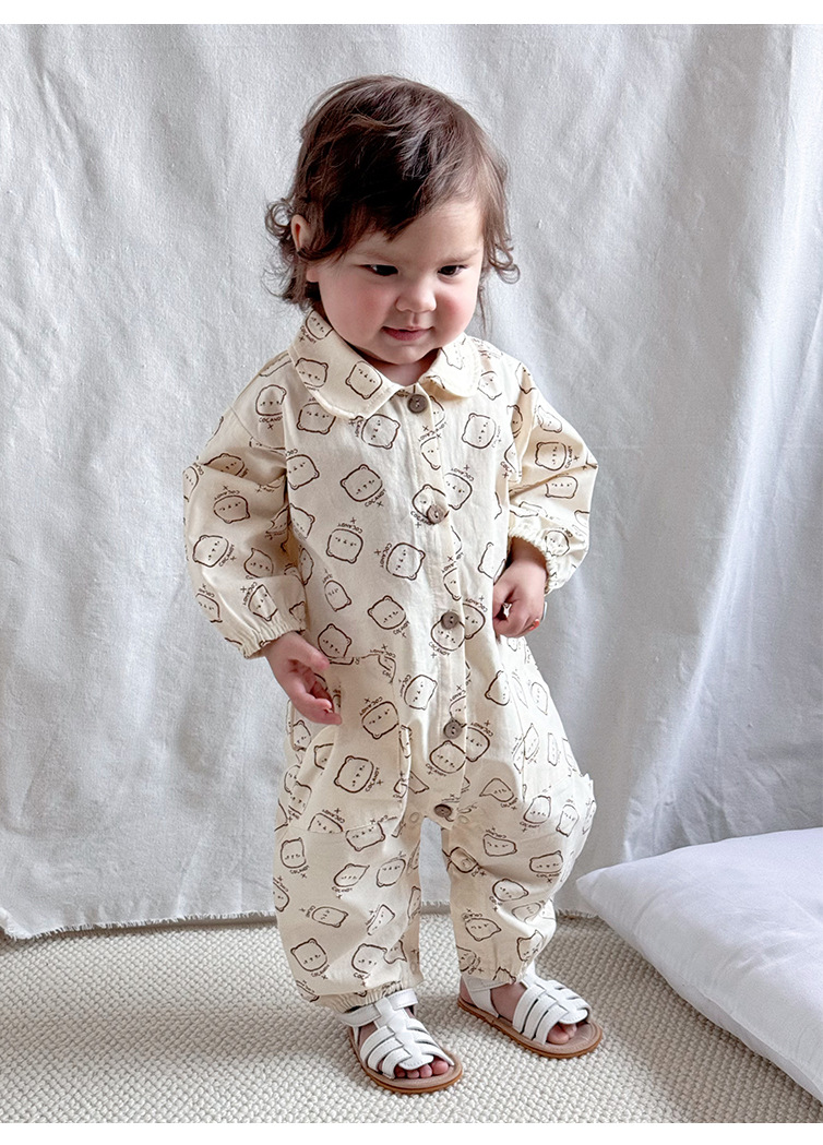 D25059LS-Spring and summer pure cotton baby bear lapel print crawling clothes