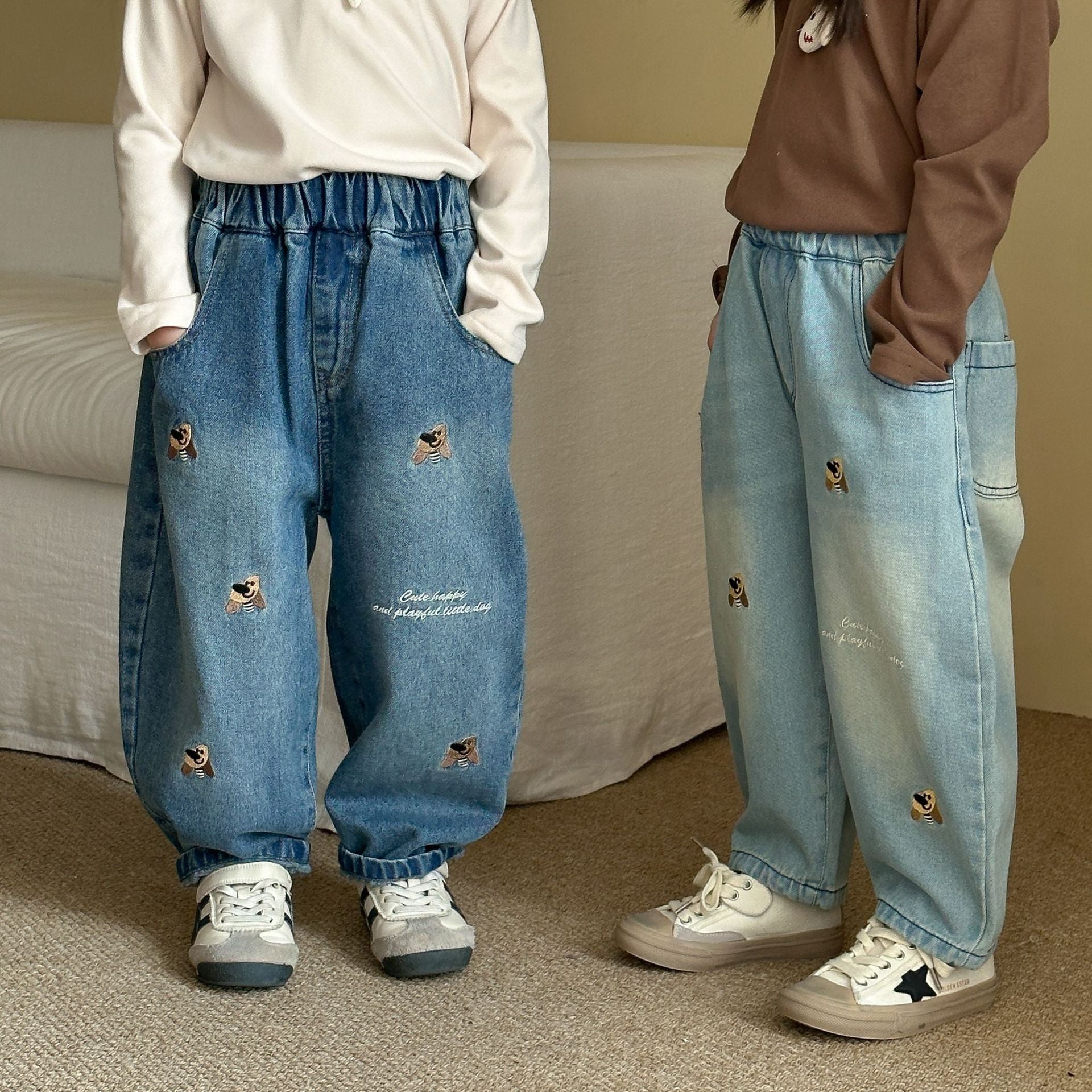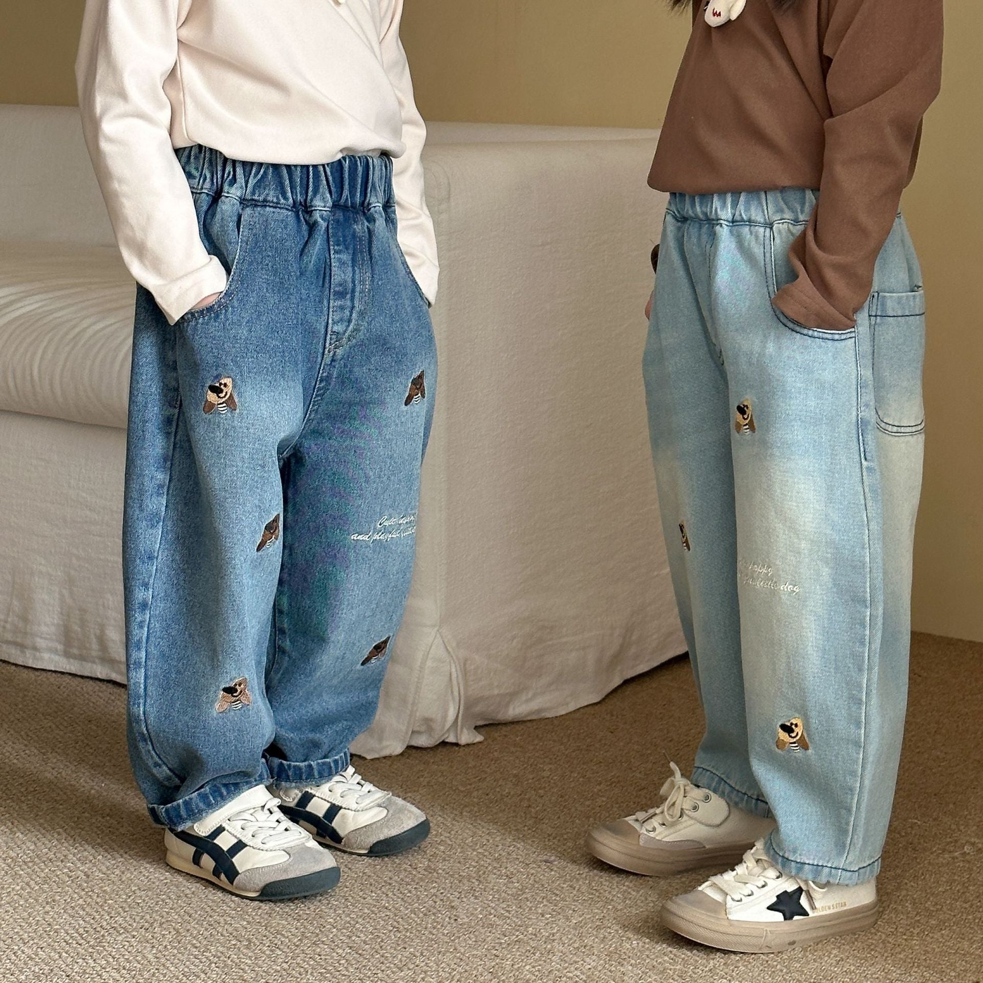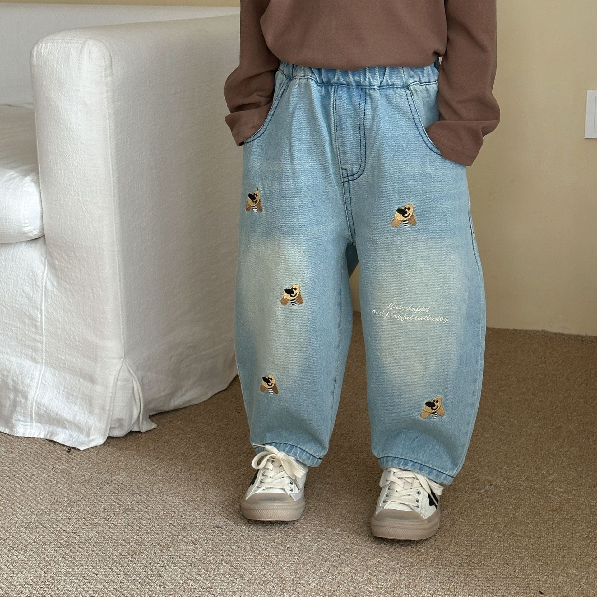 DK250689PA-秋冬季韓版抓絨狗狗刺繡牛仔長褲