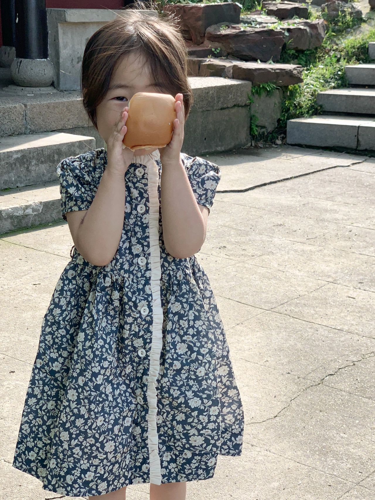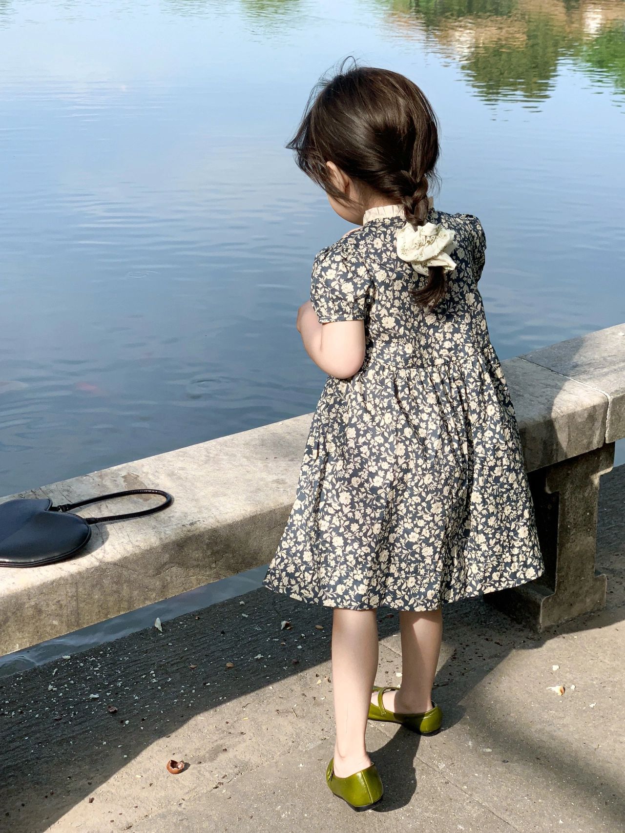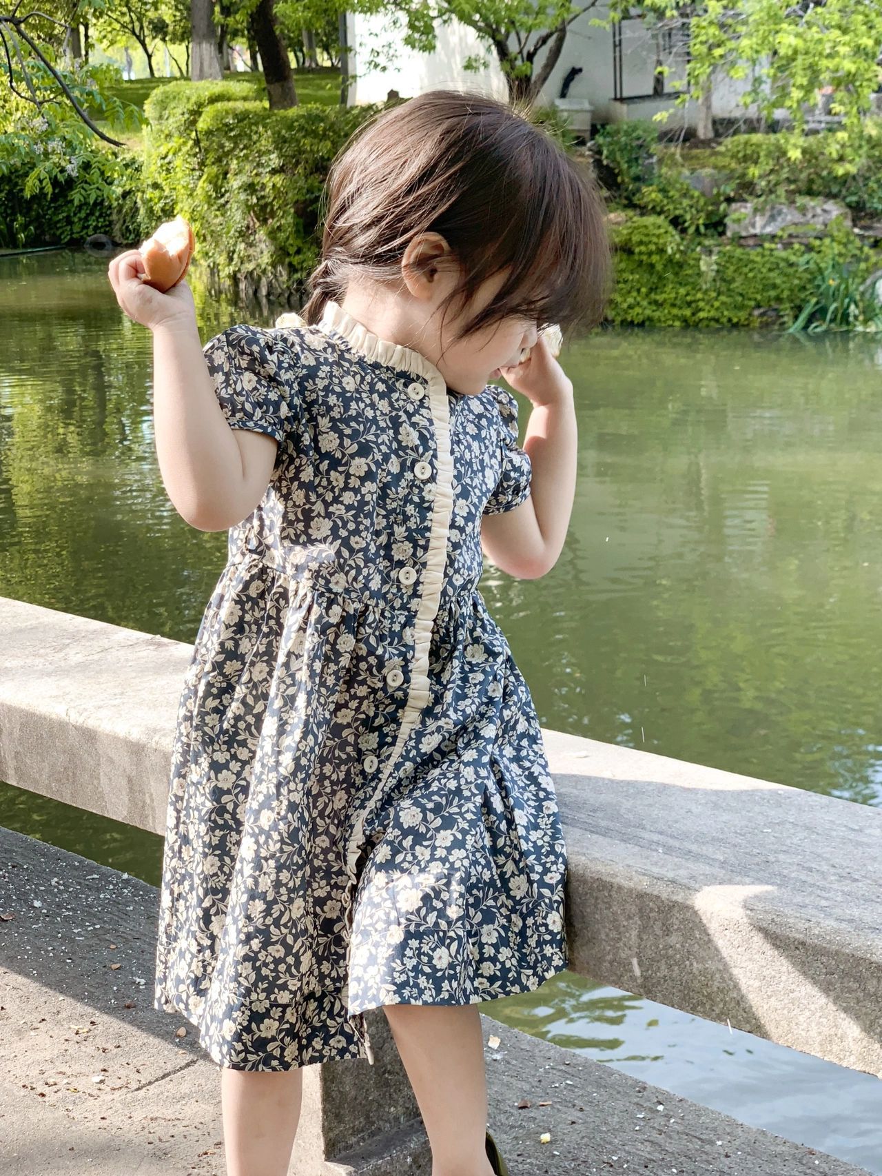 J23065DS-Summer Retro Floral Puff Sleeve Art Lace-up Dress