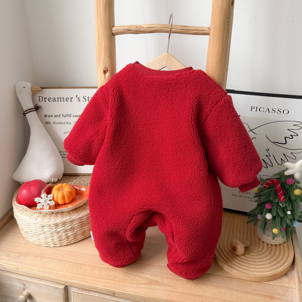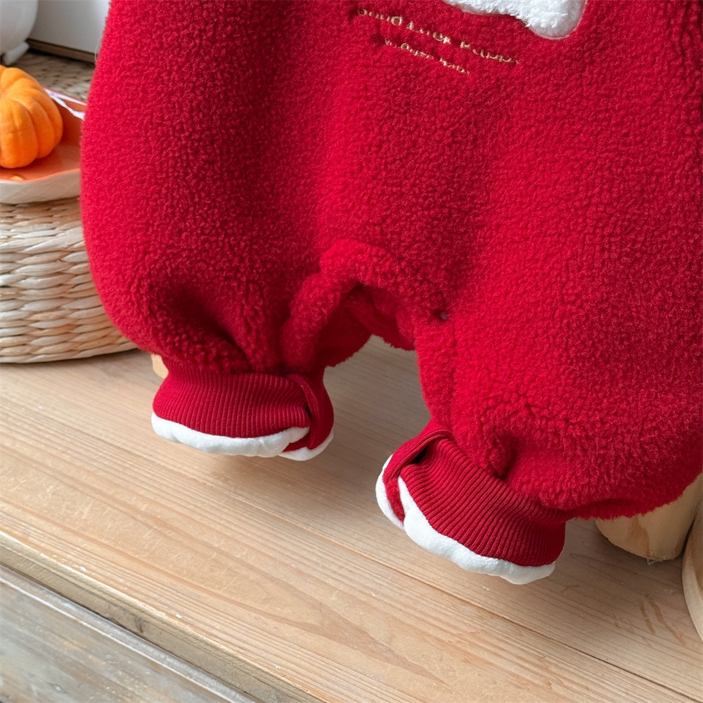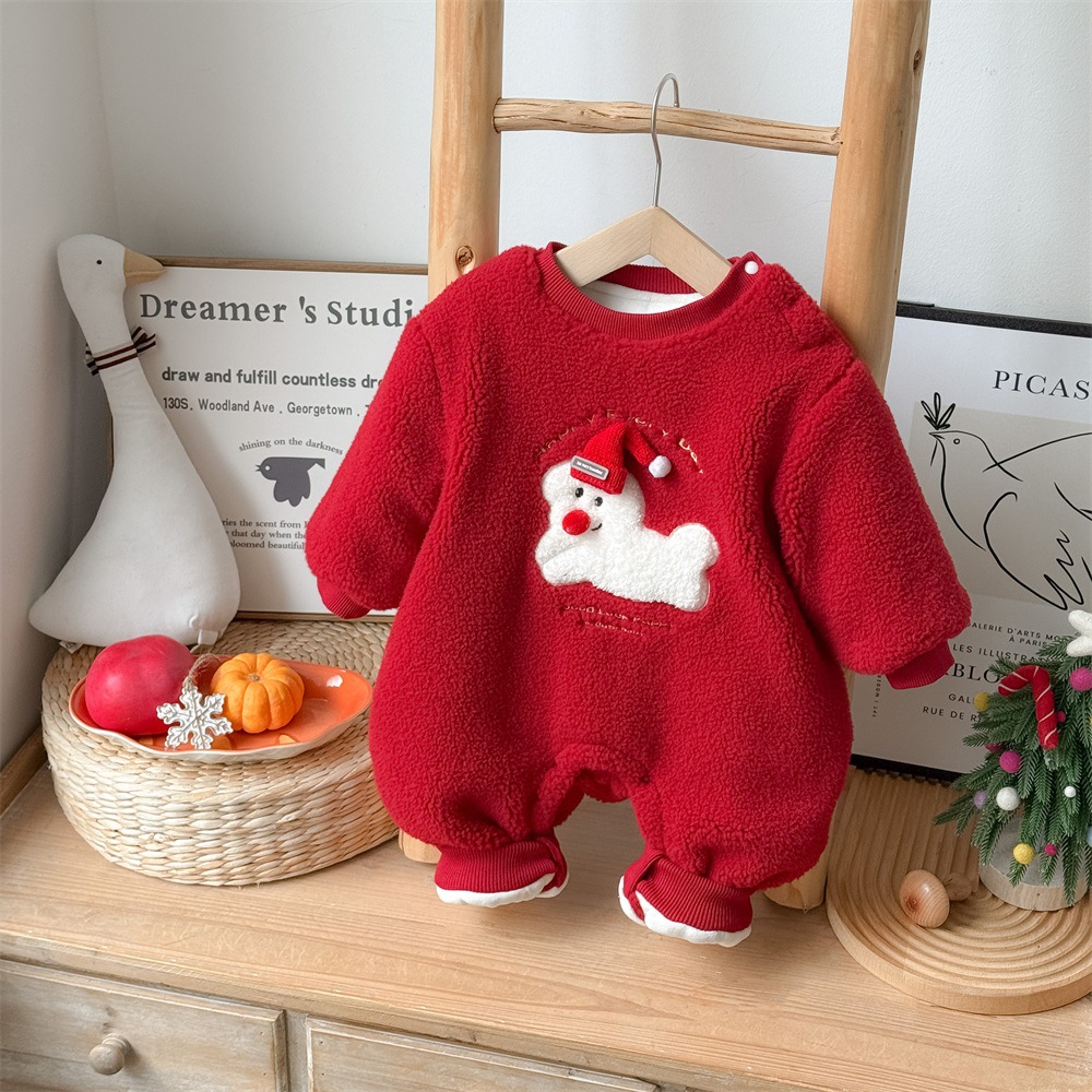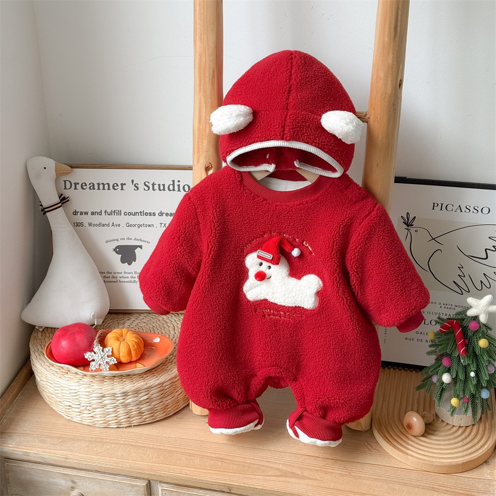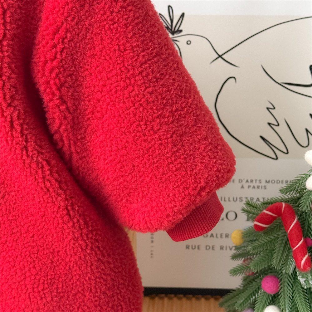M2459091LS-Winter Red Nose Puppy Thick Plush New Year Greetings Climbing Suit + Hat