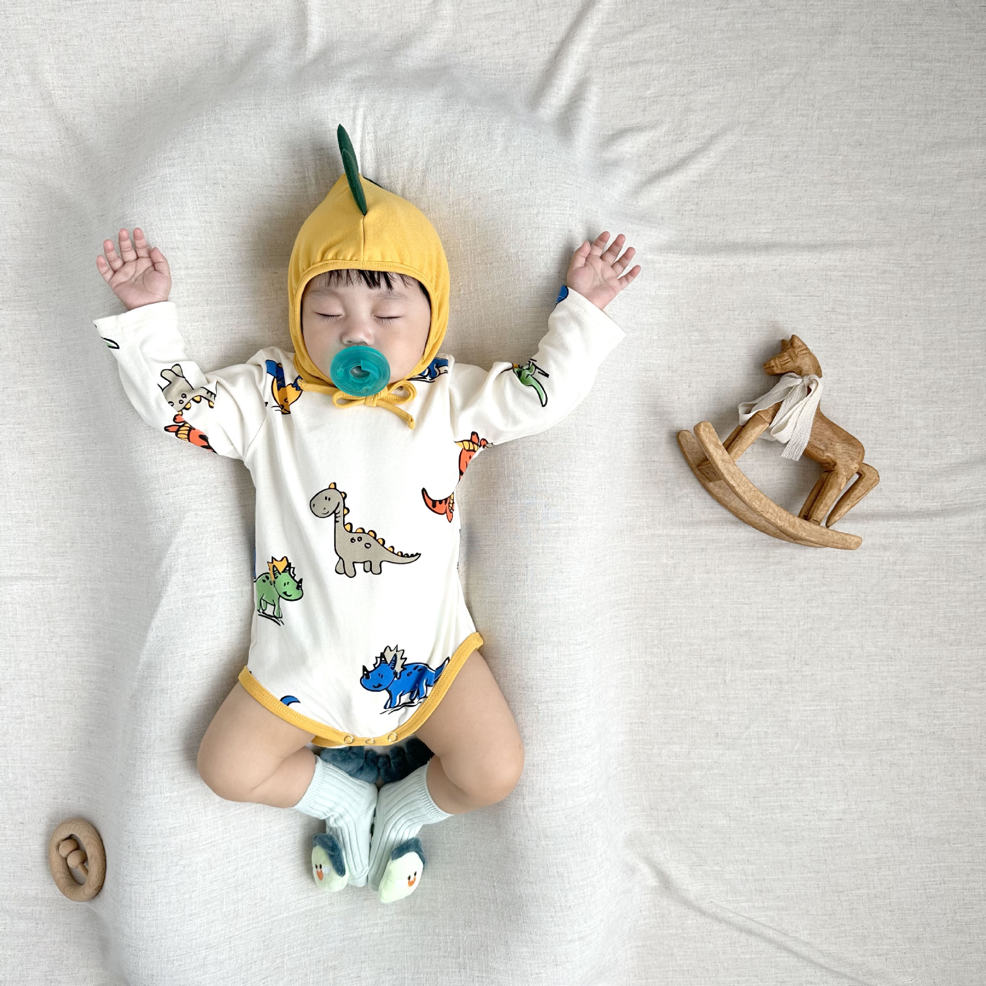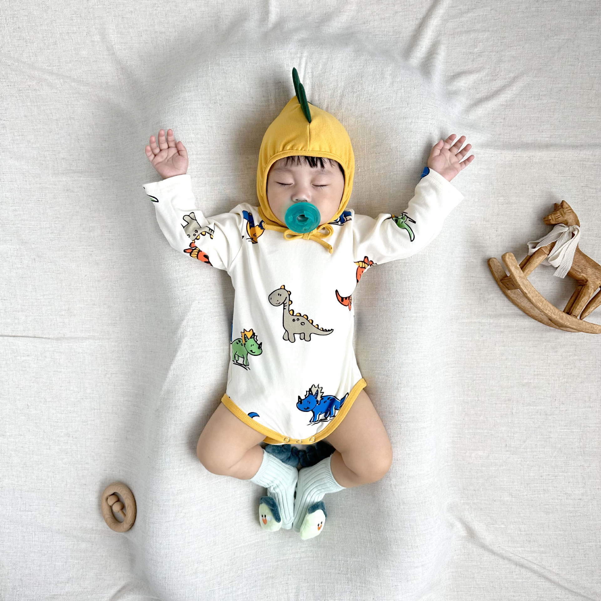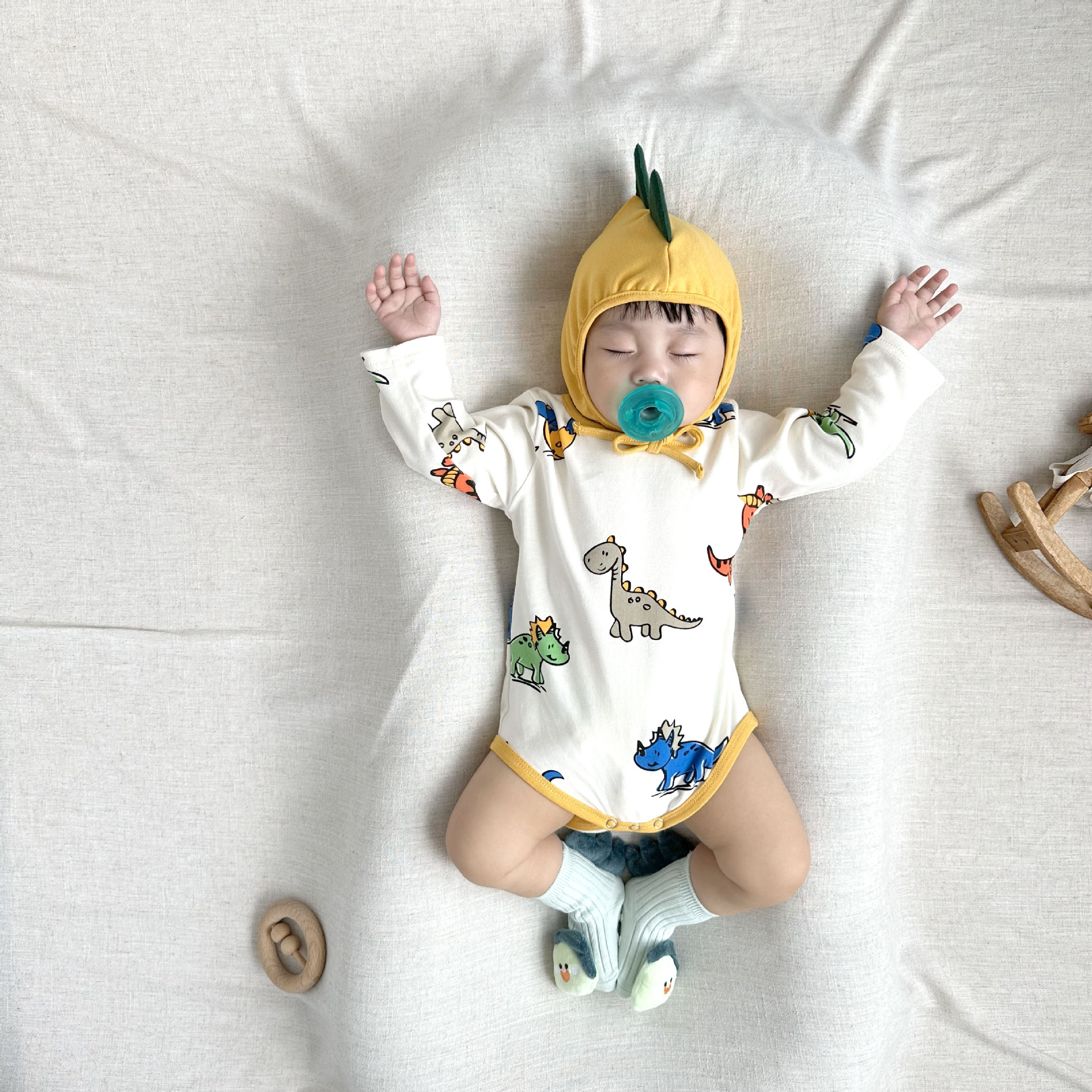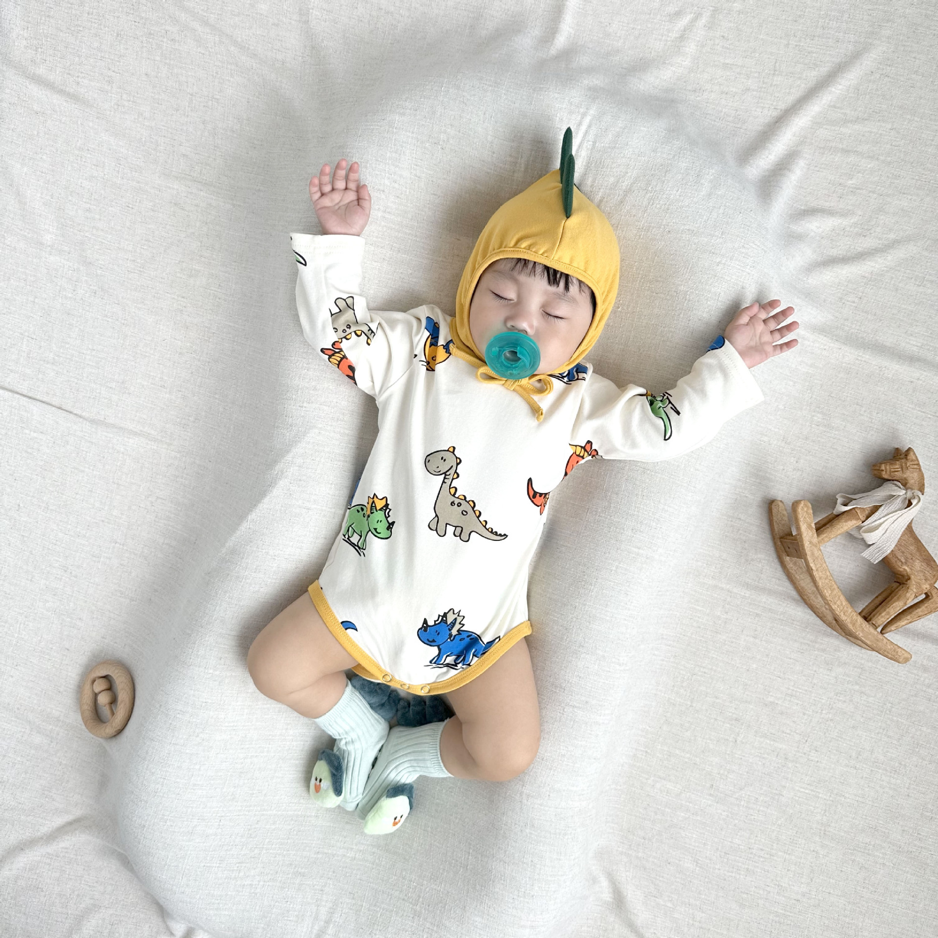 081507LS-寶寶長袖恐龍滿印嬰兒包屁衣+帽子