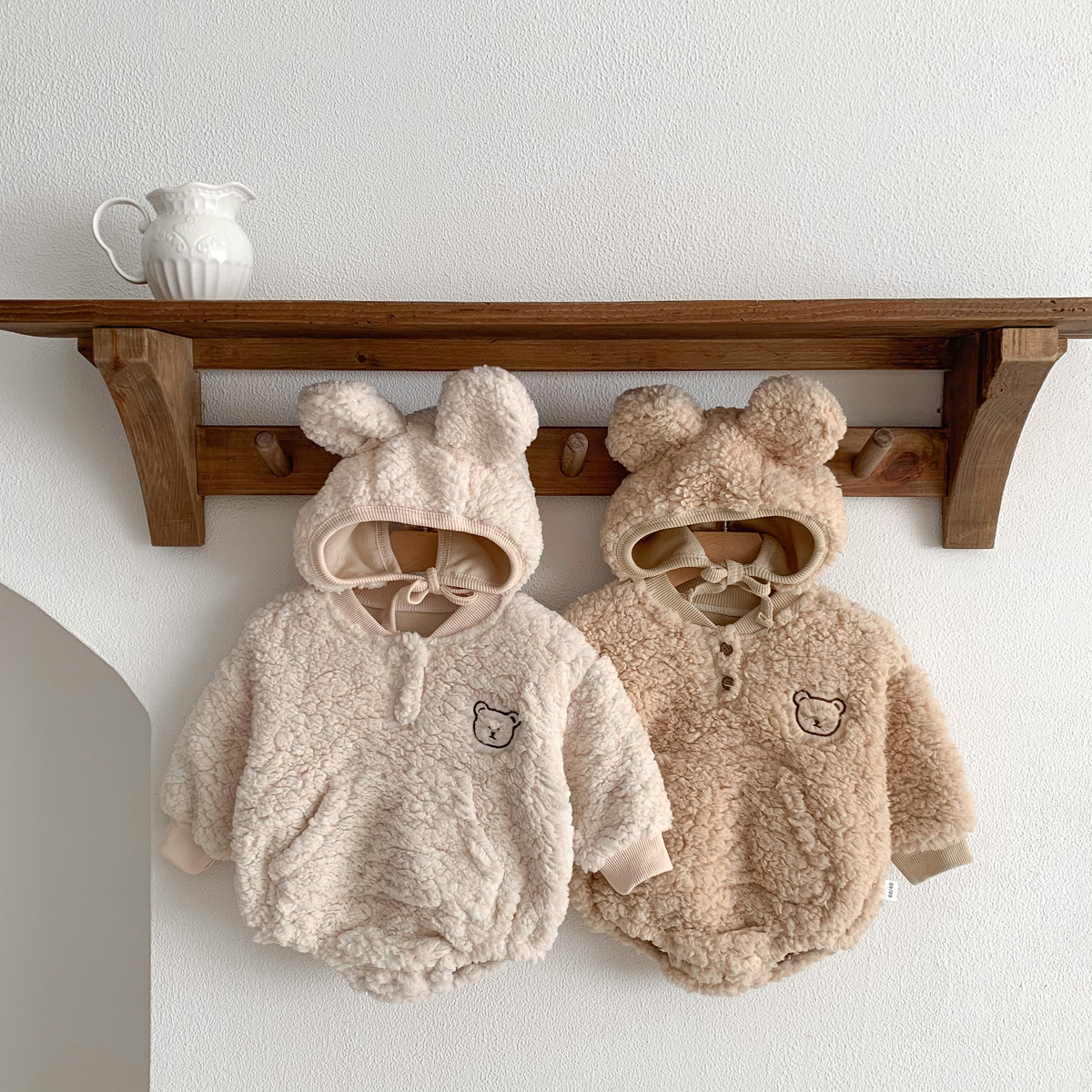 103371LS-秋冬可愛小熊嬰兒保暖雙面絨連帽包屁衣