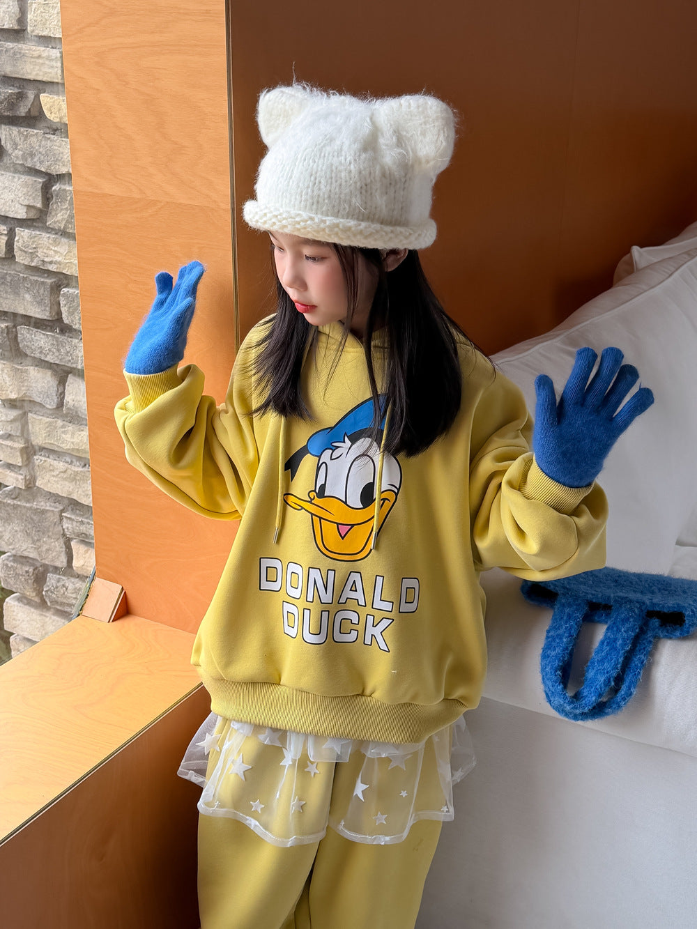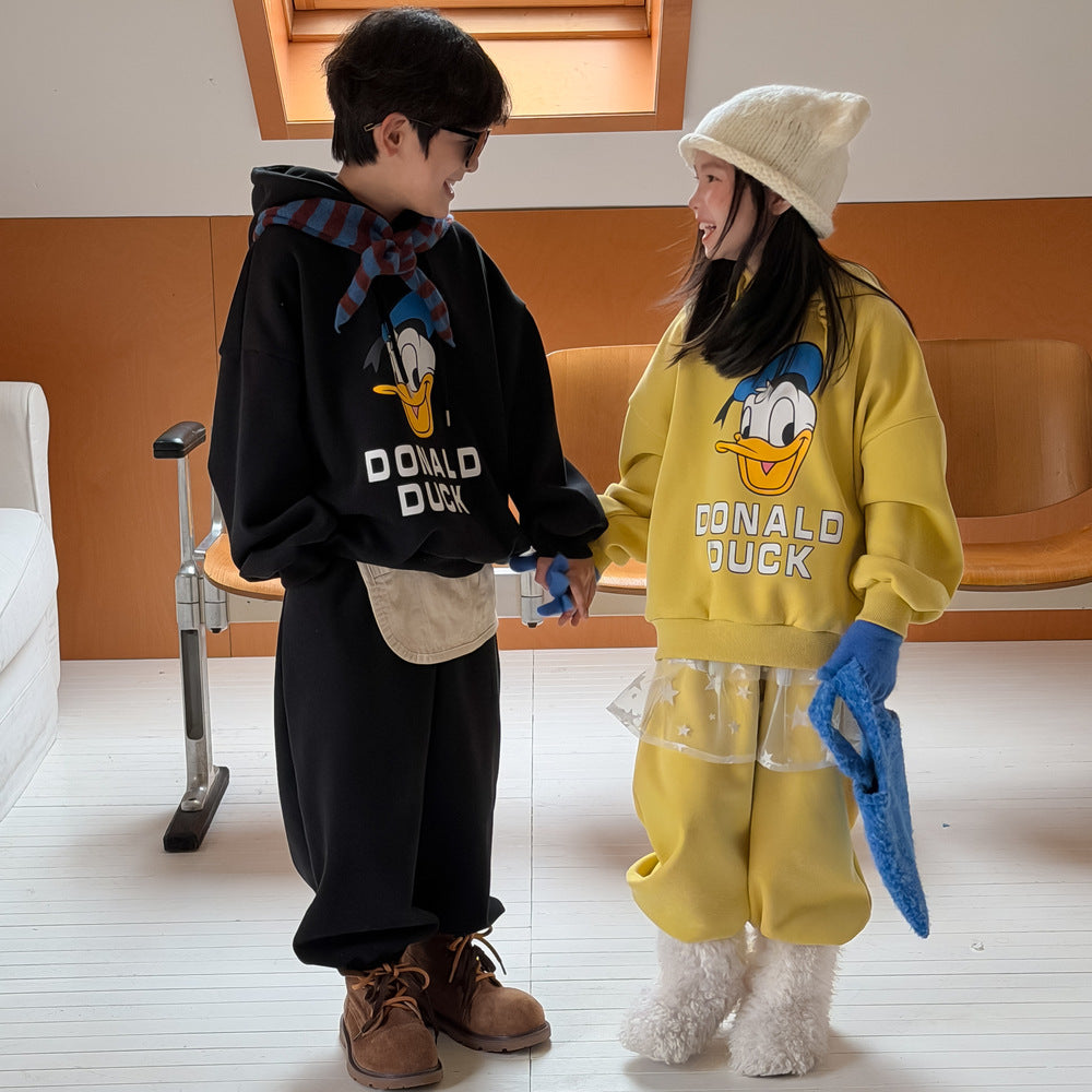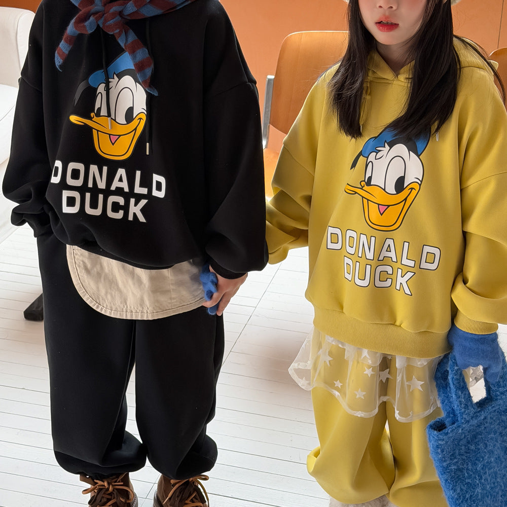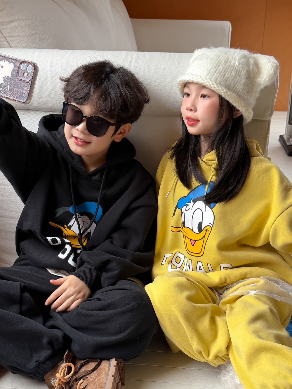 2025D184TG-冬季韓版卡通鴨印花連帽加絨兩件套