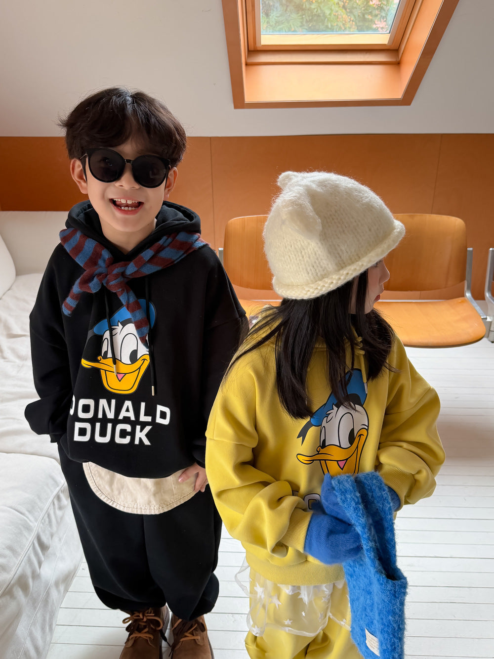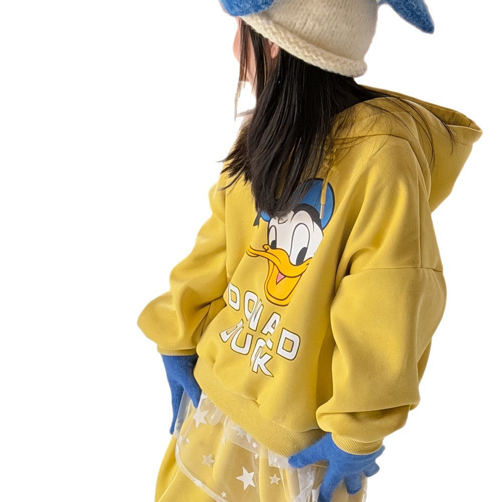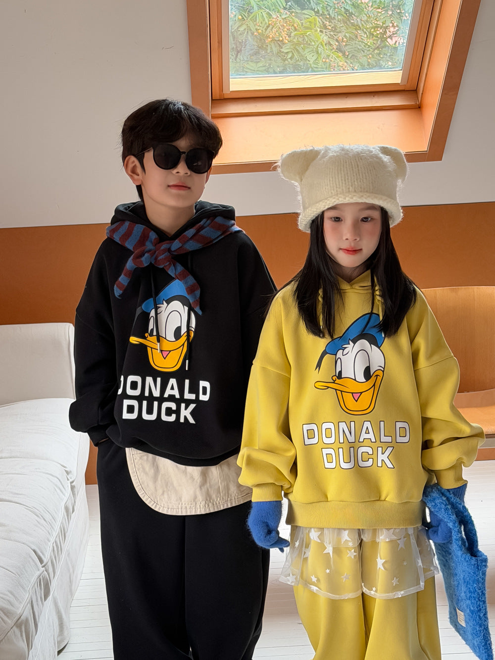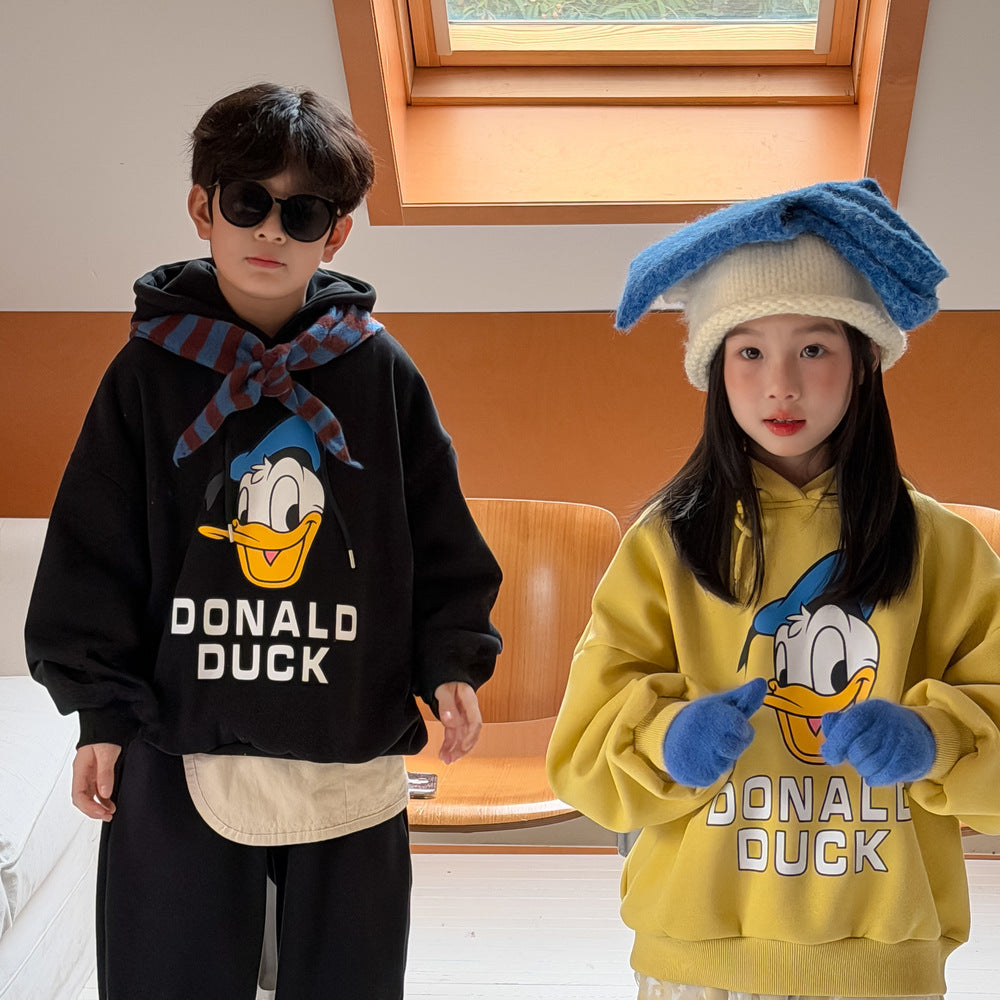 2025D184TG-冬季韓版卡通鴨印花連帽加絨兩件套