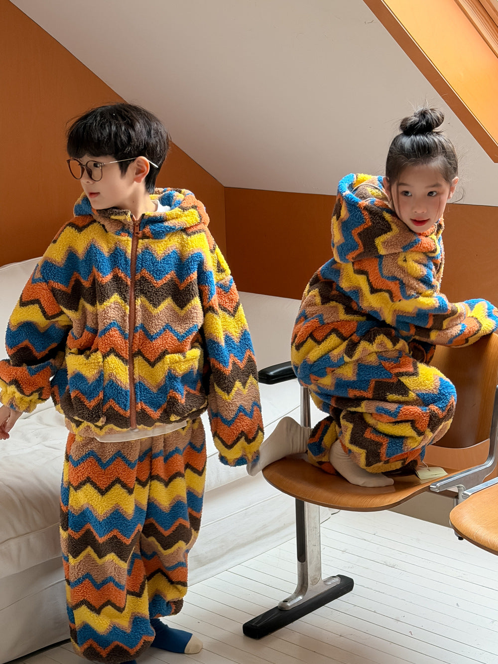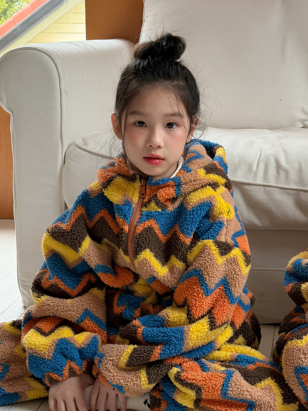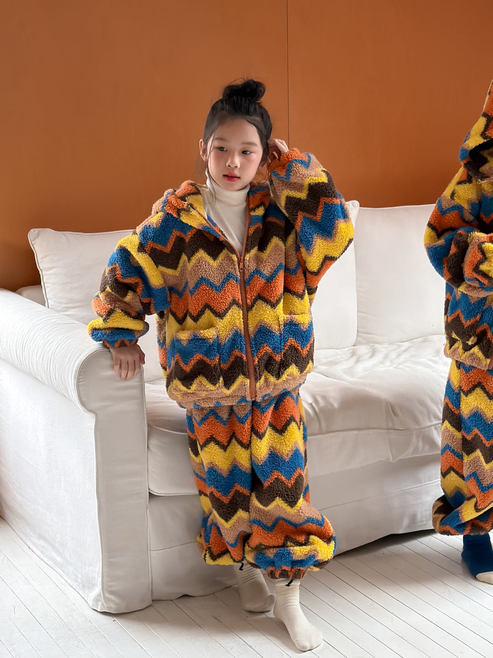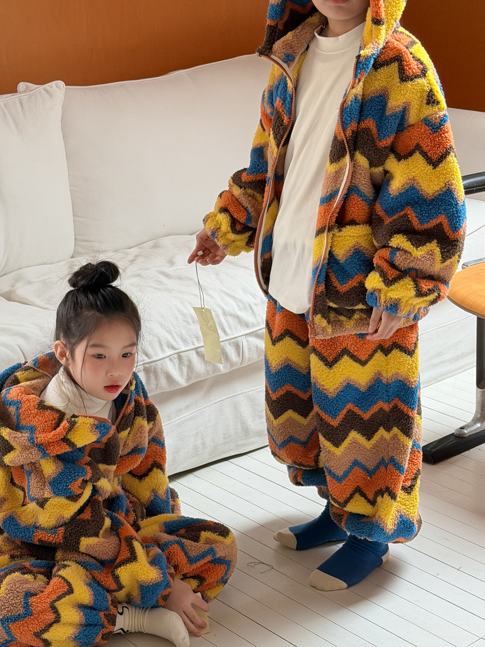 2025D198TG-冬季韓版彩條連帽拉鍊可愛居家兩件套