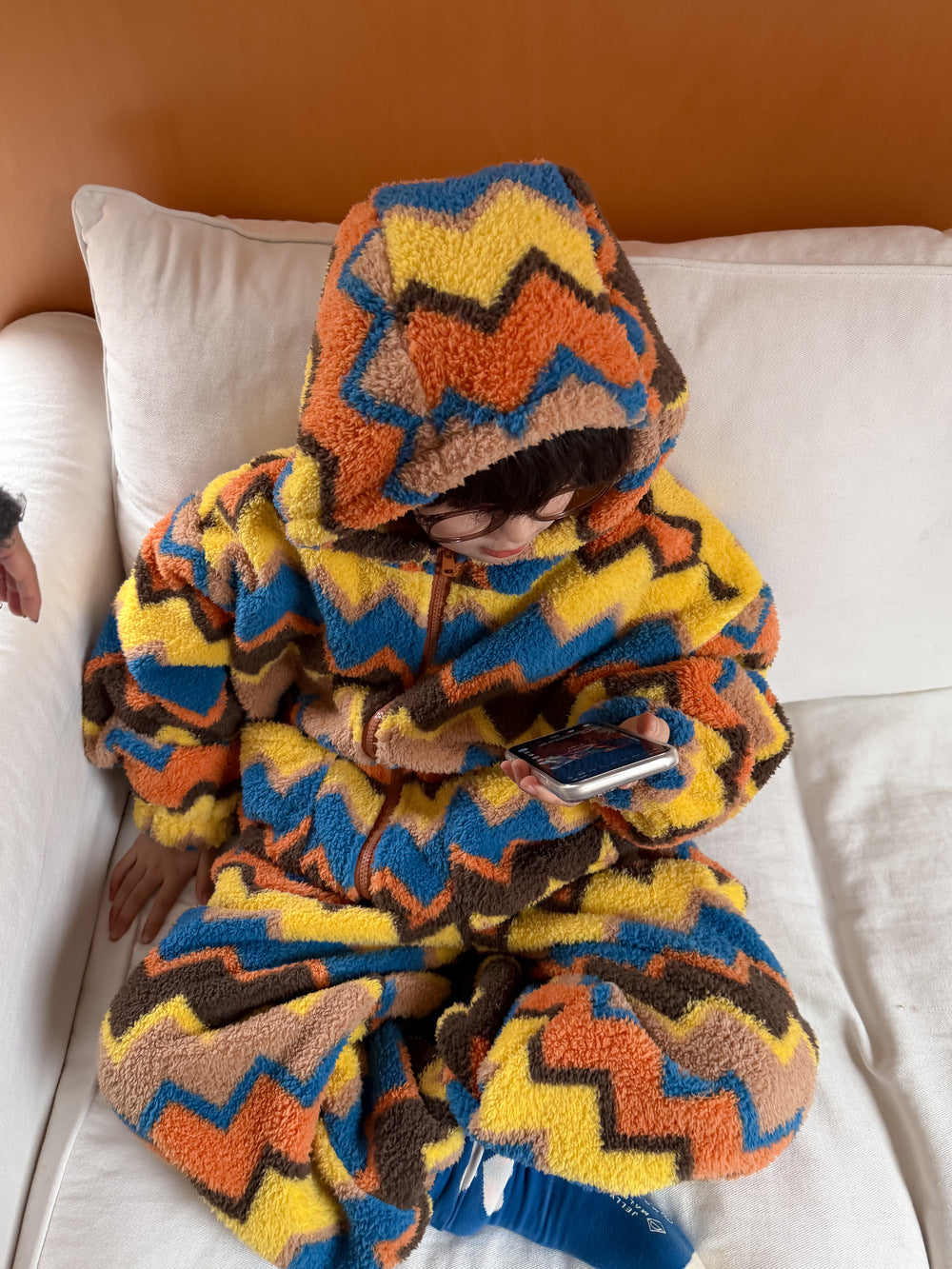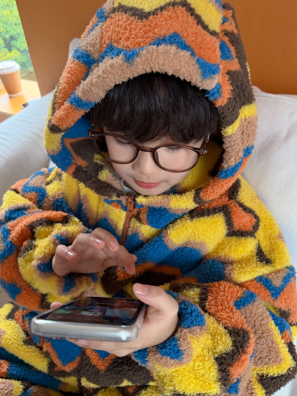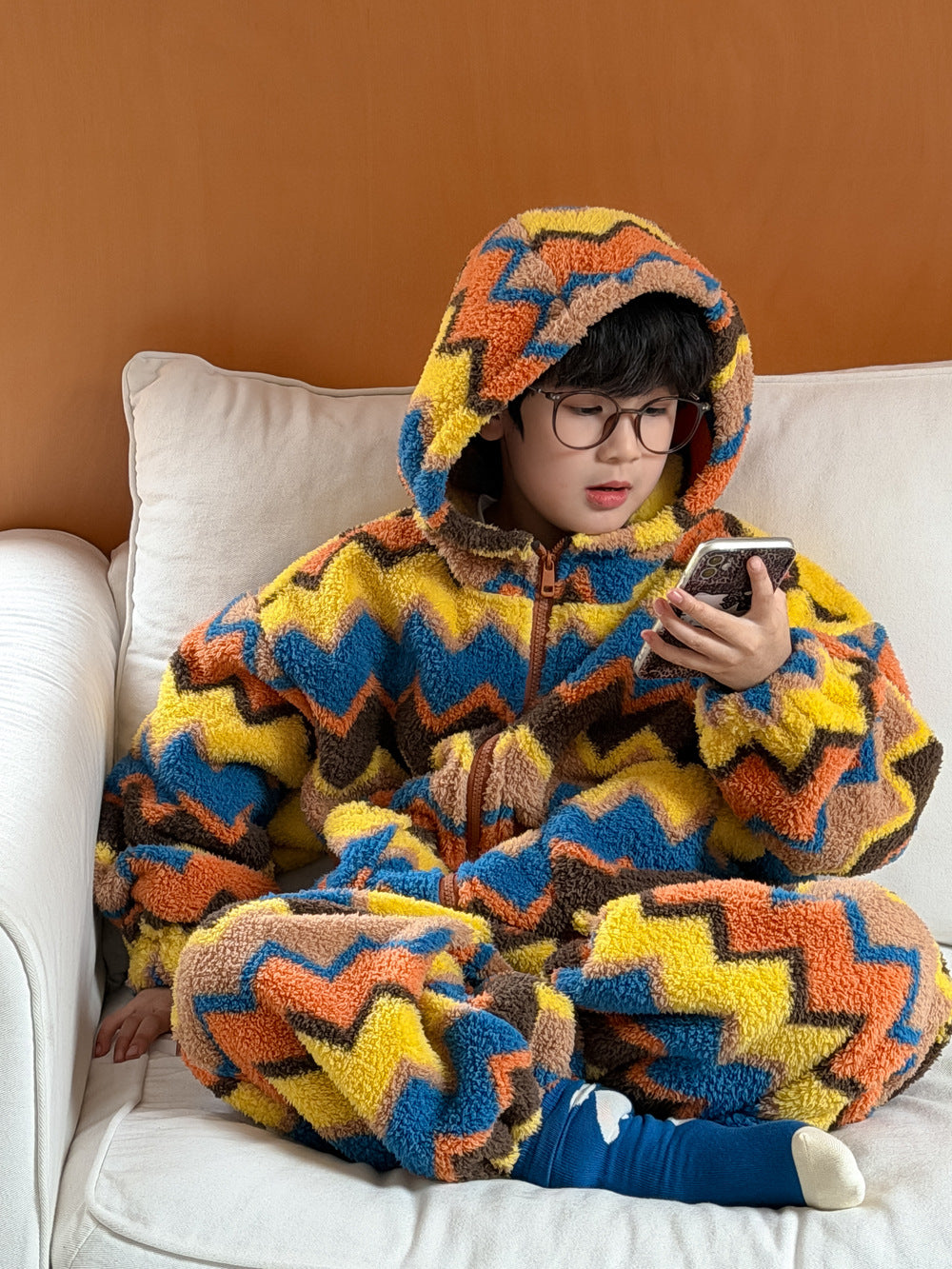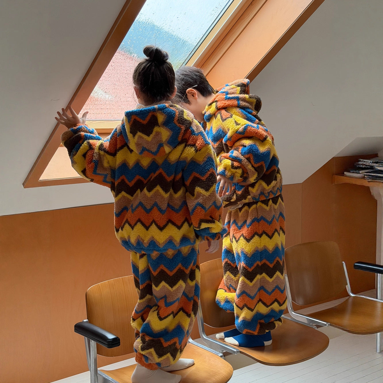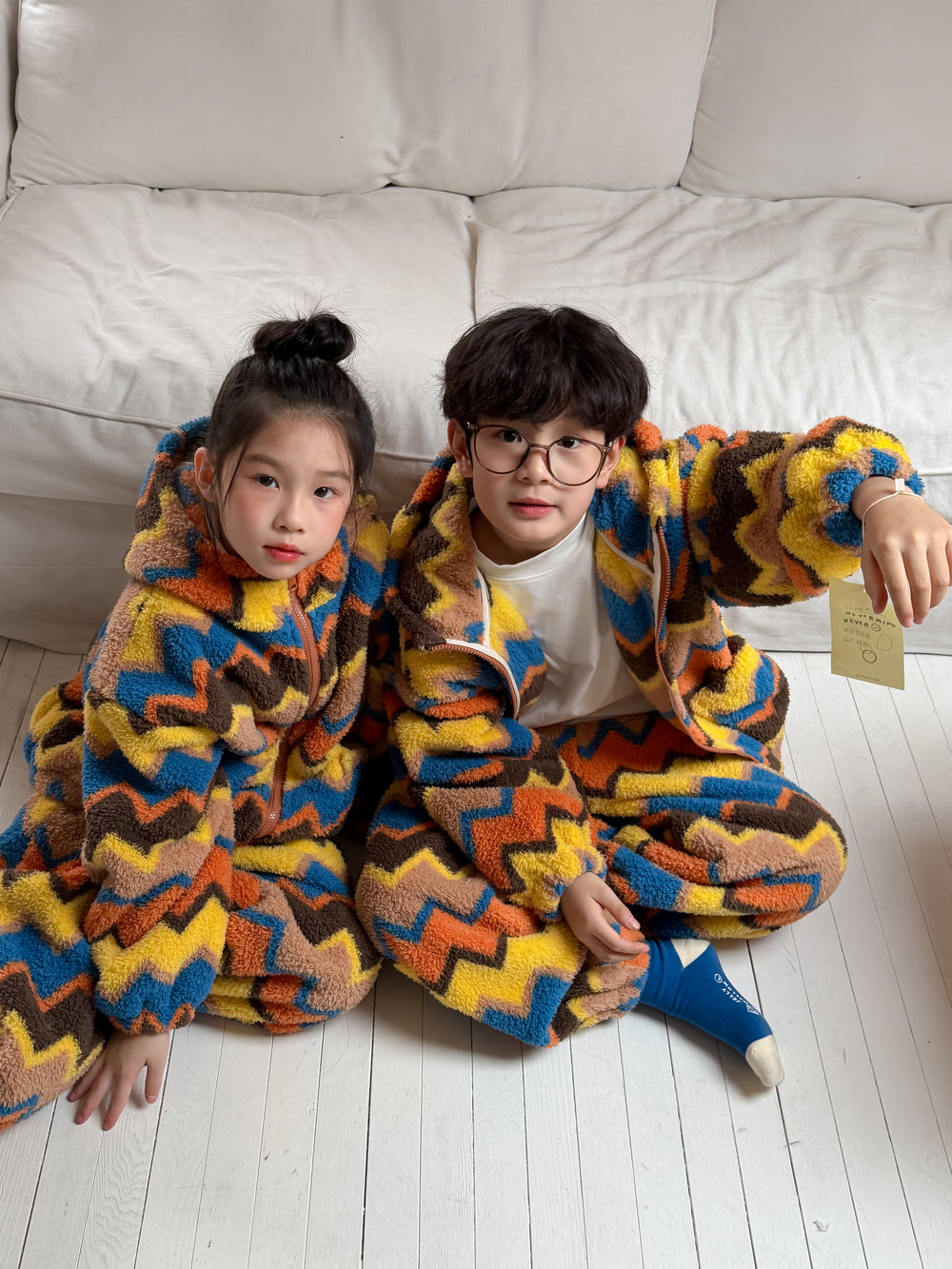 2025D198TG-冬季韓版彩條連帽拉鍊可愛居家兩件套