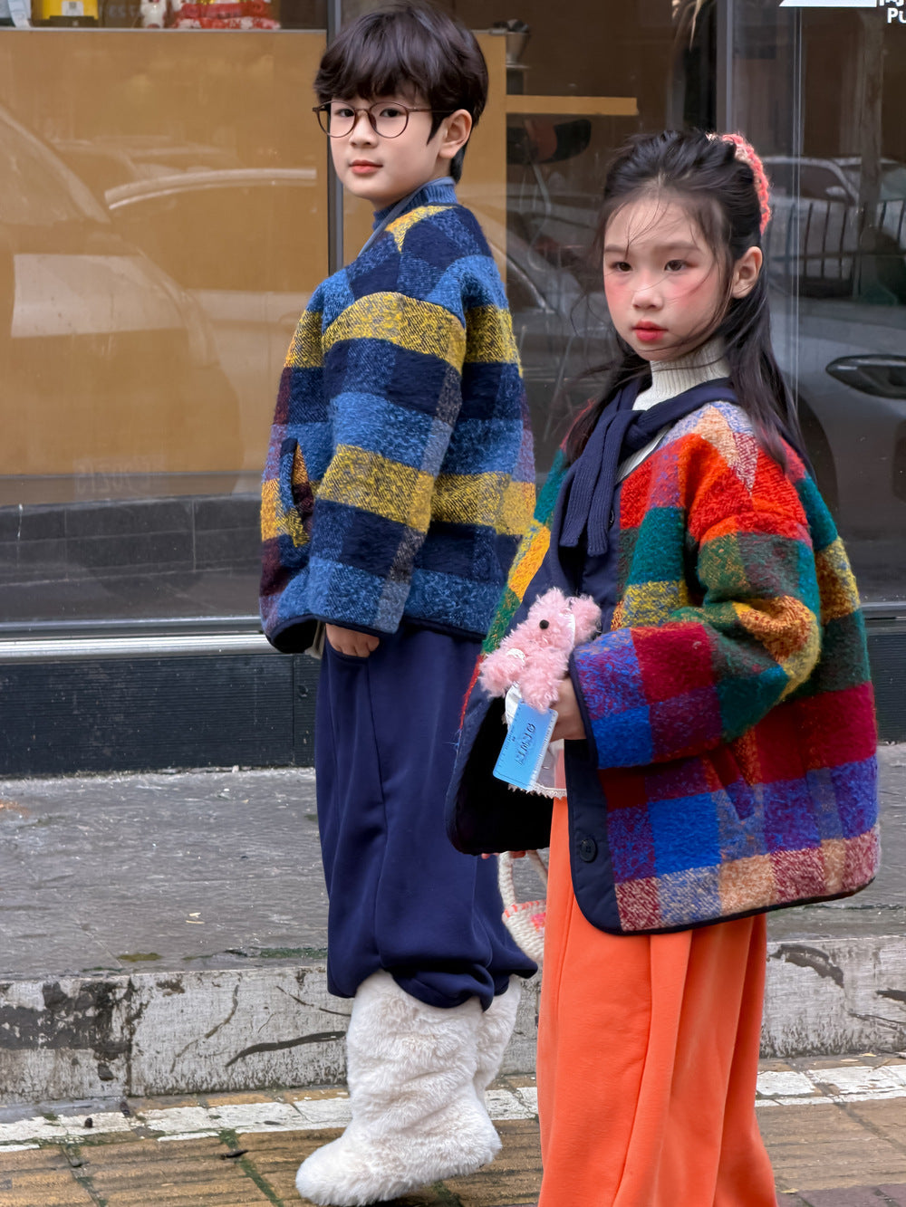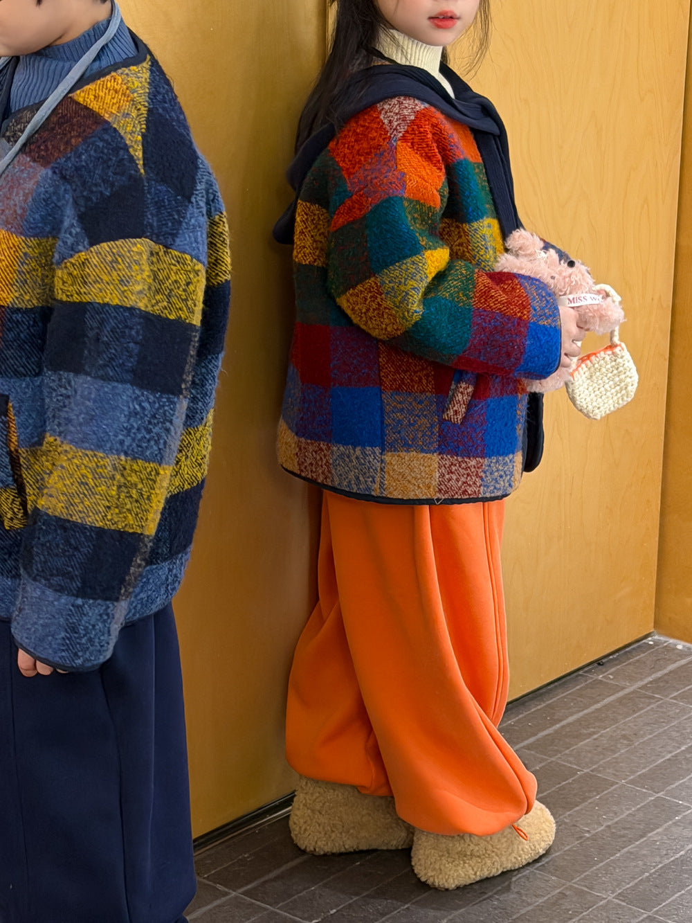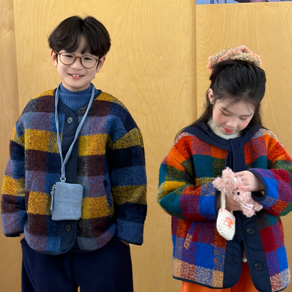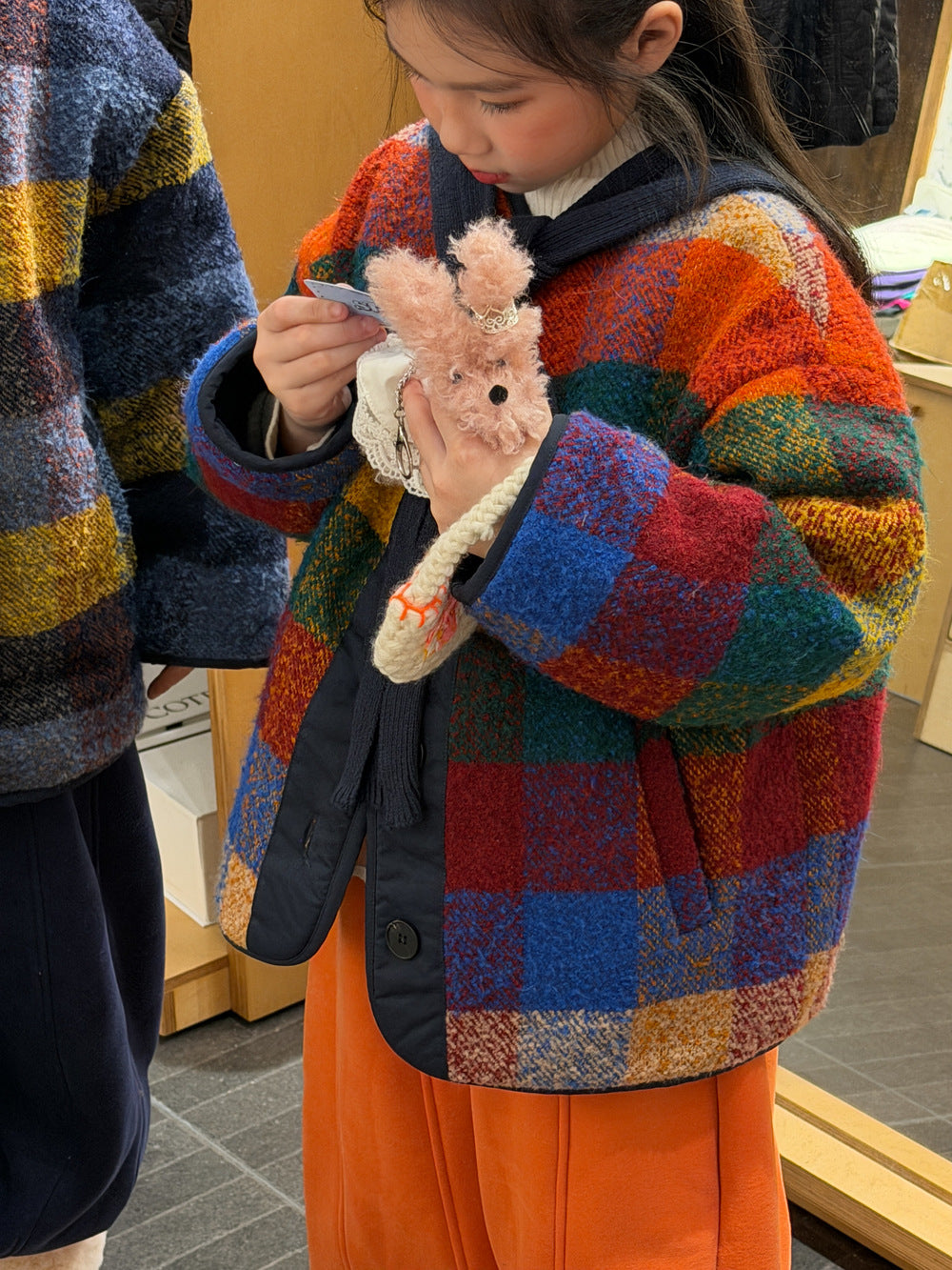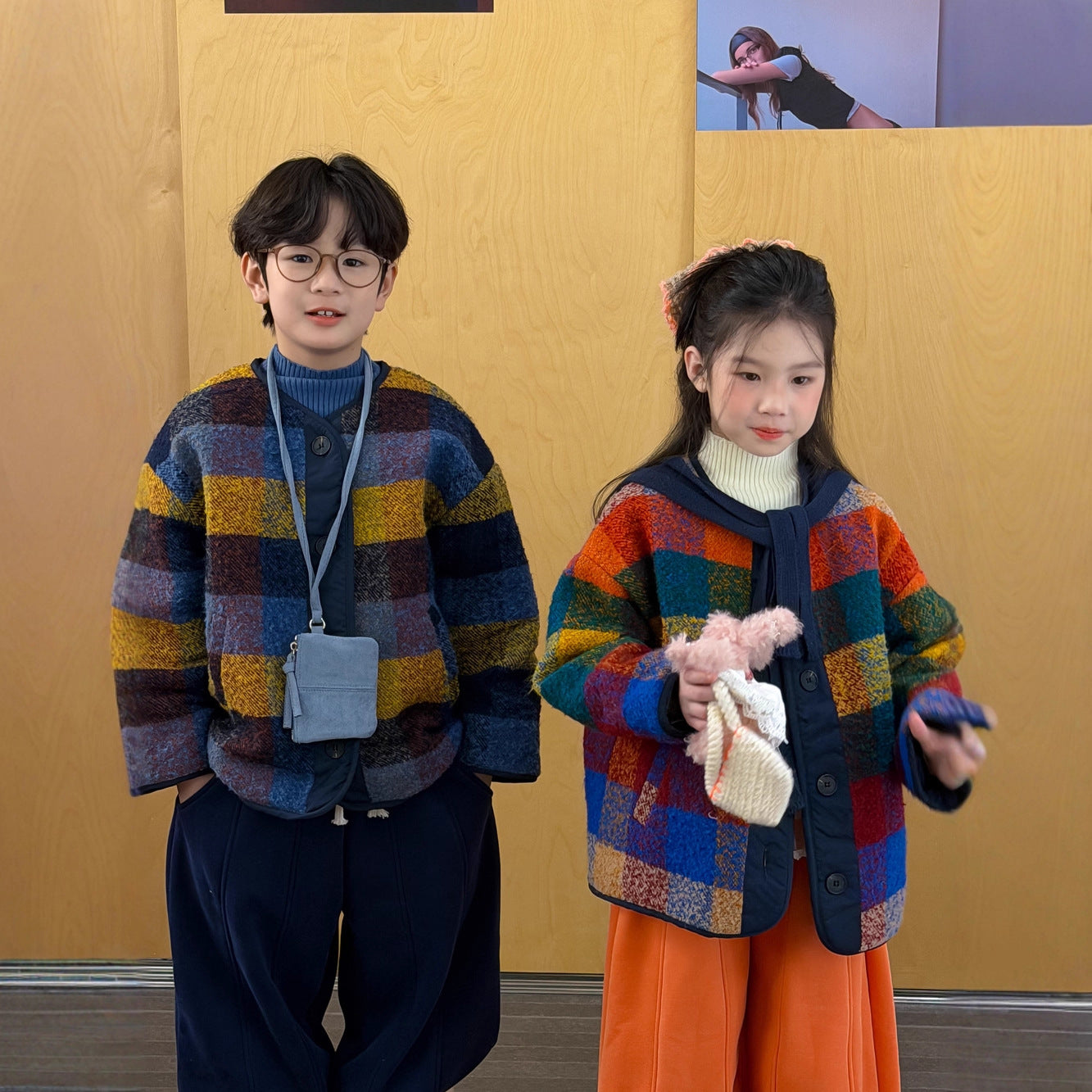 2025D204SE-冬季韓版拼色格子加厚開襟排釦外套