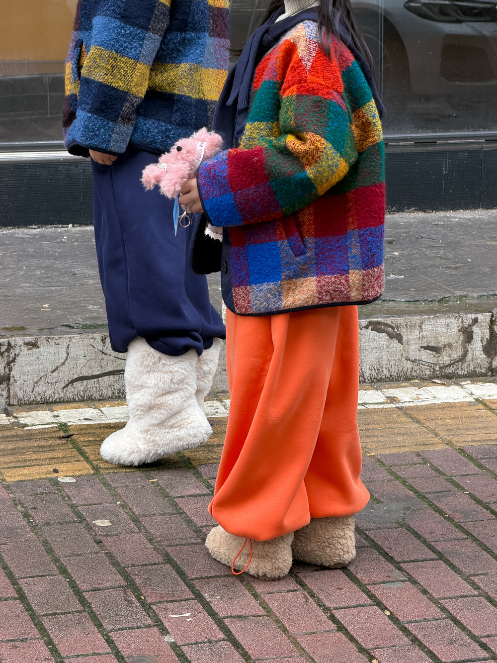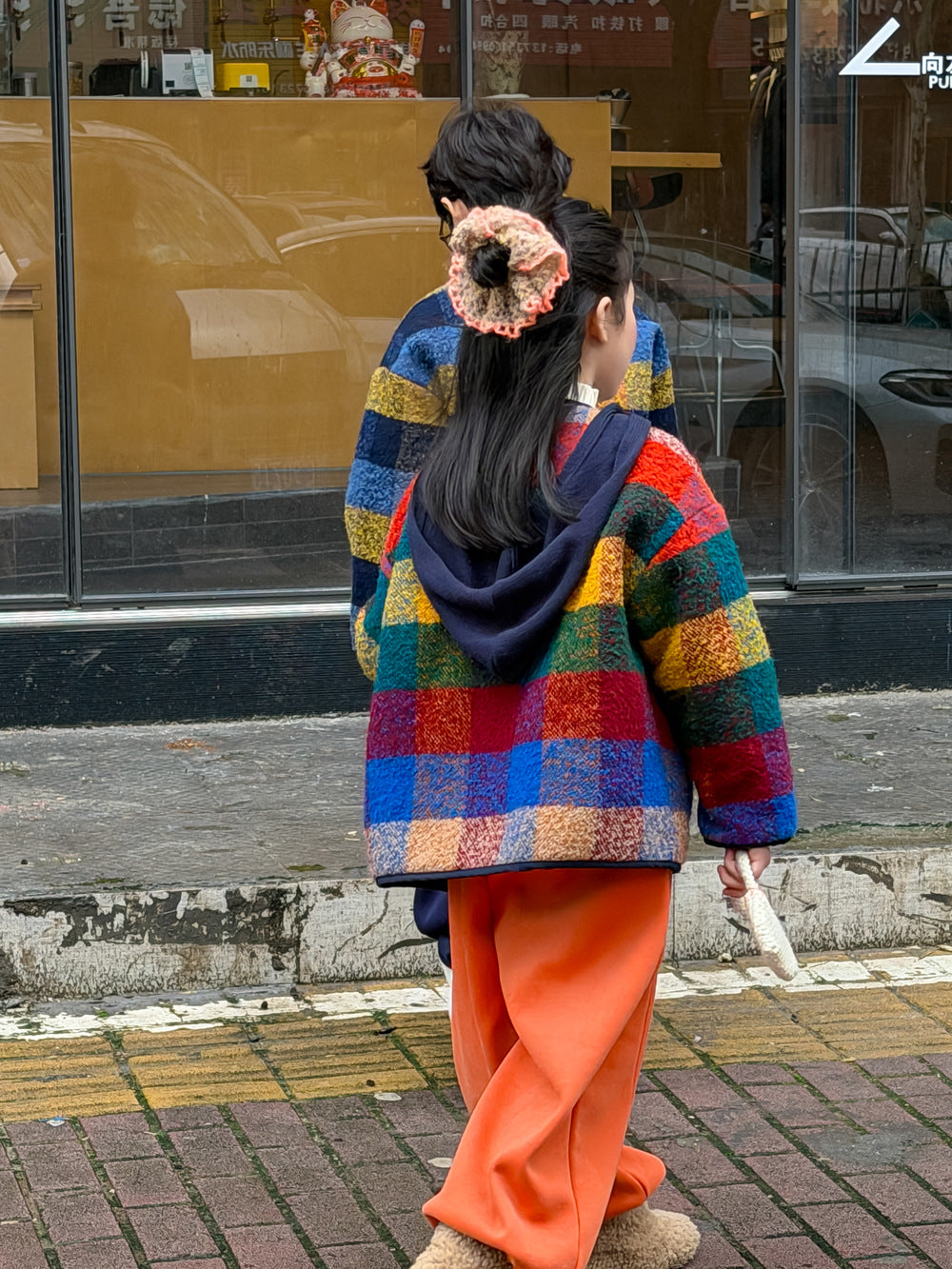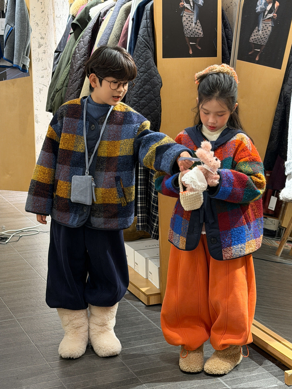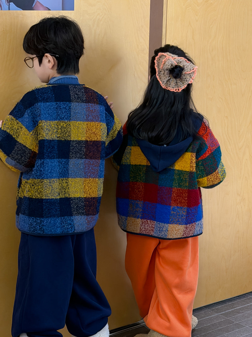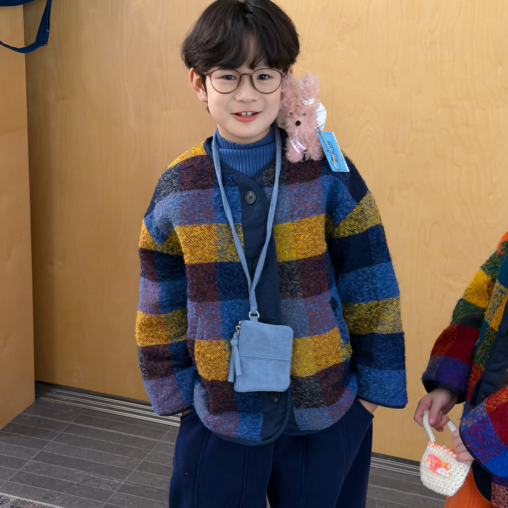 2025D204SE-冬季韓版拼色格子加厚開襟排釦外套