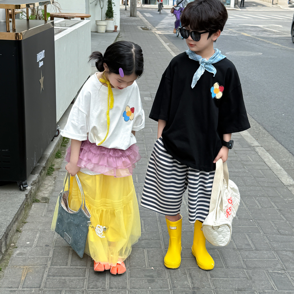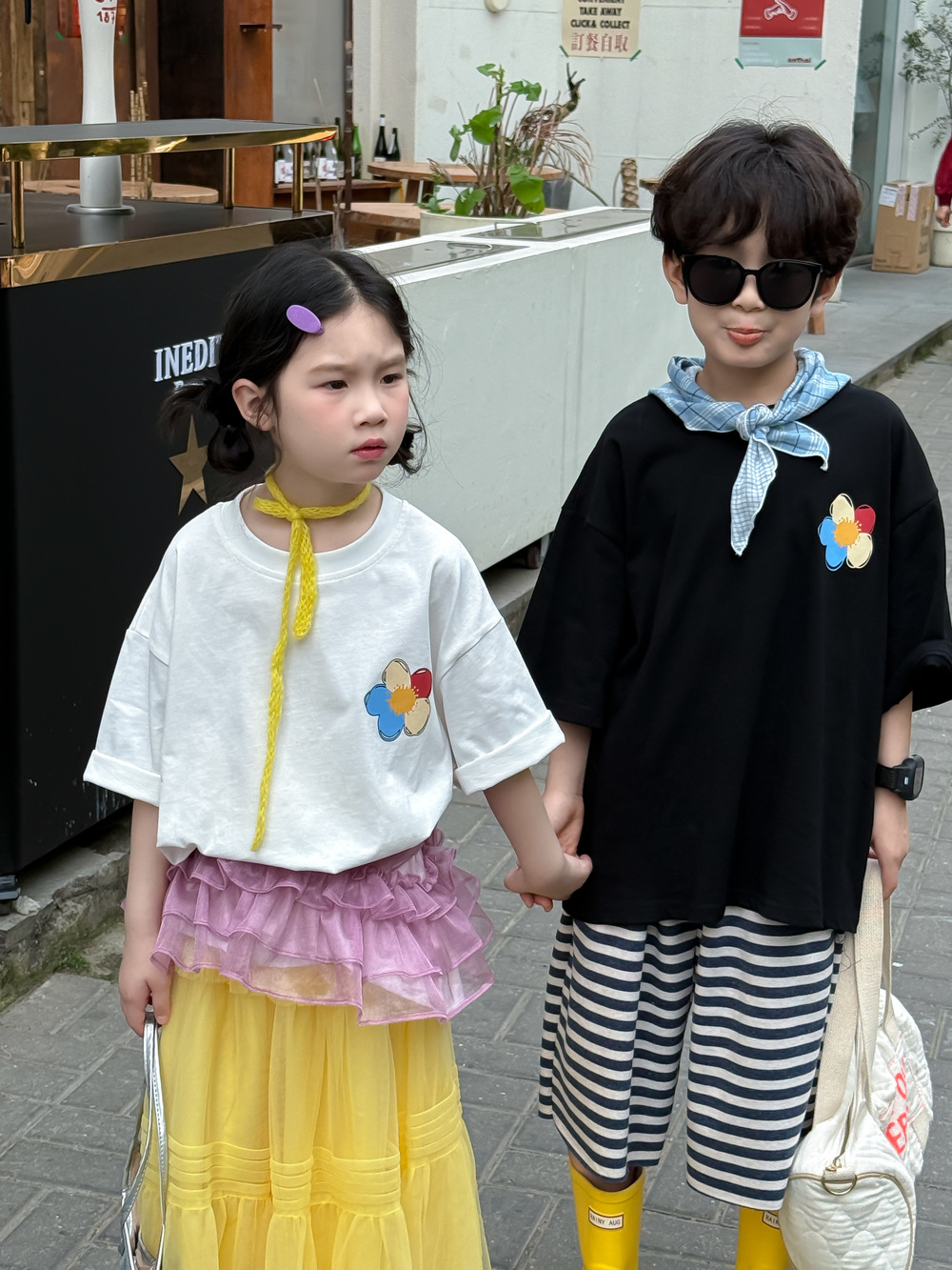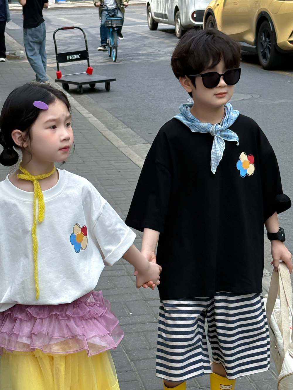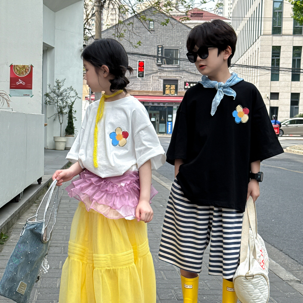 2025X112SE-夏季男女童韓版太陽花休閒短袖圓領寬鬆上衣