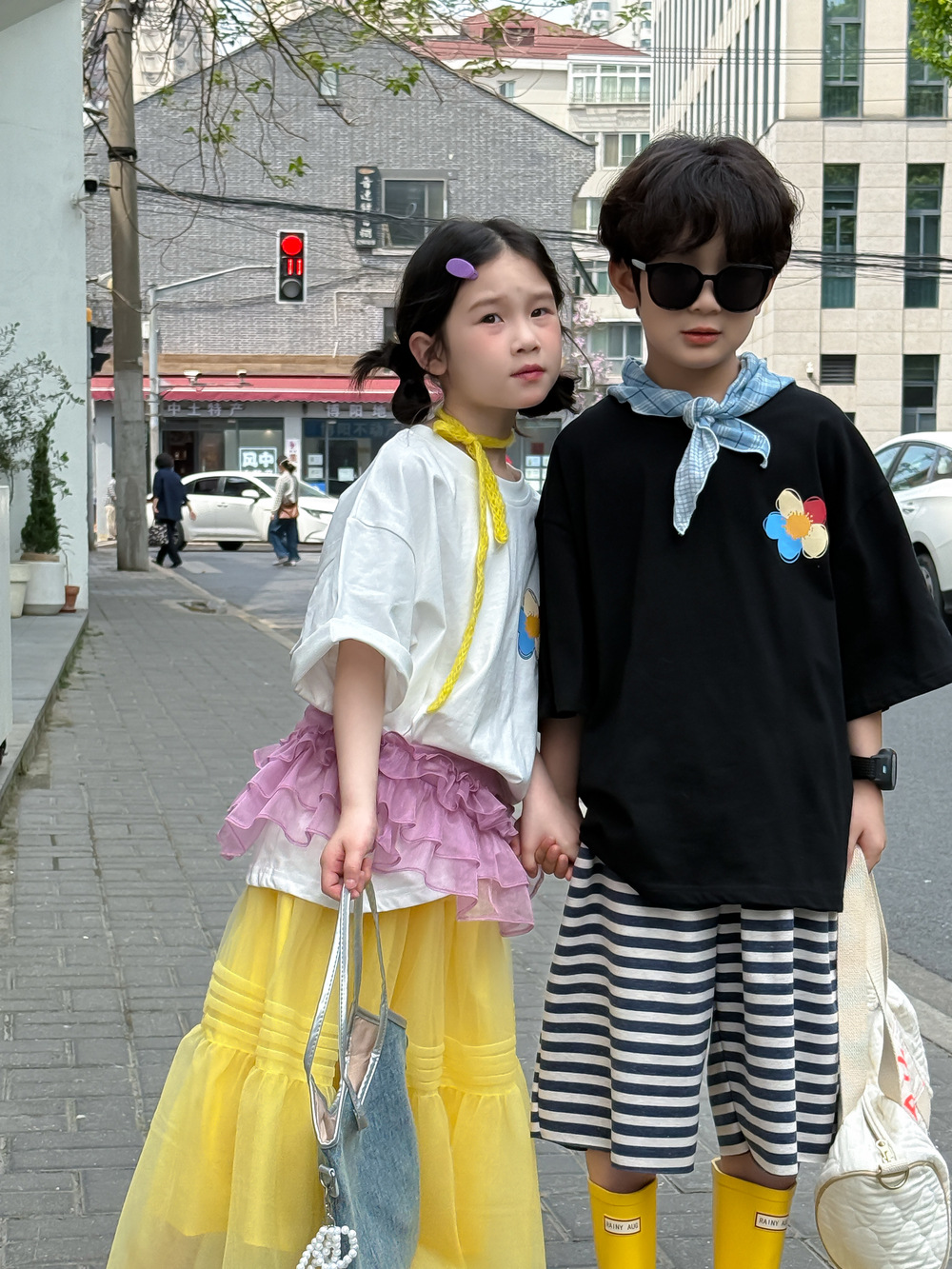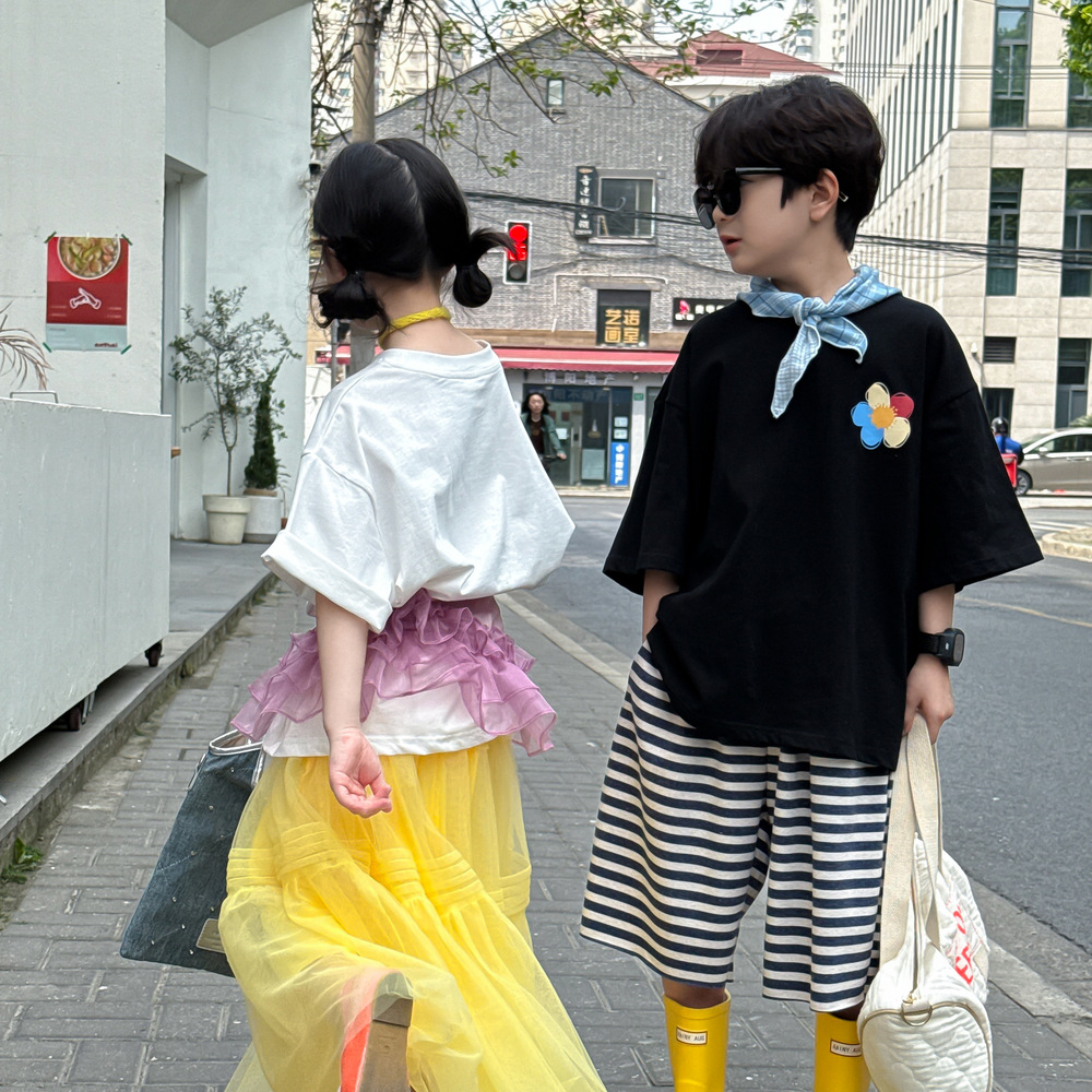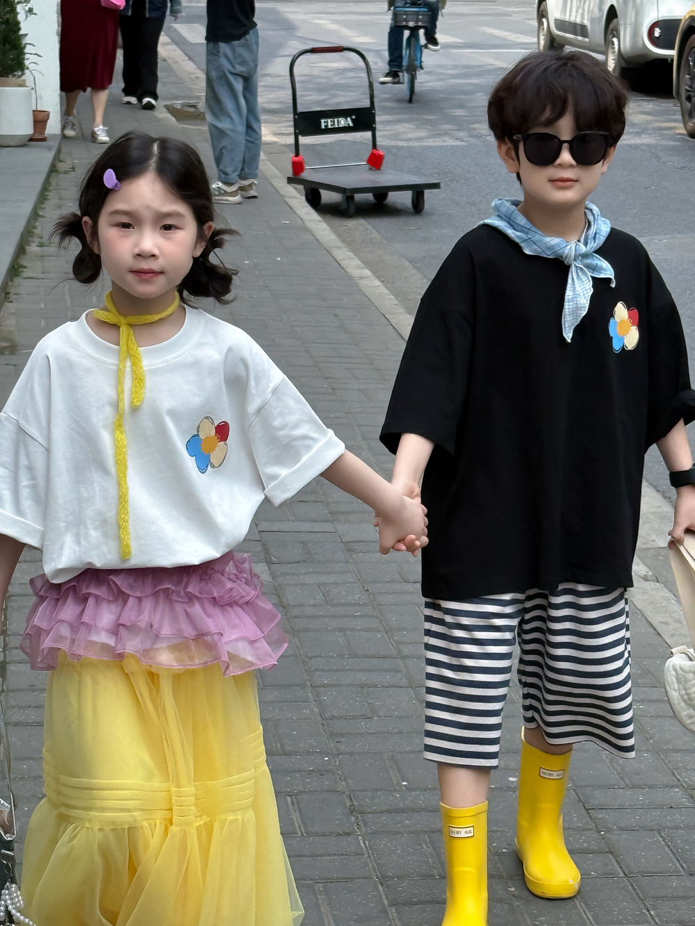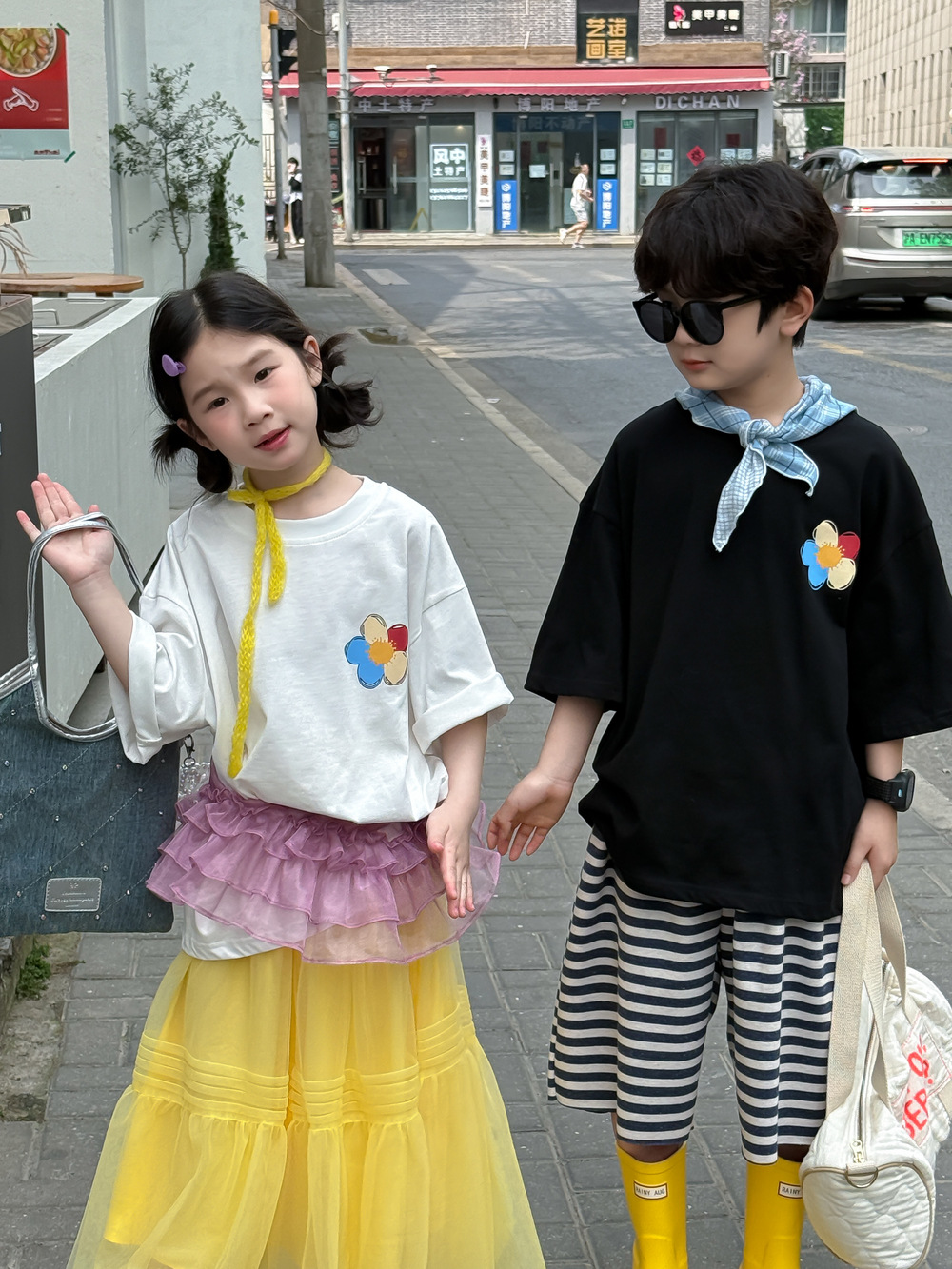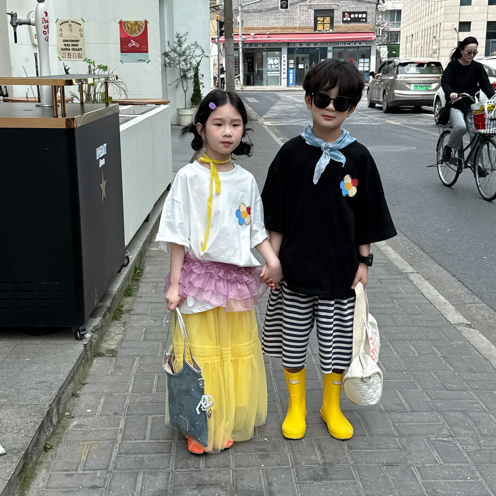 2025X112SE-夏季男女童韓版太陽花休閒短袖圓領寬鬆上衣
