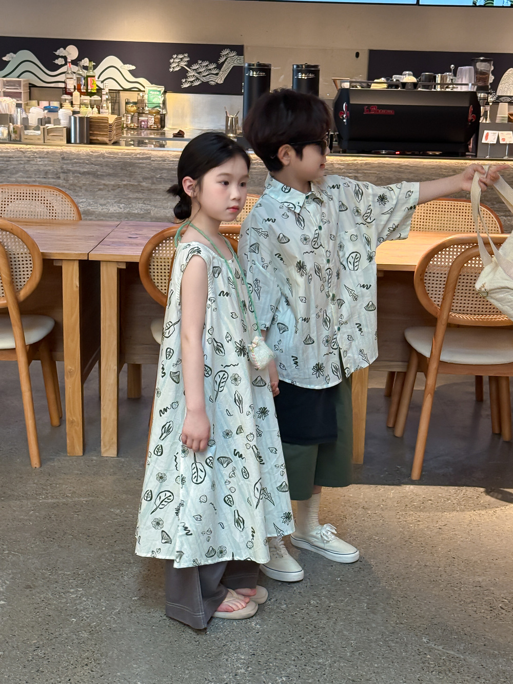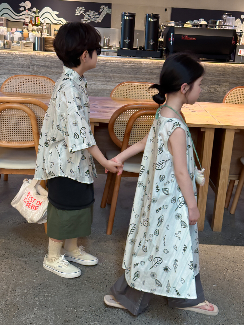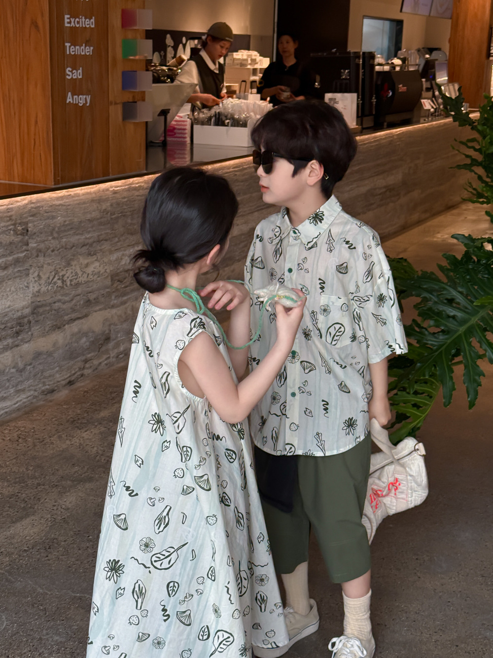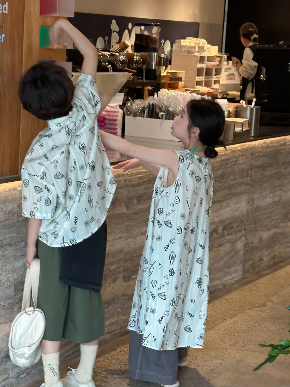2025X123TG-夏季男女童韓版滿印短袖襯衫短褲套裝&休閒背心洋裝