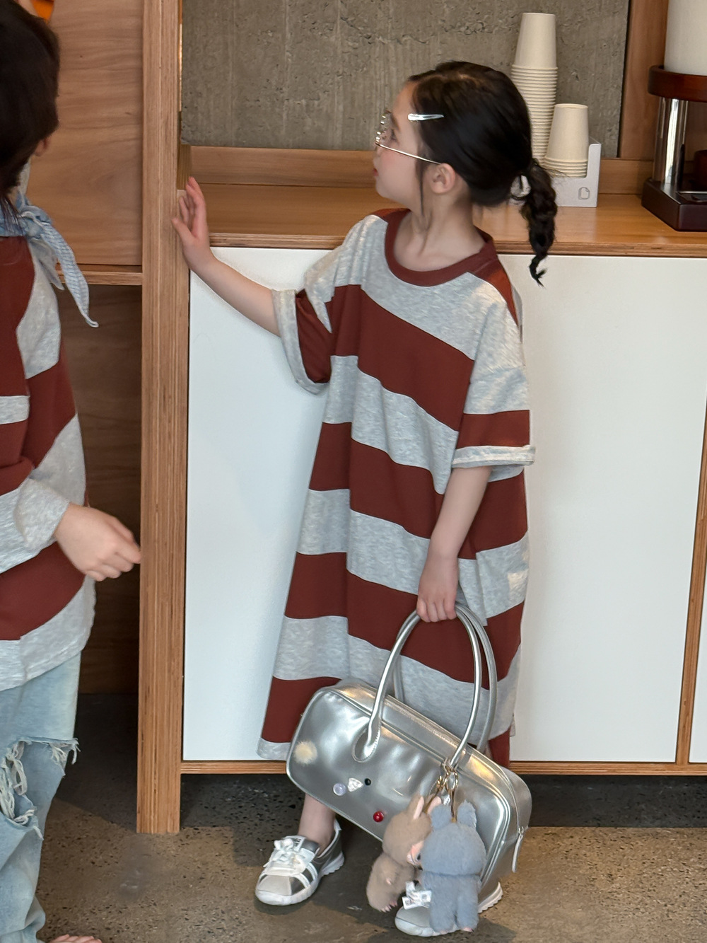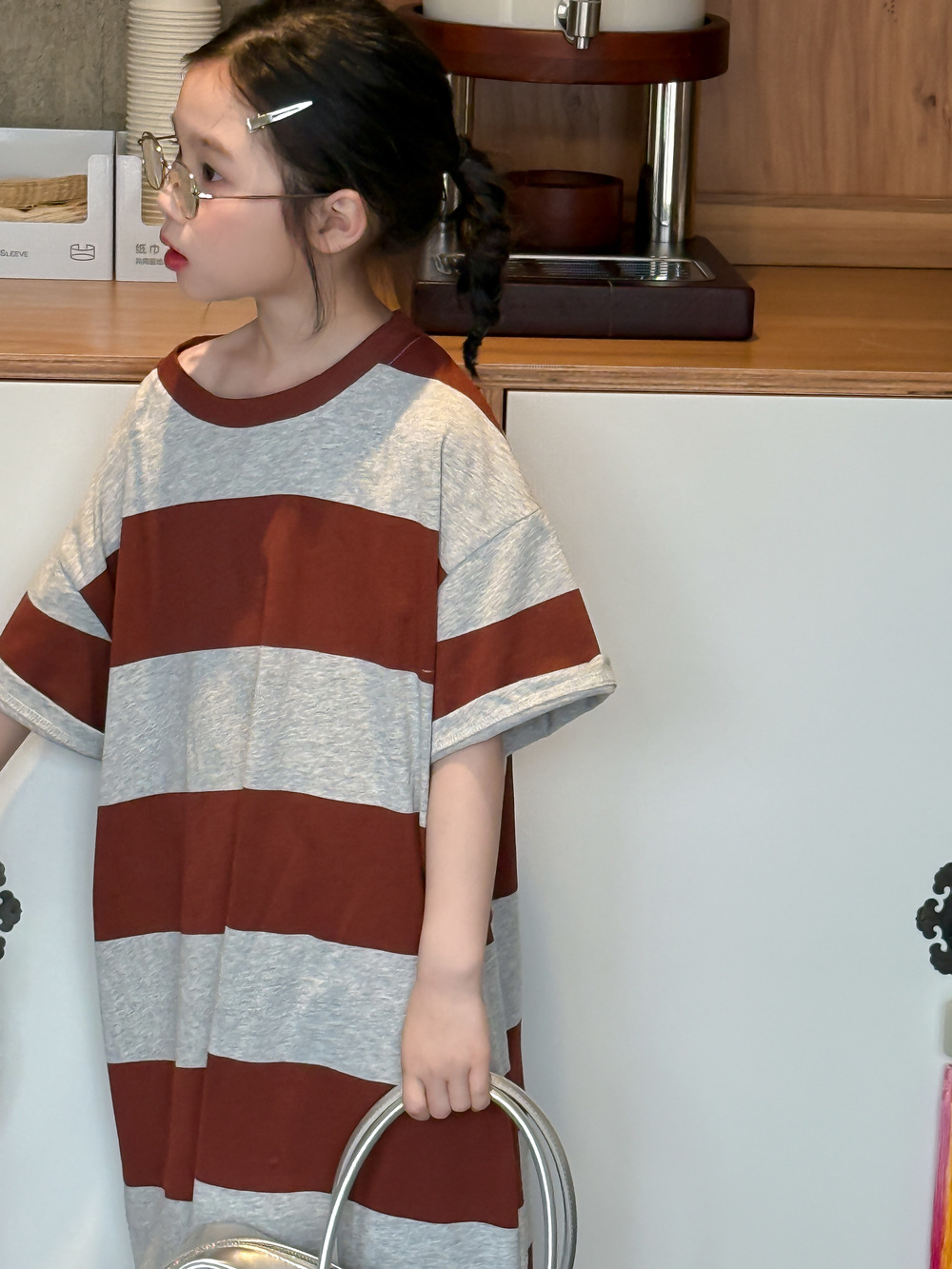 紅灰寬條紋T恤裙 / 140cm