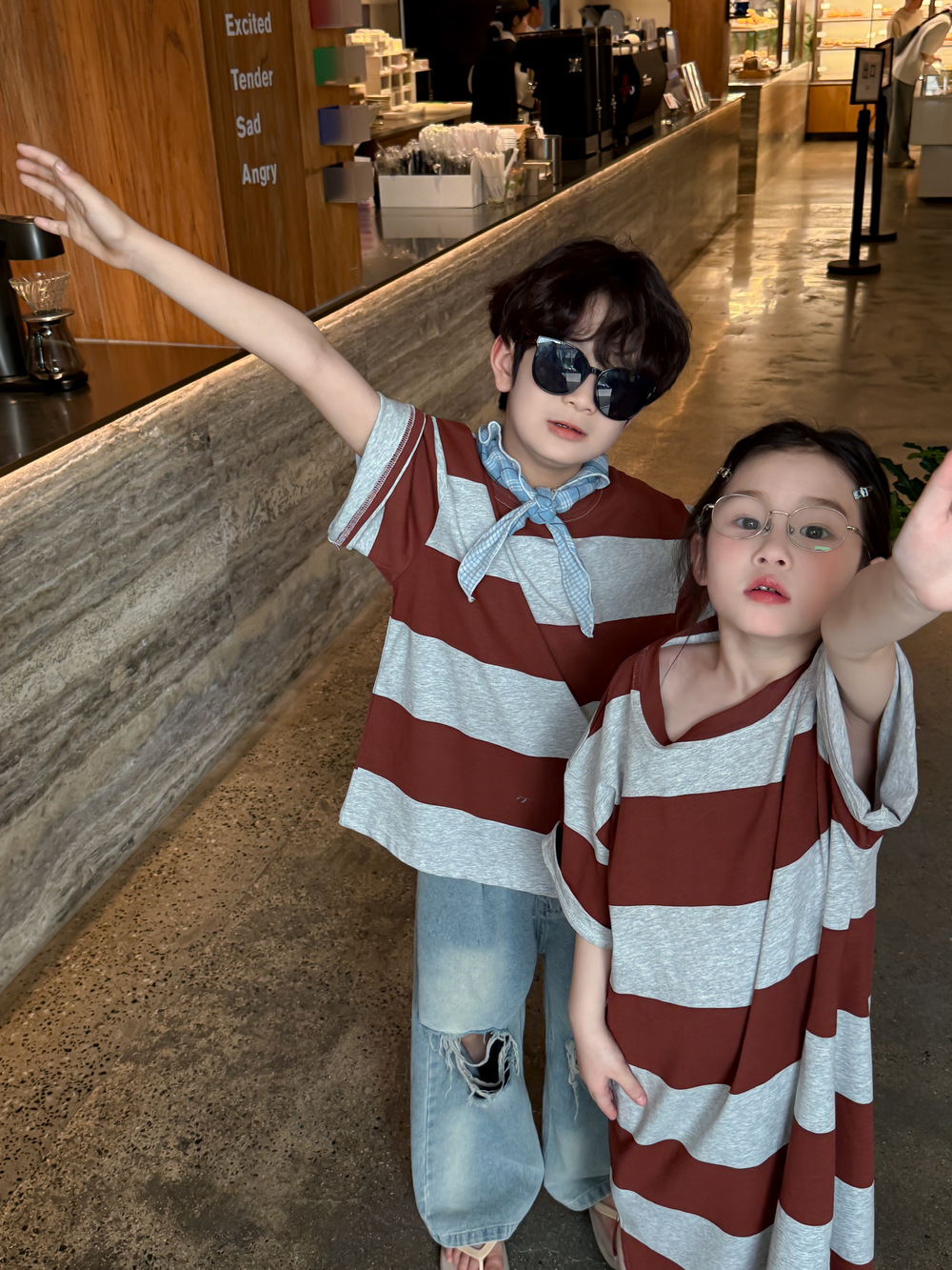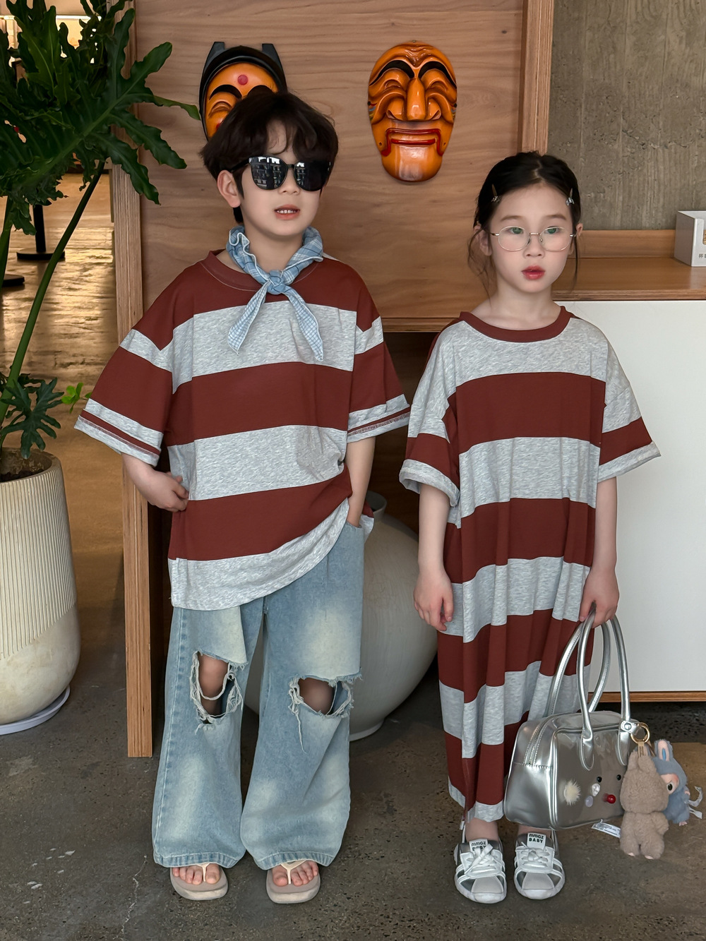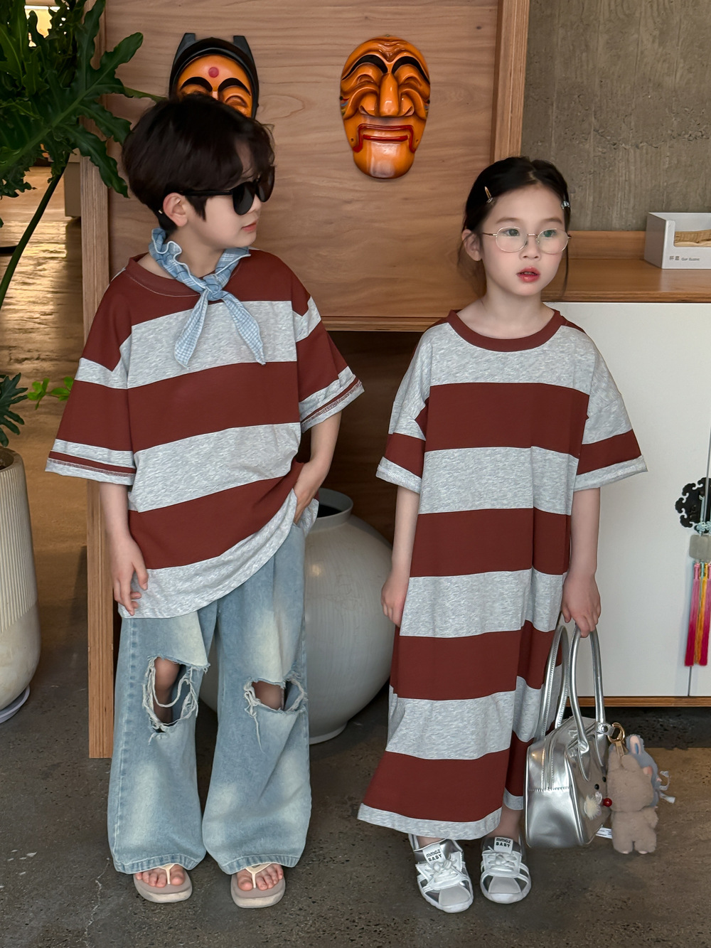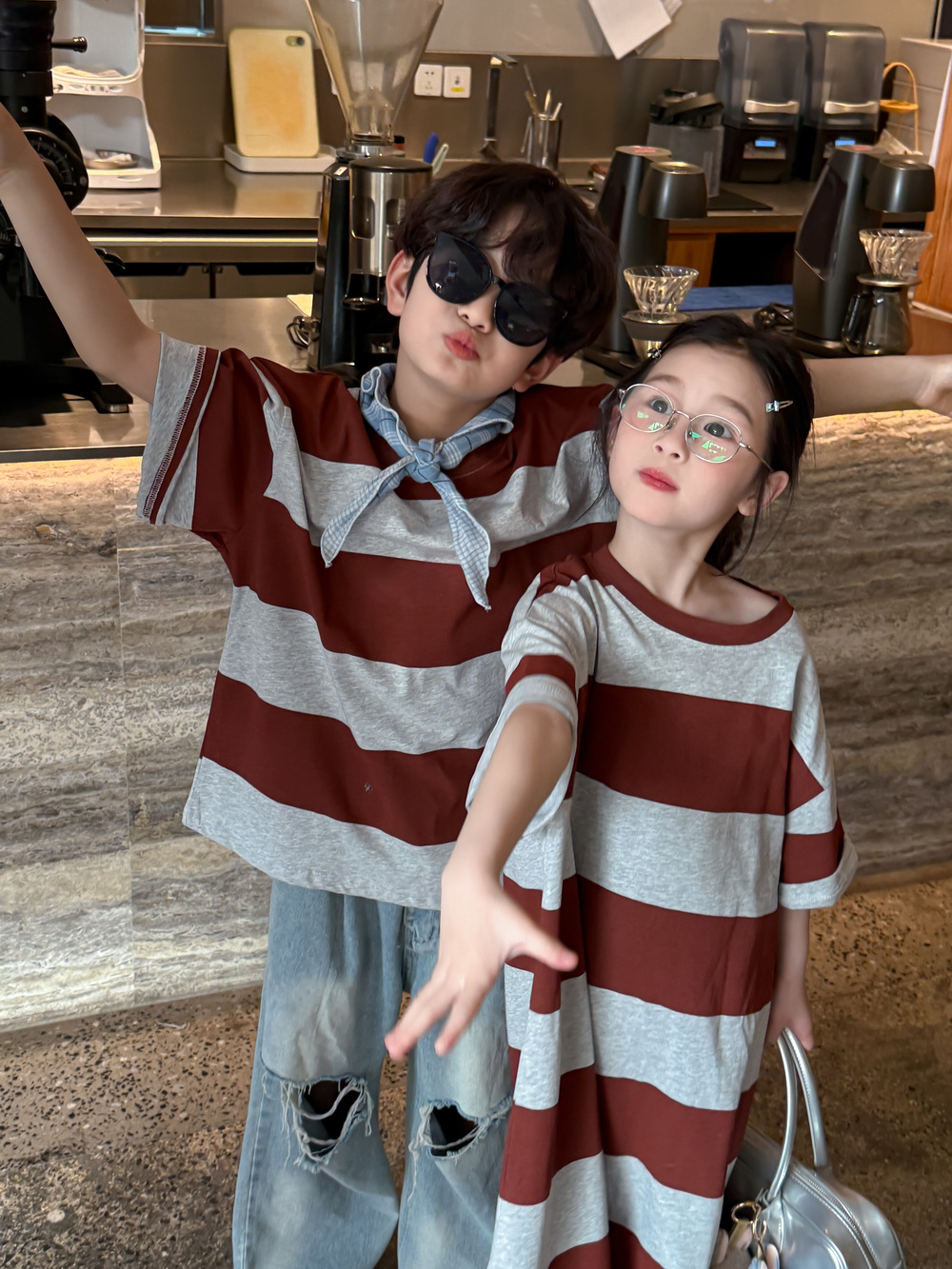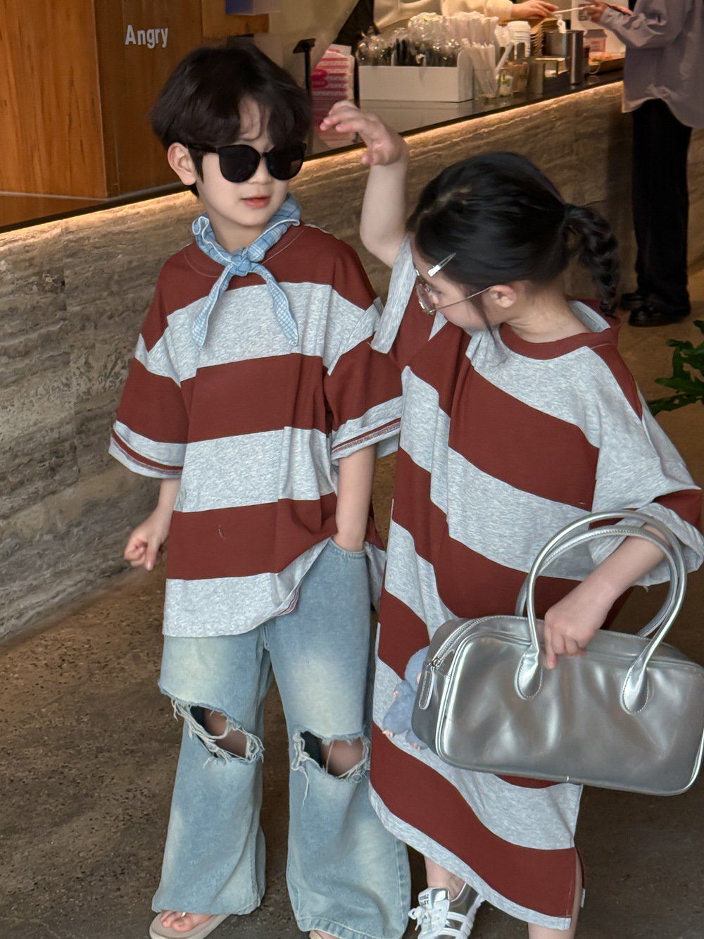 2025X127SE-夏季男女童韓版寬條紋休閒短袖兄妹裝