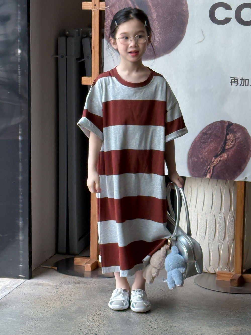 紅灰寬條紋T恤裙 / 120cm