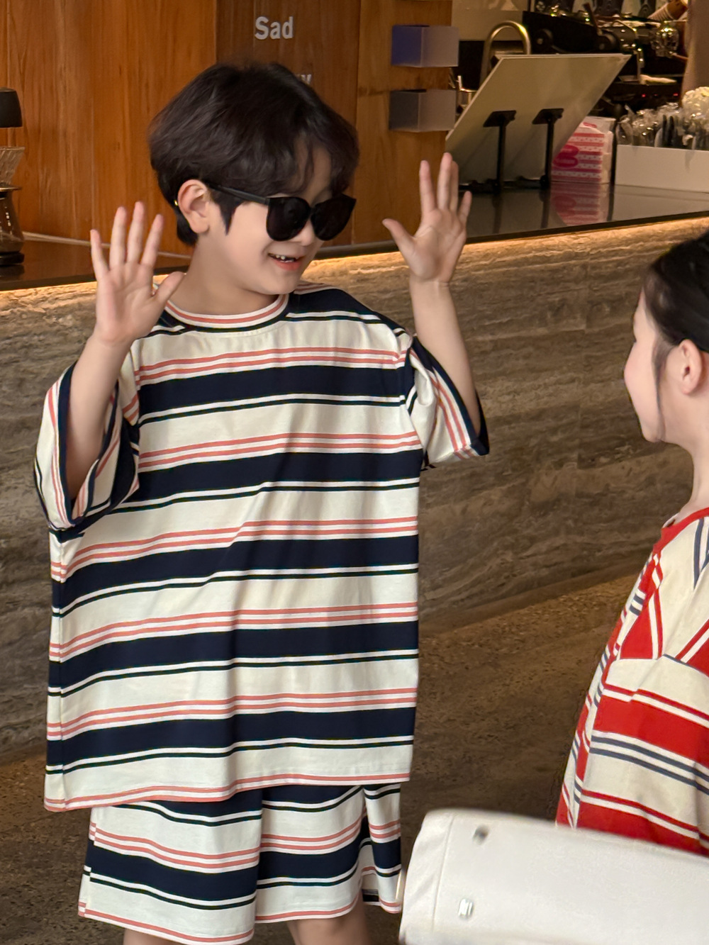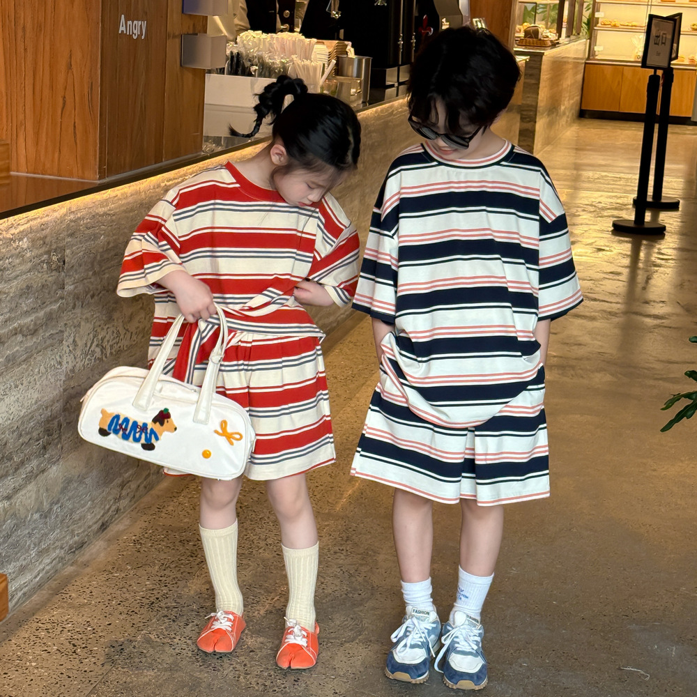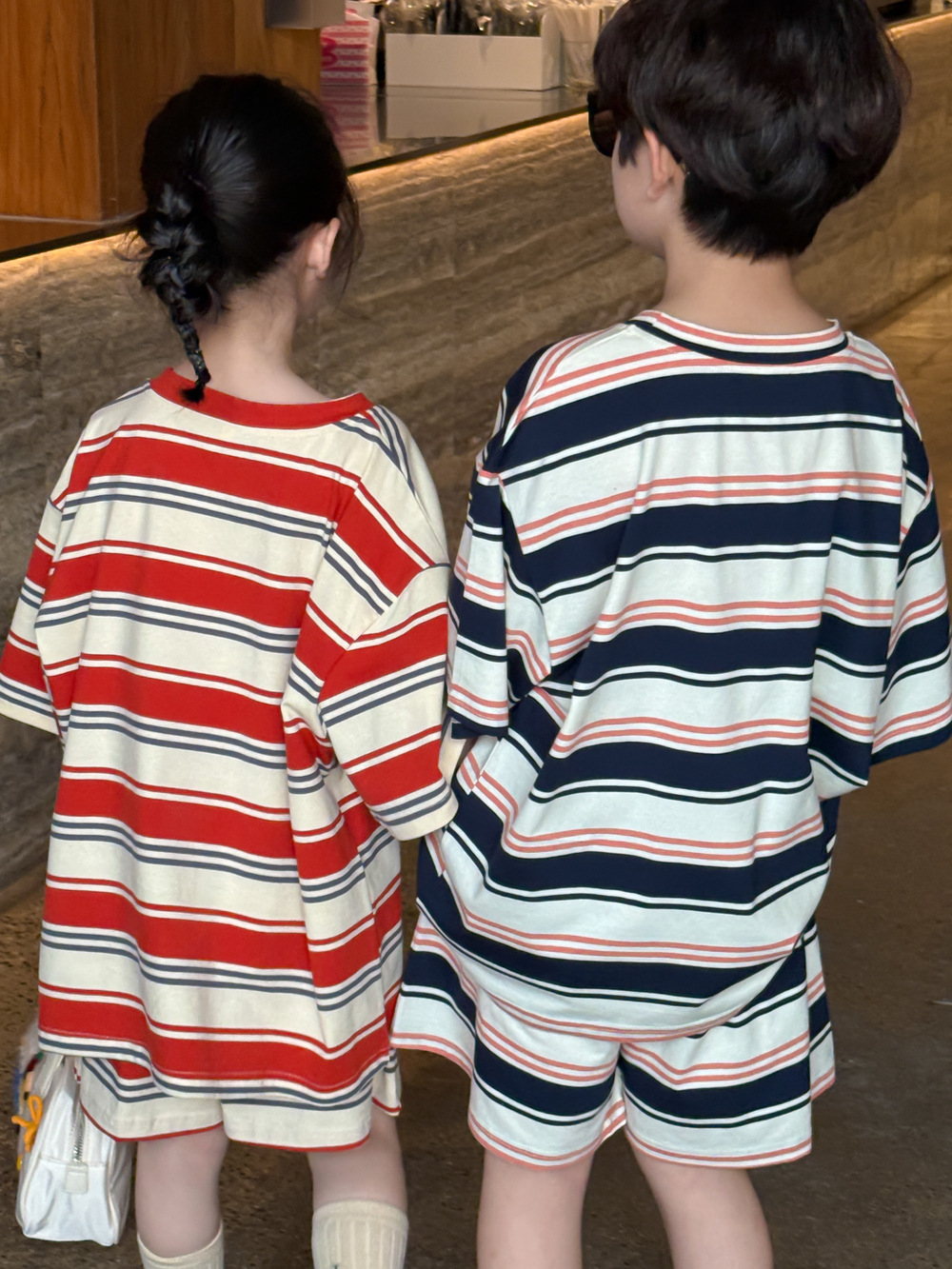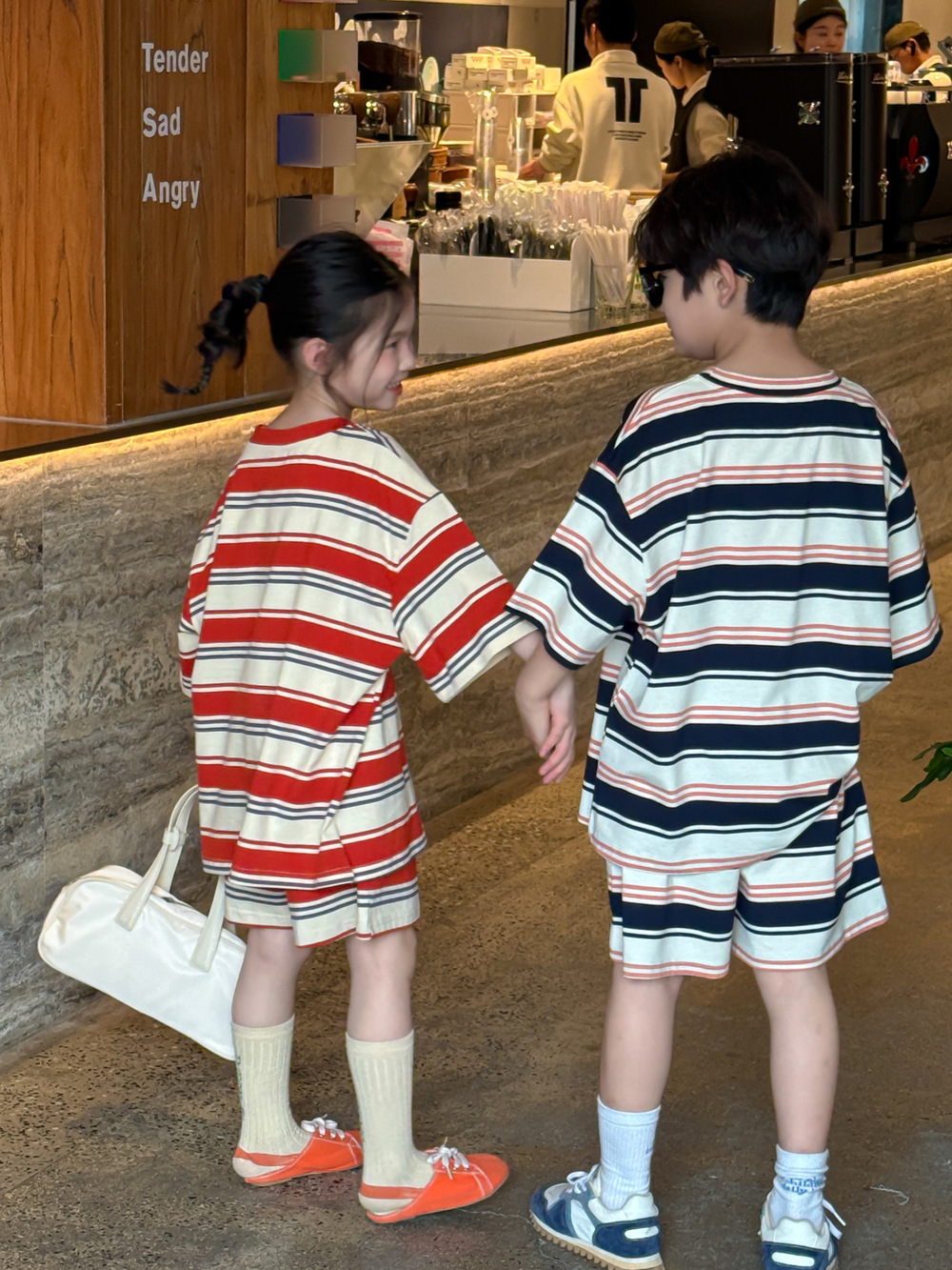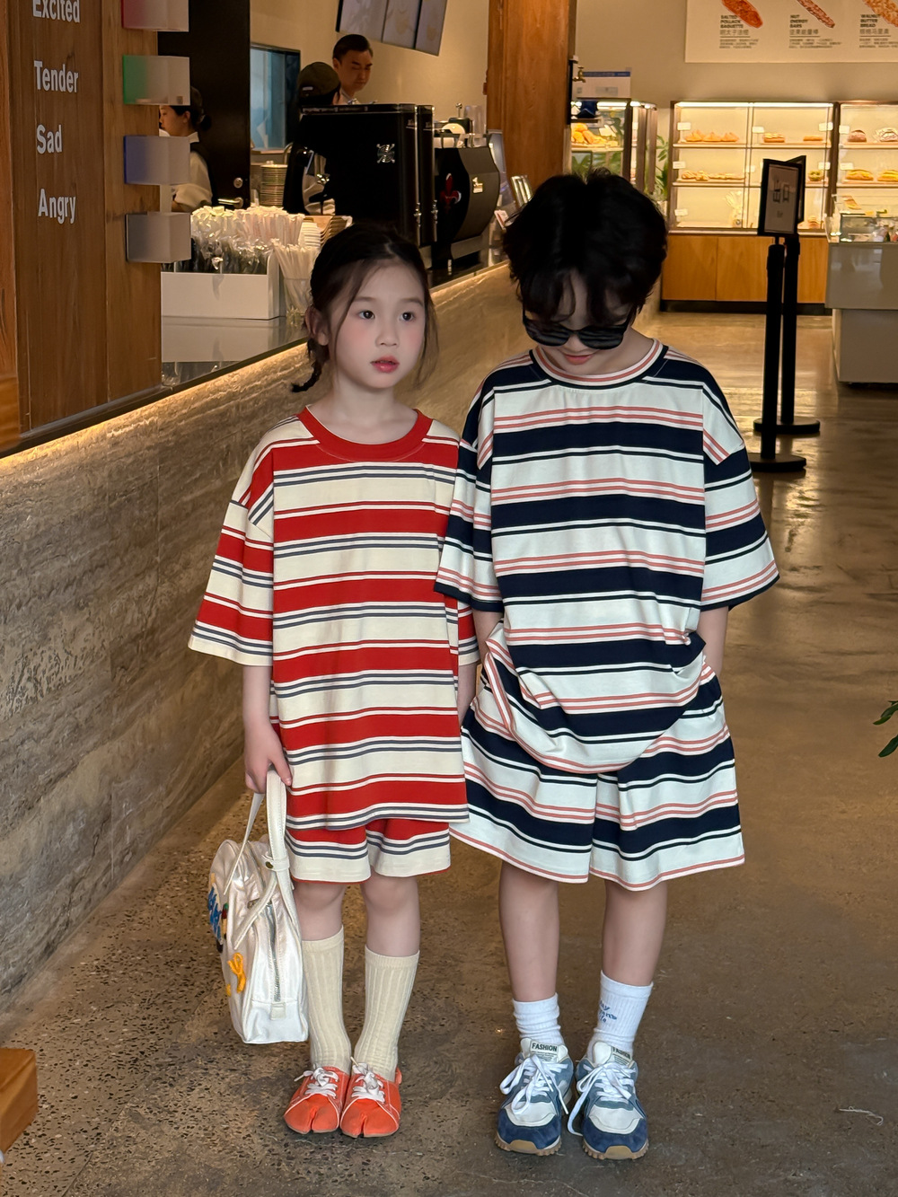 2025X130TG-夏季男女童韓版字母條紋短袖短褲兩件套