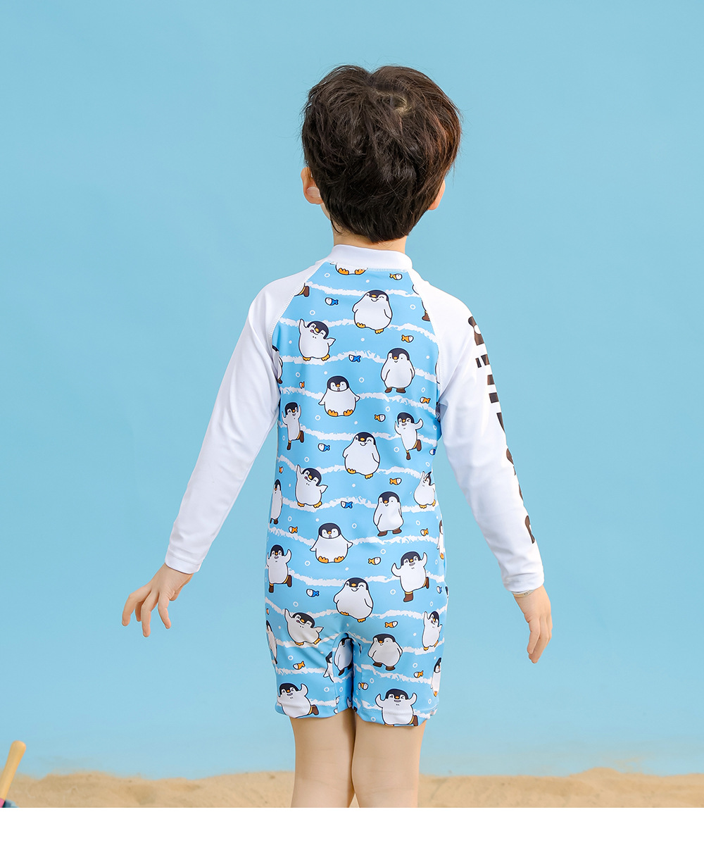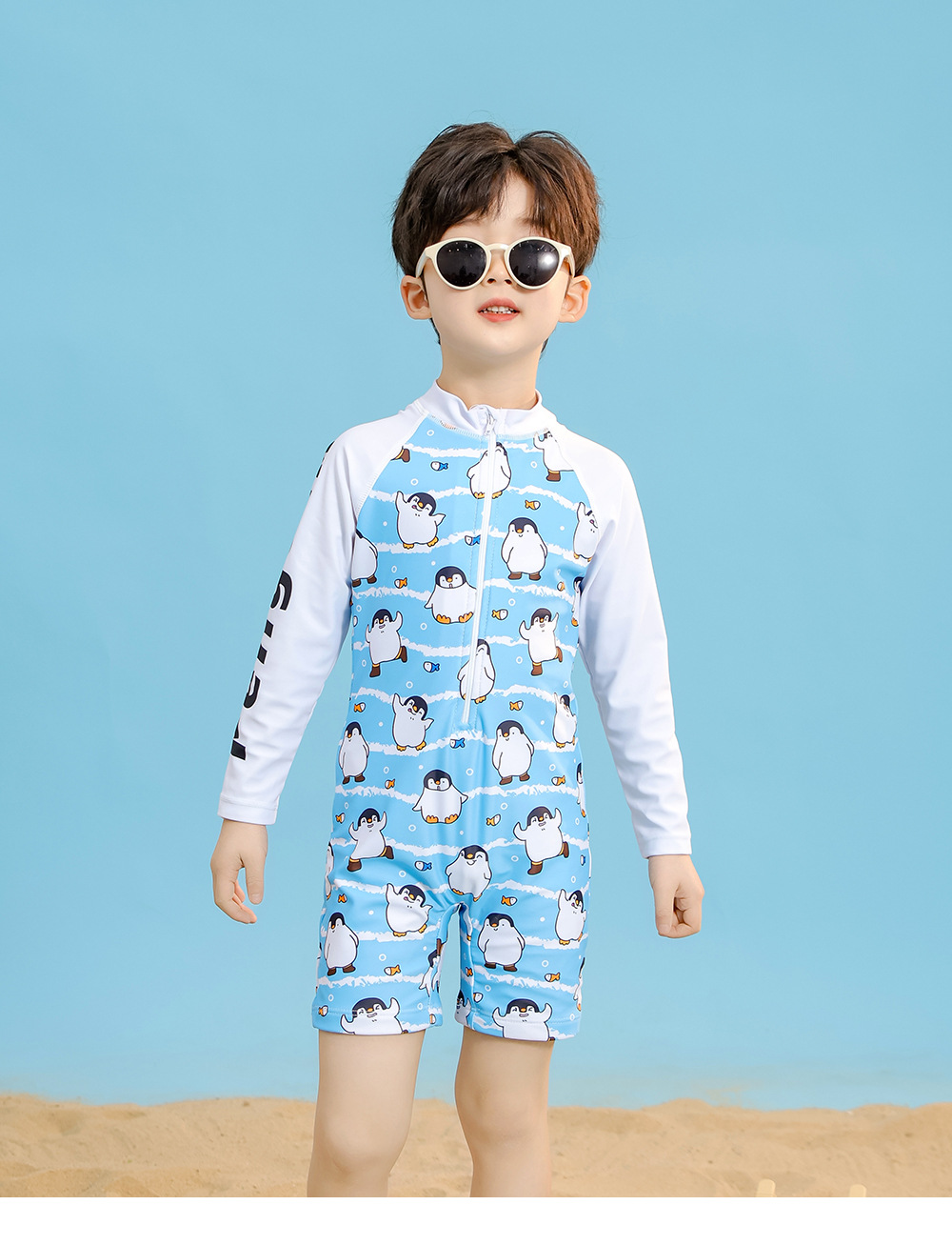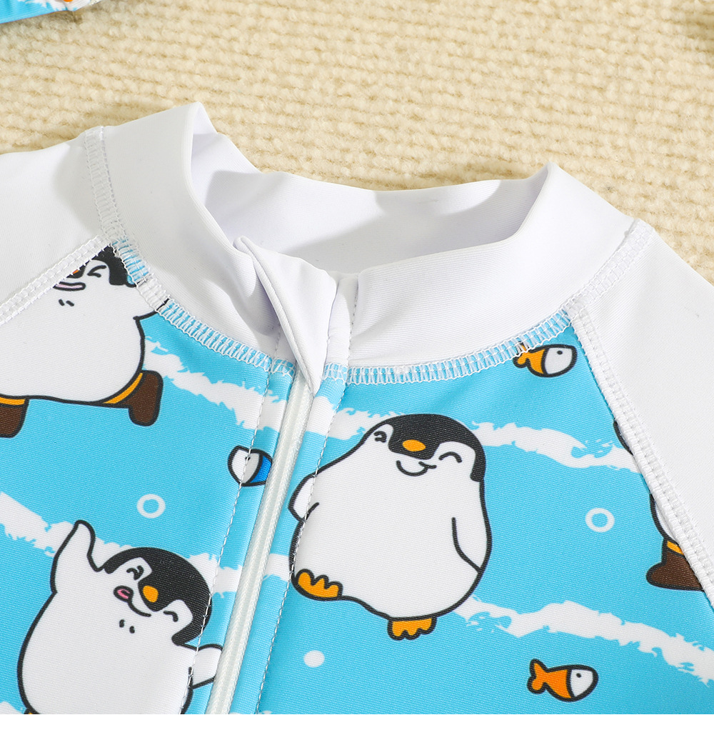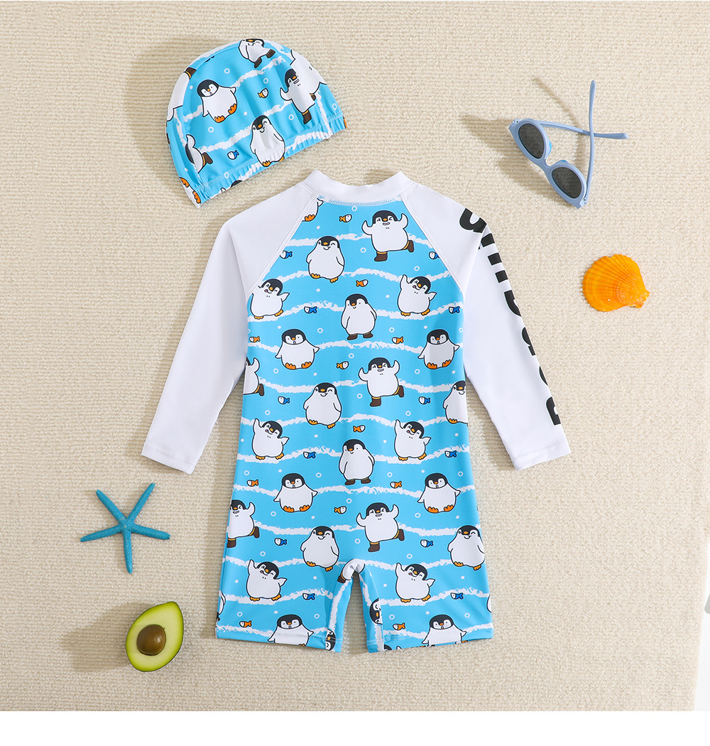 2507LS-夏季企鵝印花男童連體可愛泳衣+泳帽