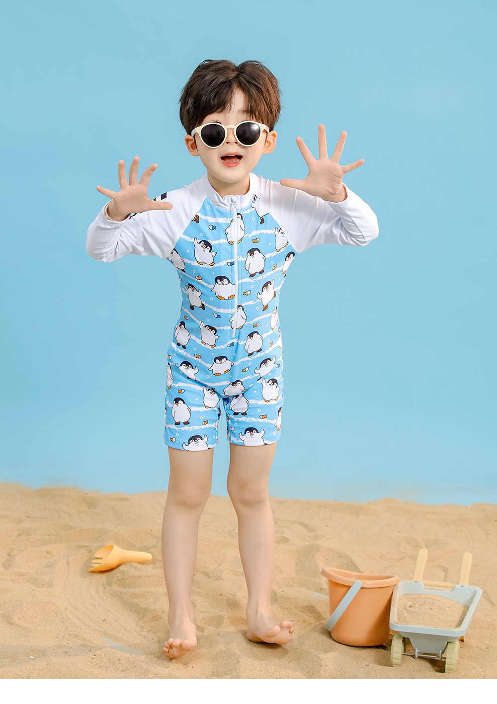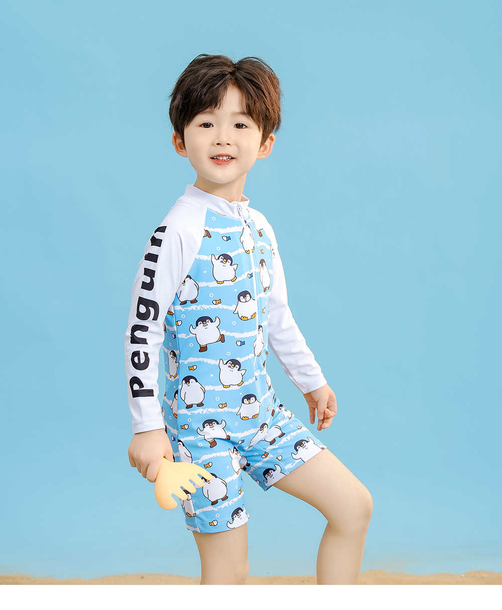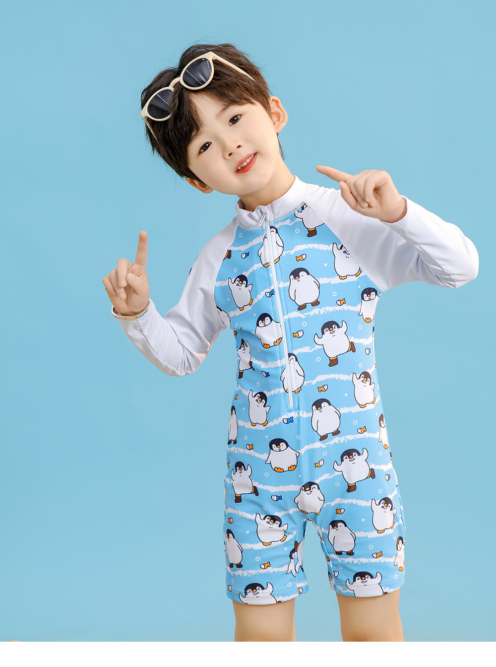 2507LS-夏季企鵝印花男童連體可愛泳衣+泳帽