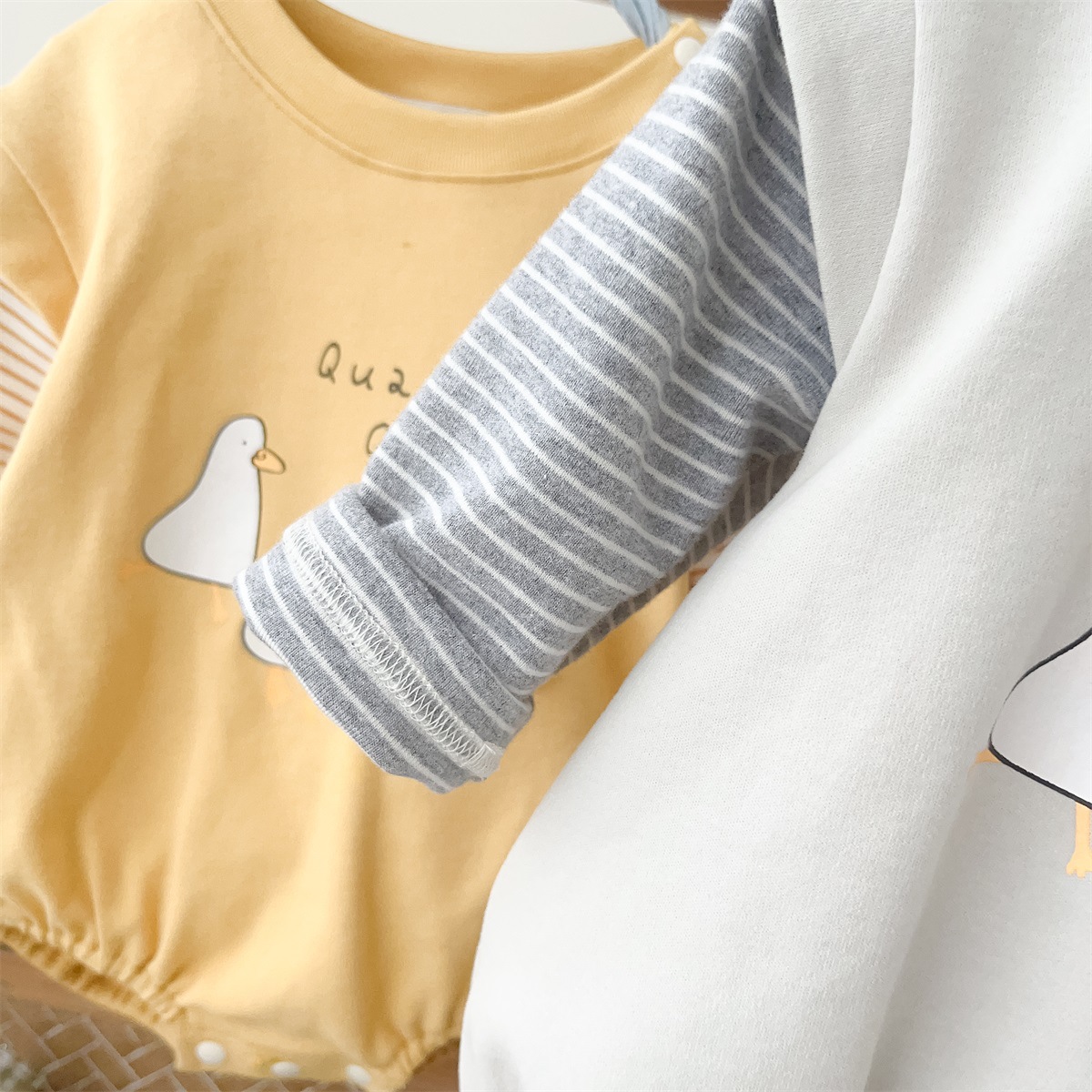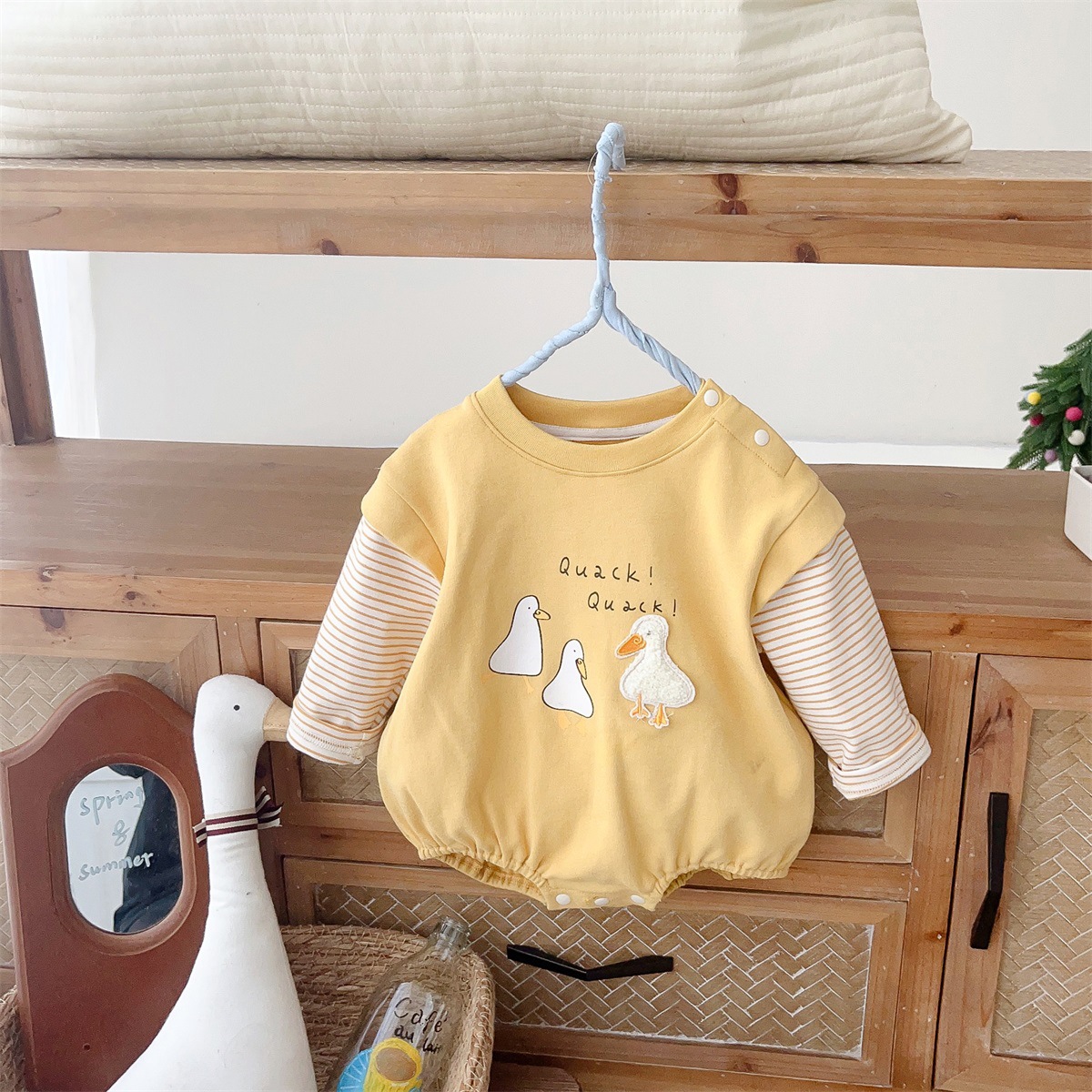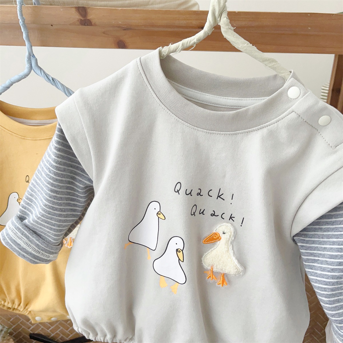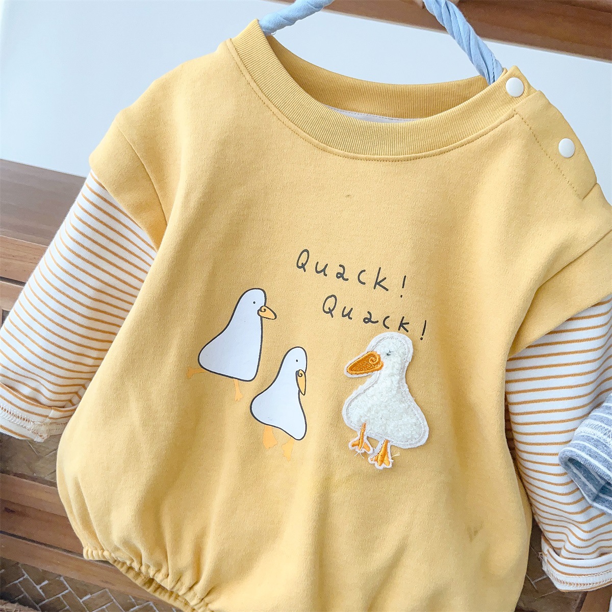 2517024LS-春季卡通小鴨子假兩件條紋包屁衣