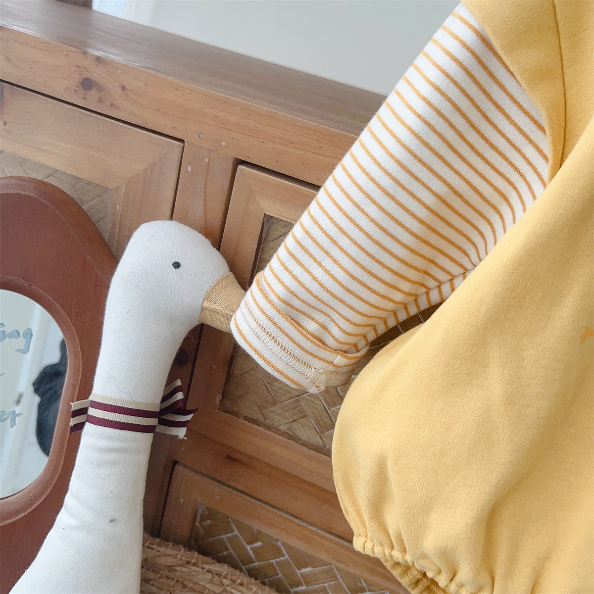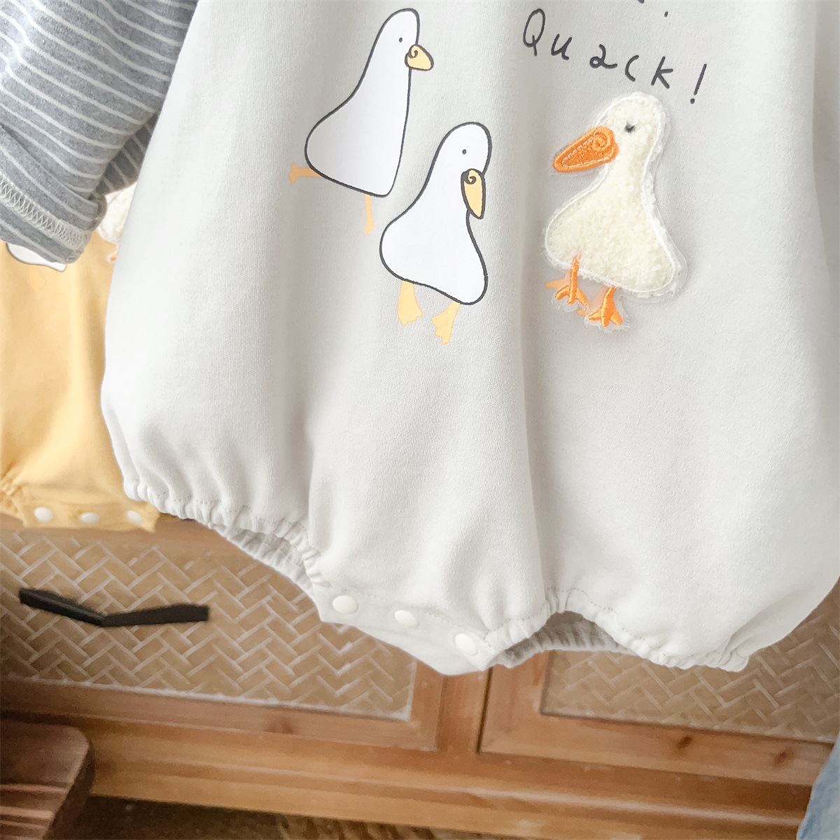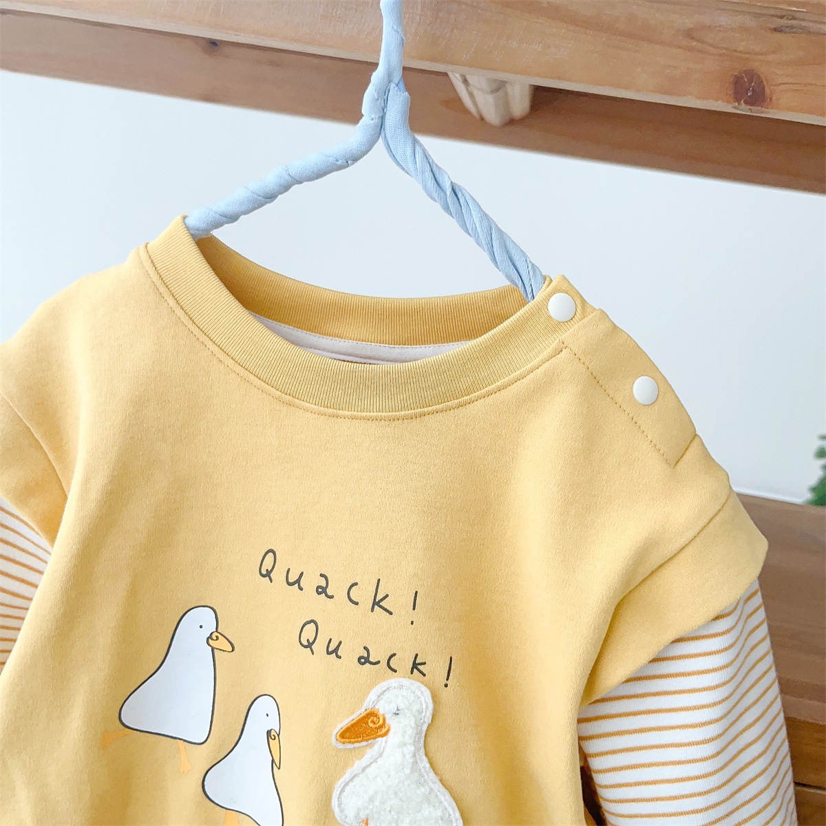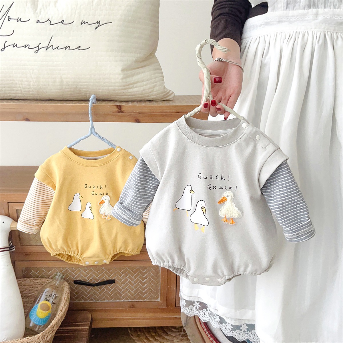 2517024LS-春季卡通小鴨子假兩件條紋包屁衣