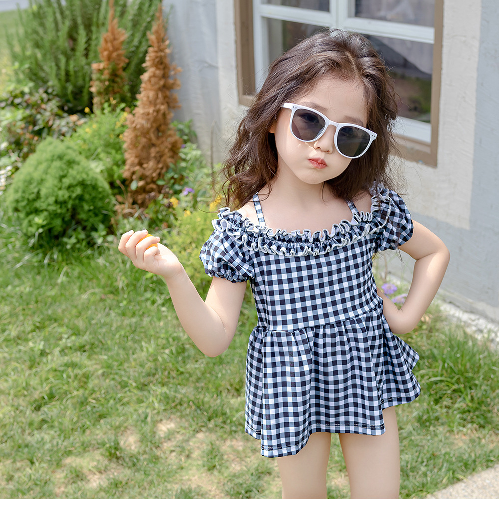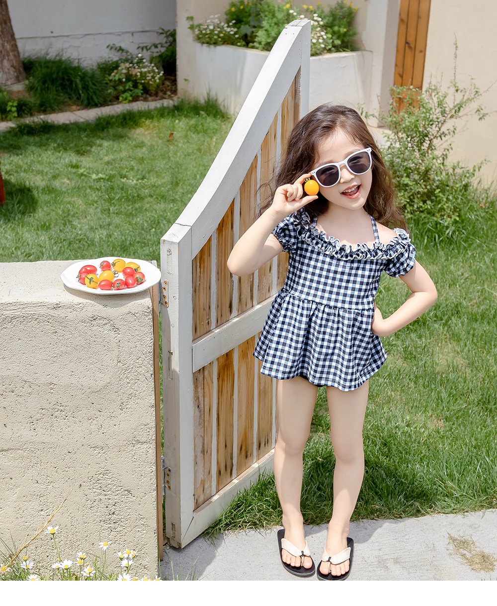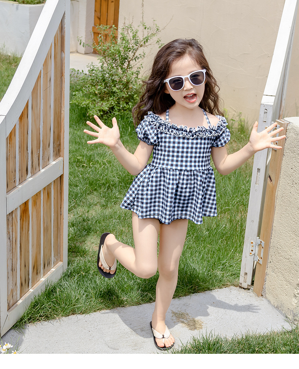 4287LS-夏季速乾女童一字肩分體泳衣+泳帽