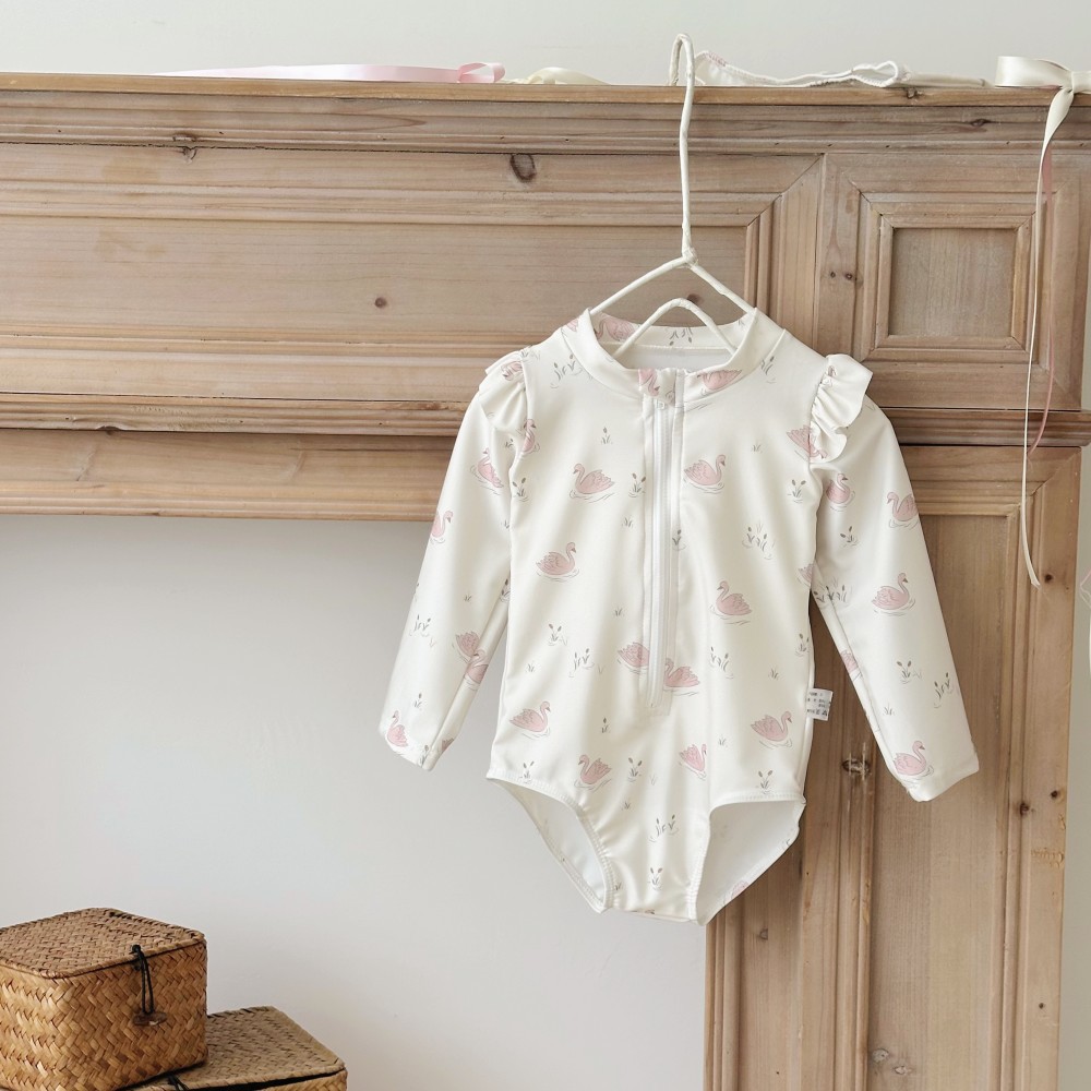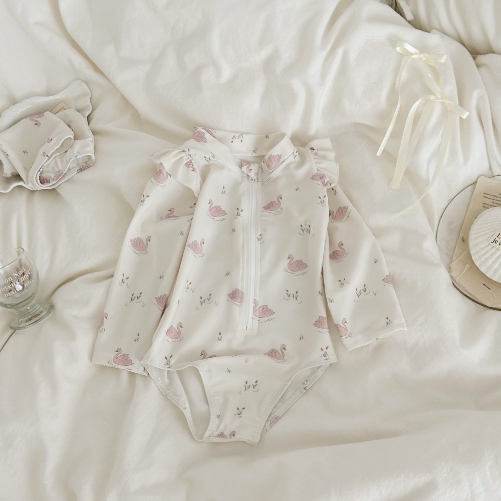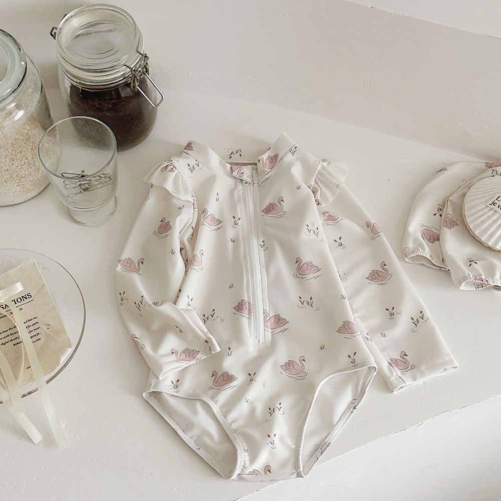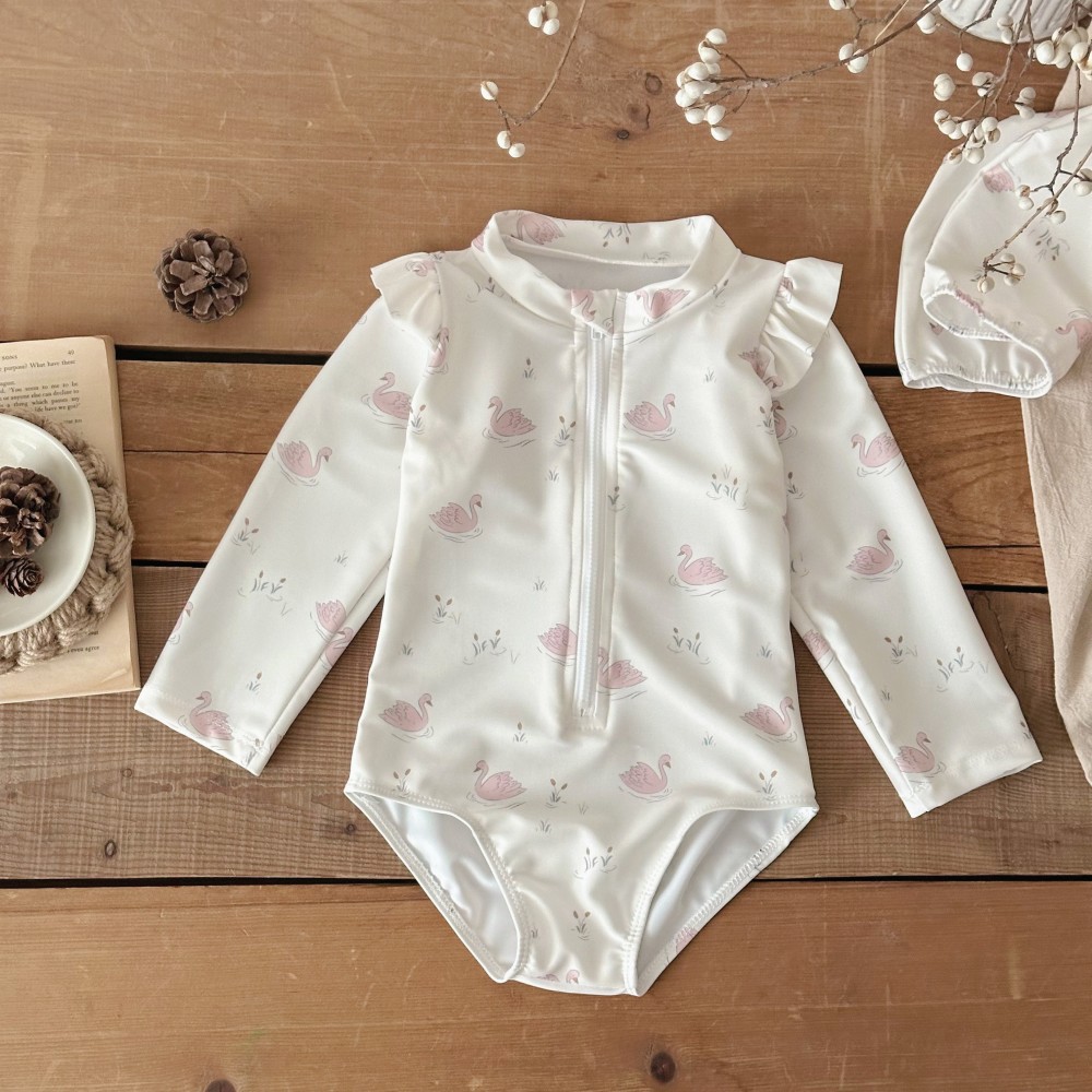 61807LS-夏季兒童長袖天鵝防曬連身游泳衣(送泳帽)