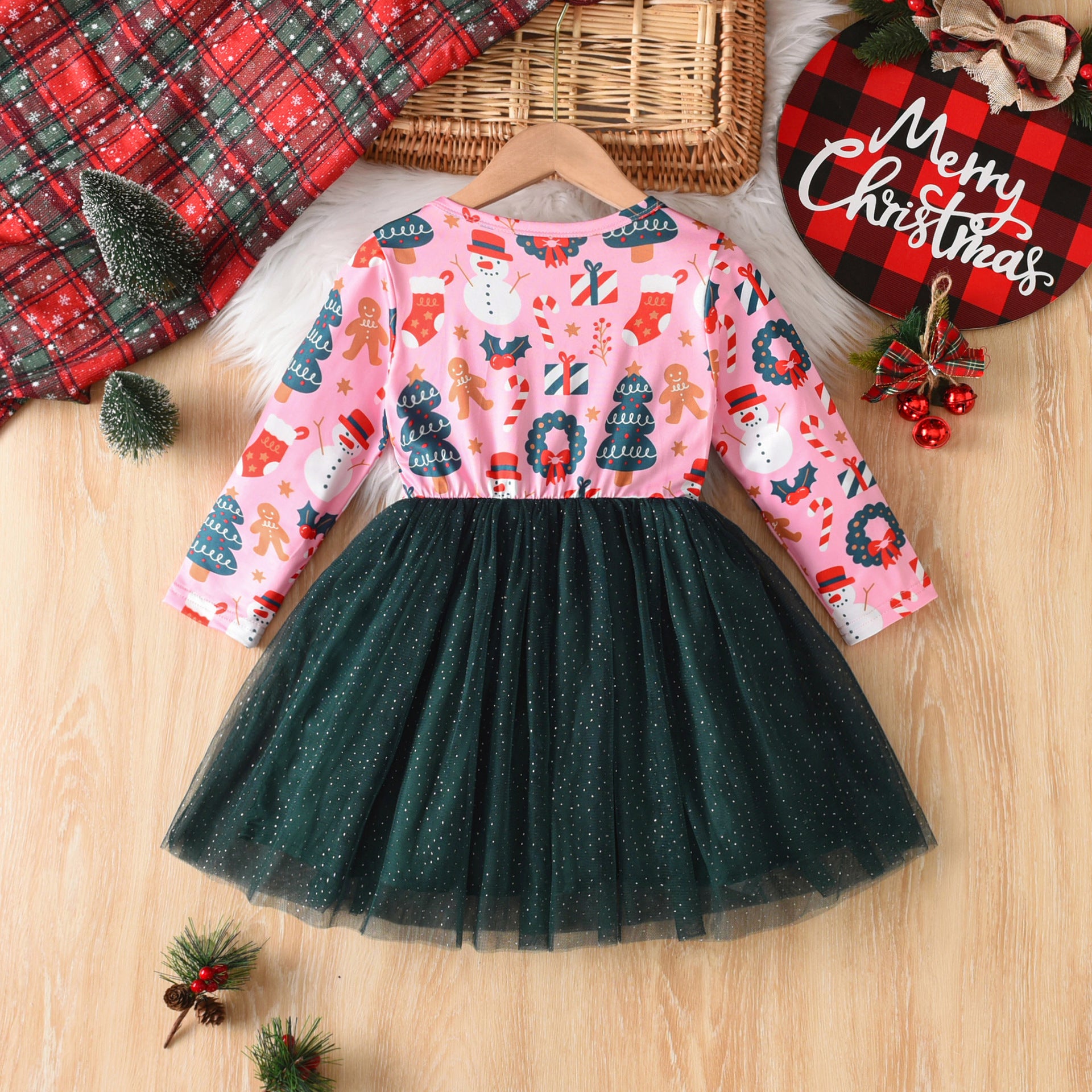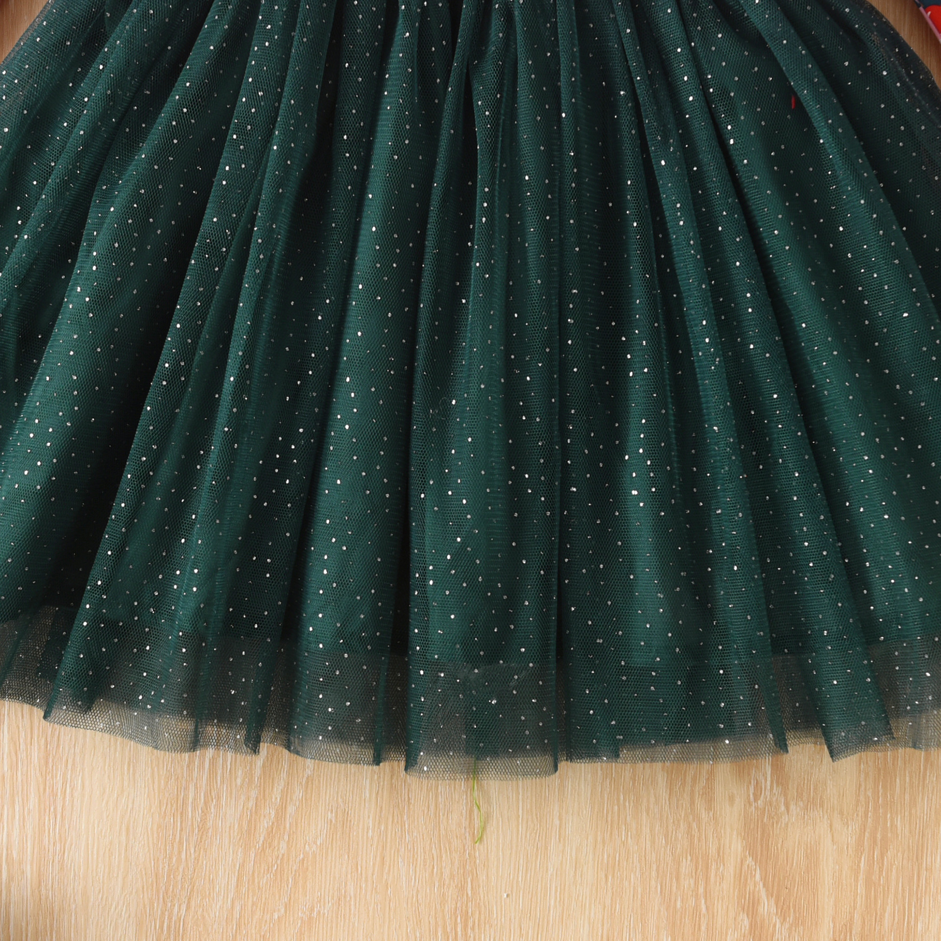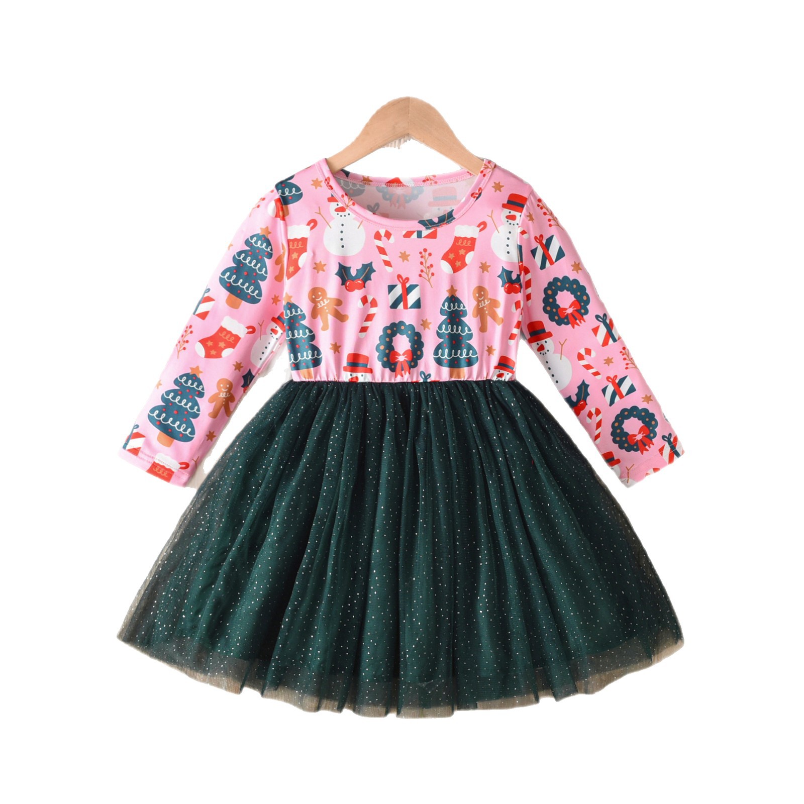 67135LS-秋冬聖誕印花細閃網紗澎澎連衣裙