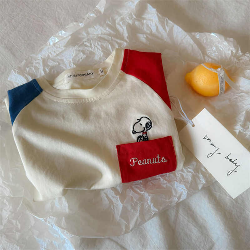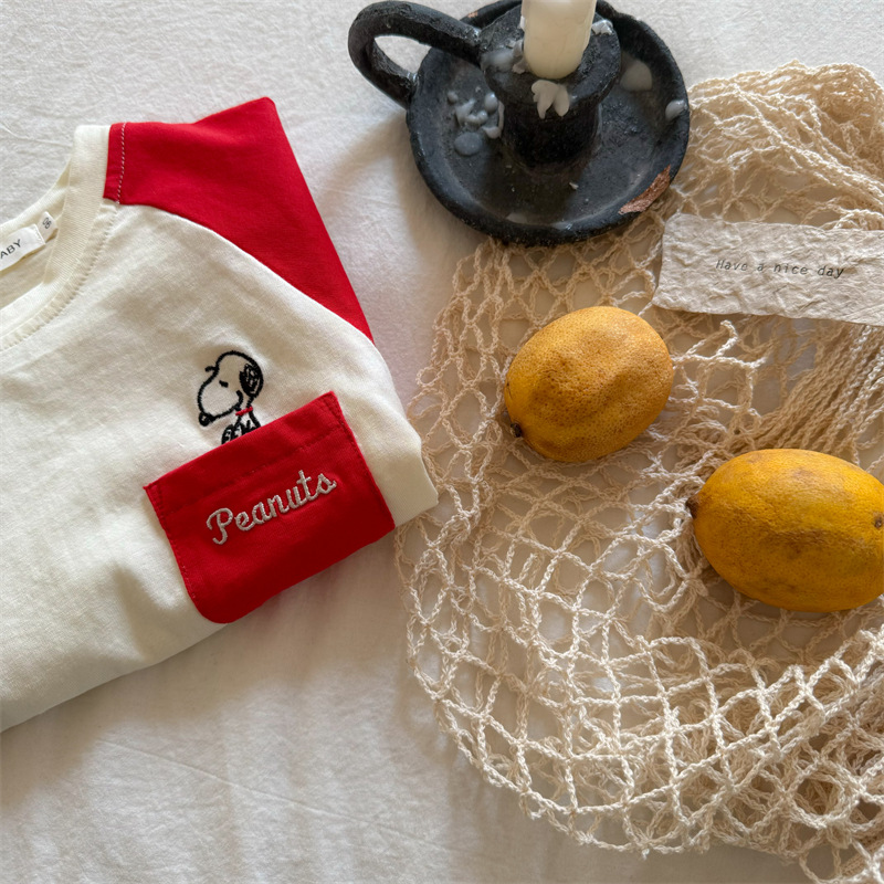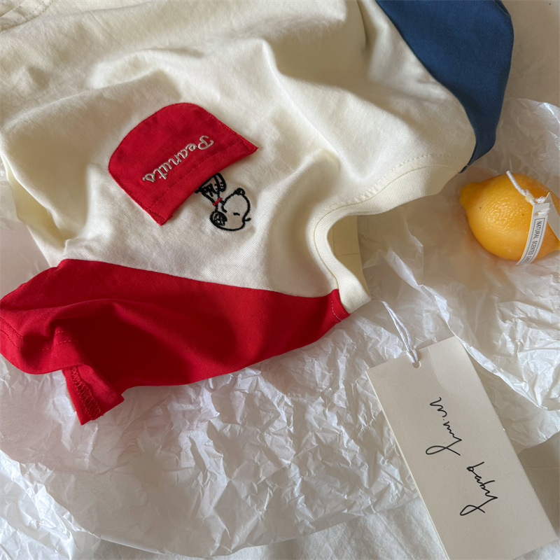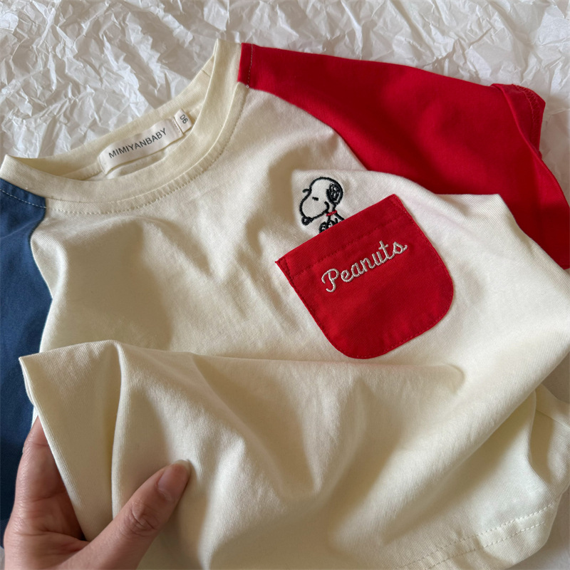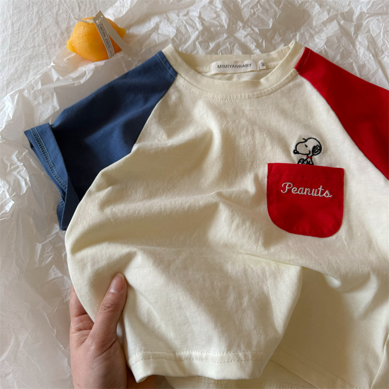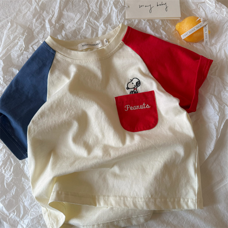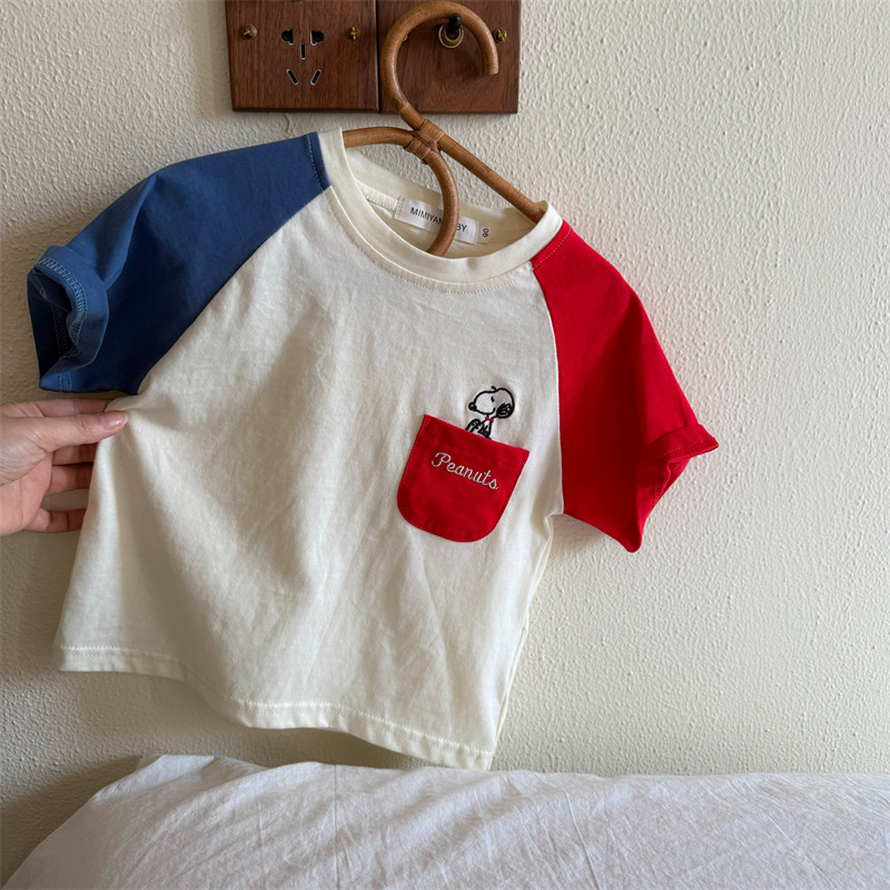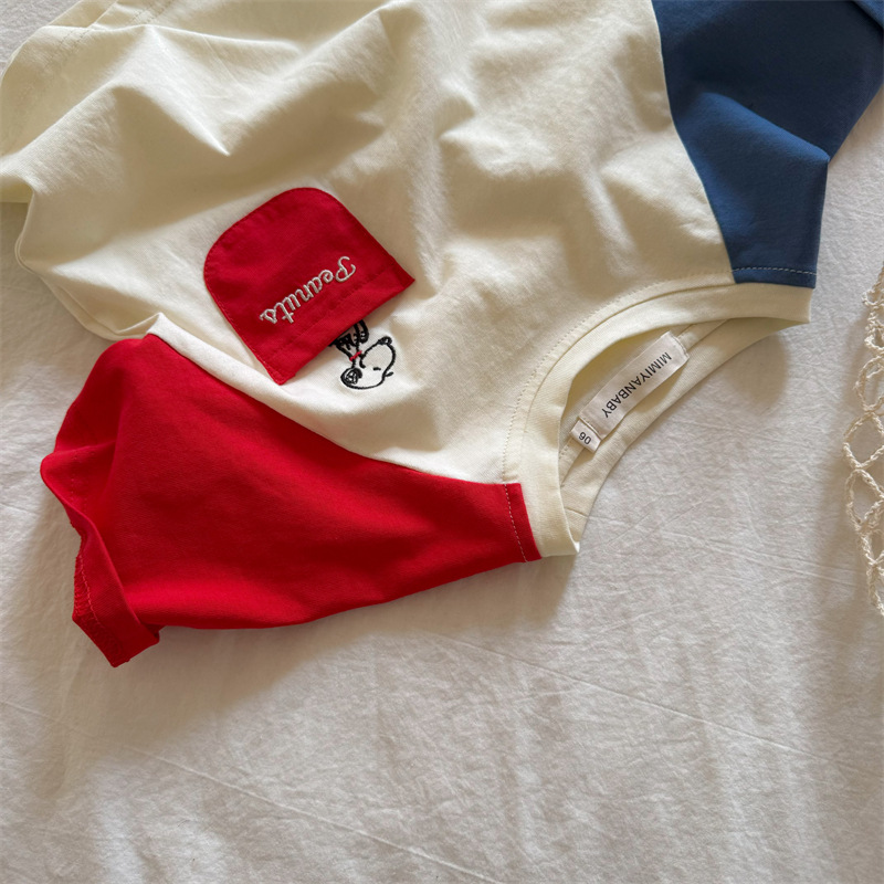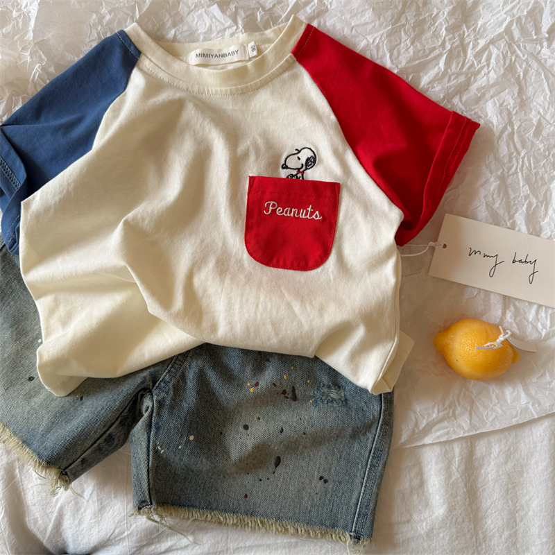 70218SE-夏季男女童口袋繡花短袖拼接撞色T
