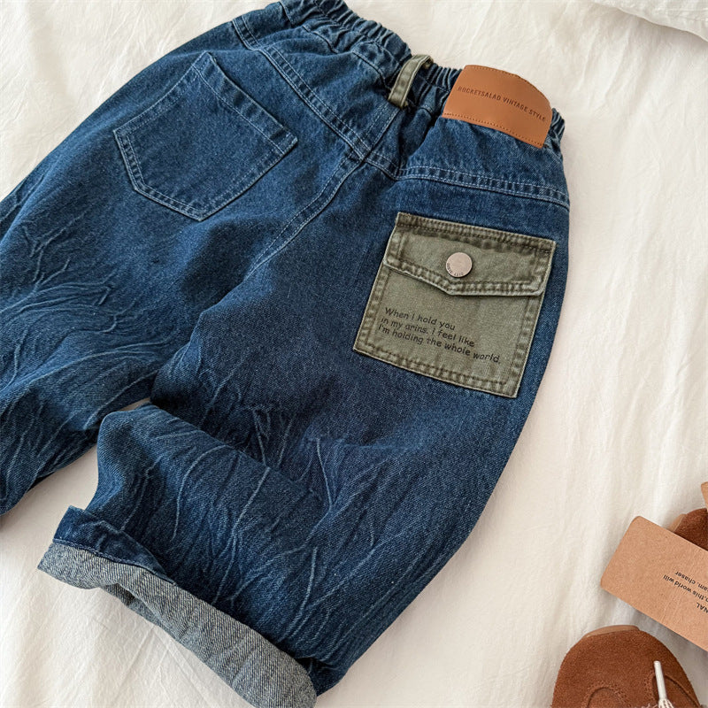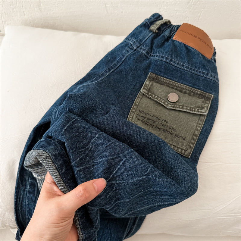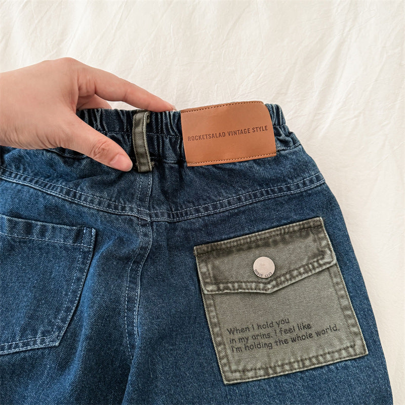 70596PA-秋季韓版鬆緊牛仔直筒長褲