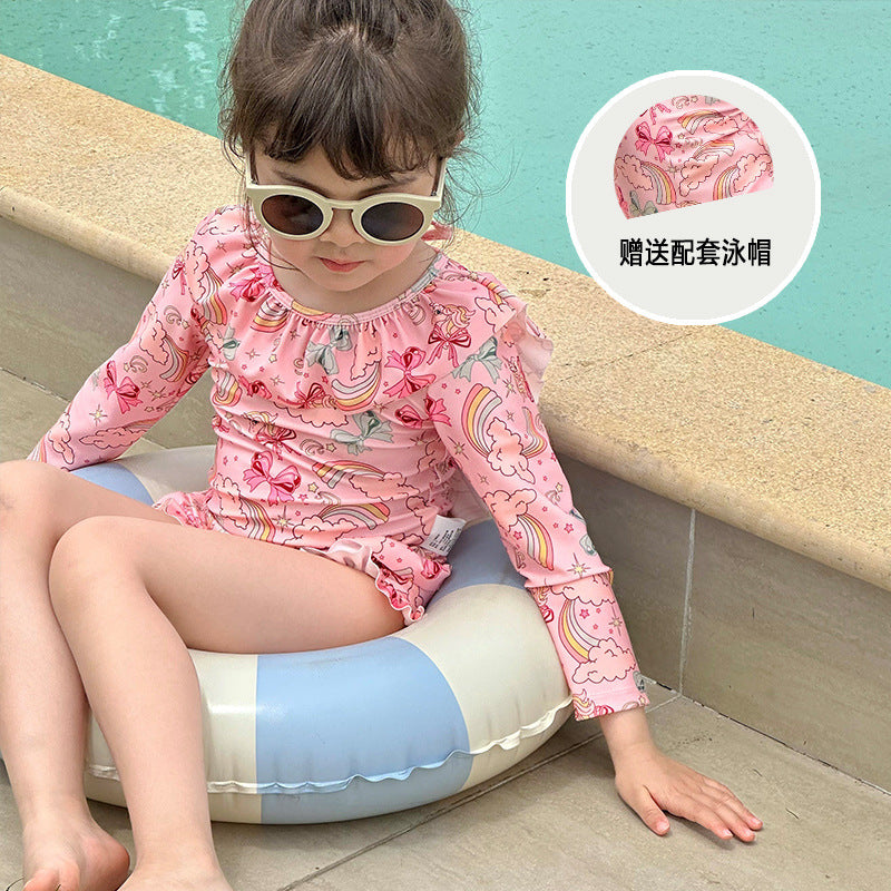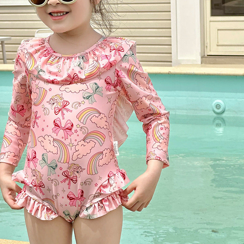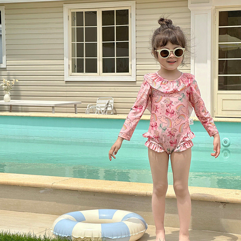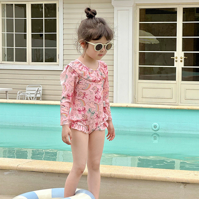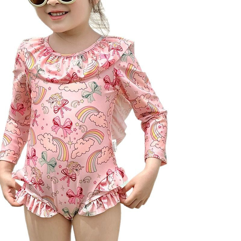 70911LS-夏季新女孩泳衣長袖防曬連身泳裝中小童甜美沙灘溫泉度假泳裝