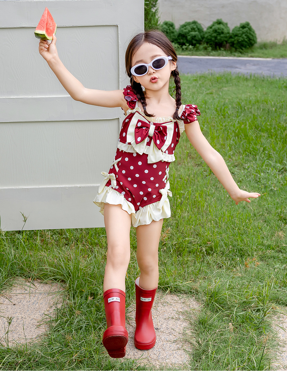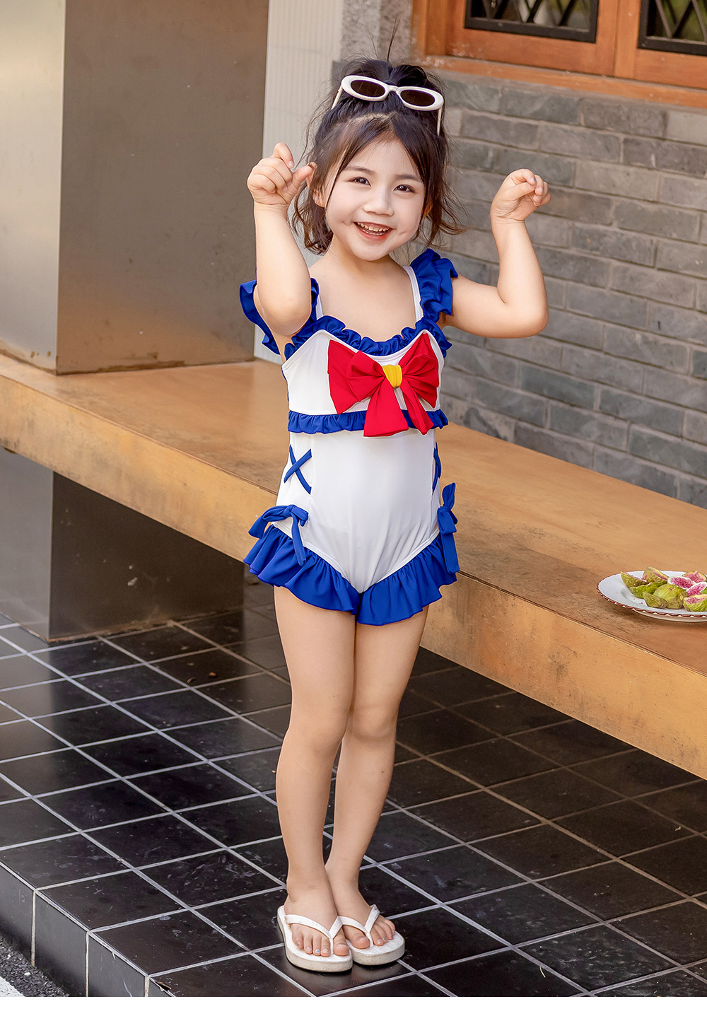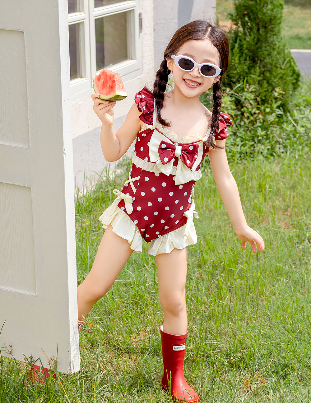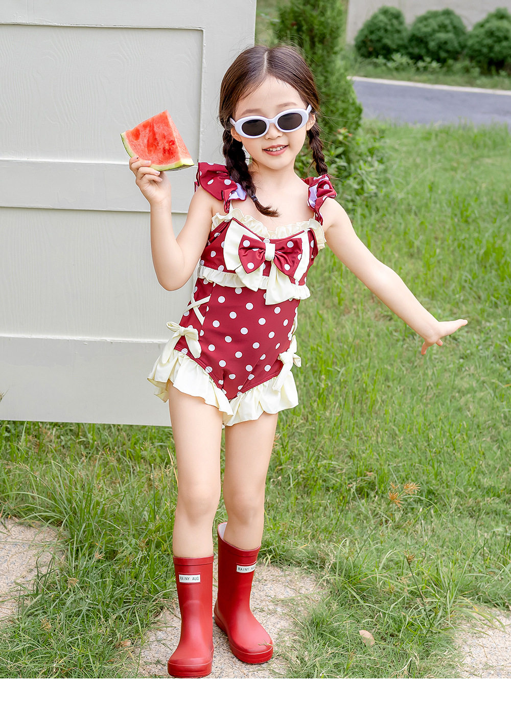8582LS-夏裝女孩蝴蝶結游泳衣+泳帽