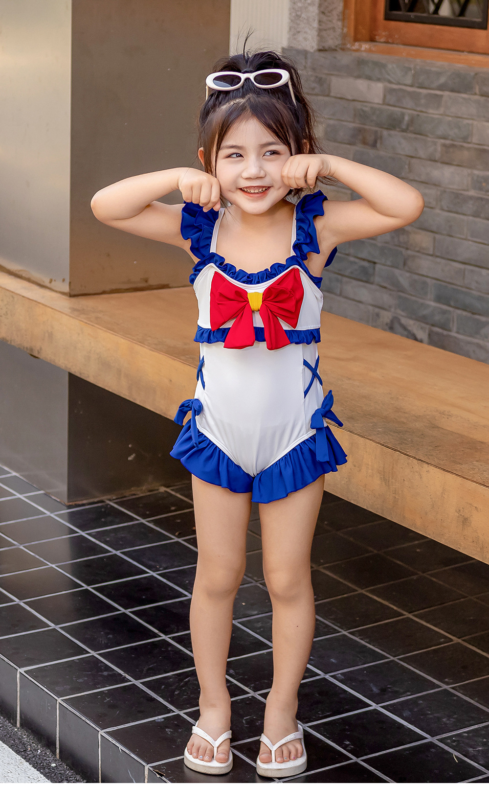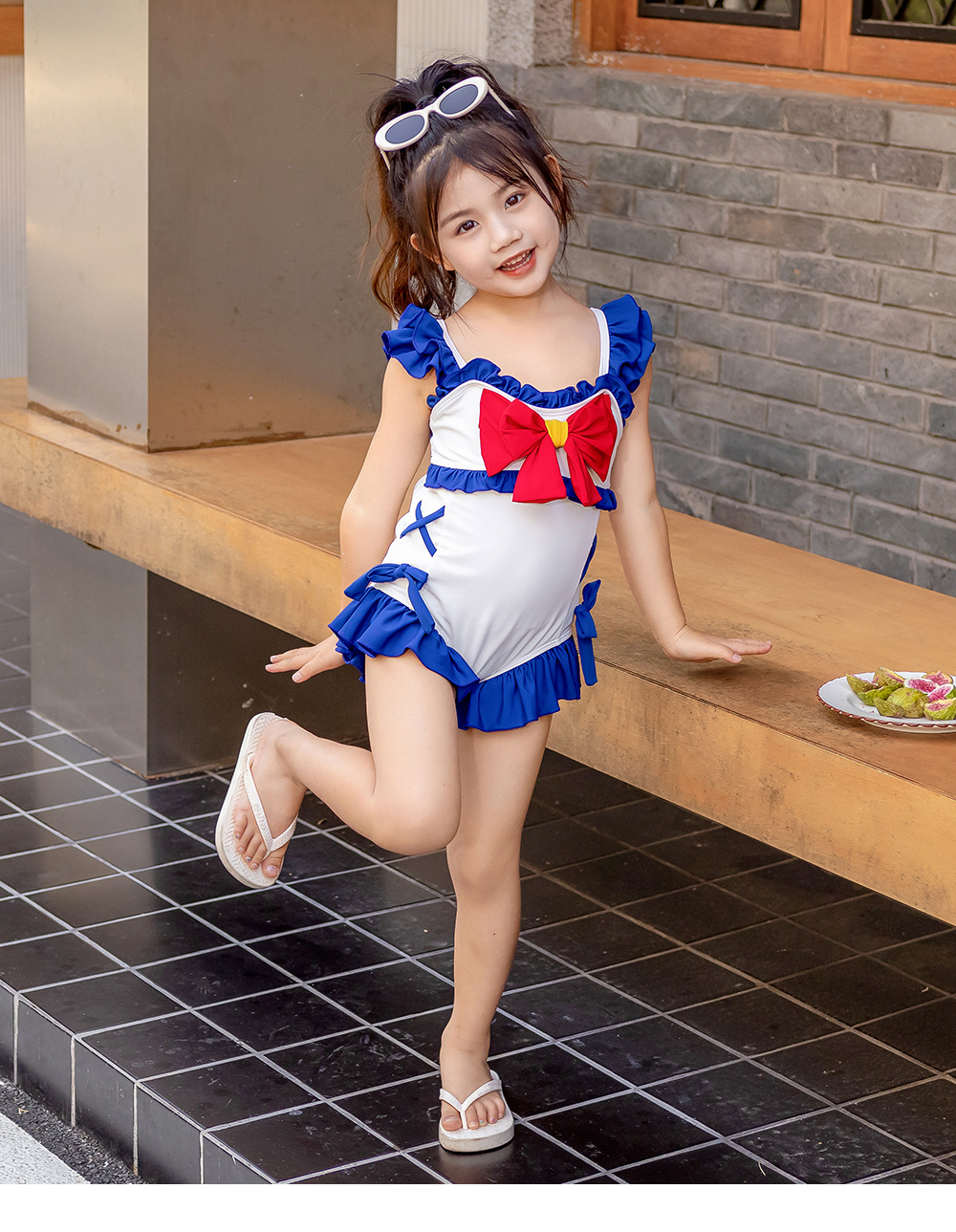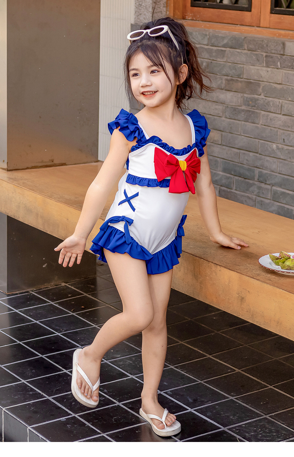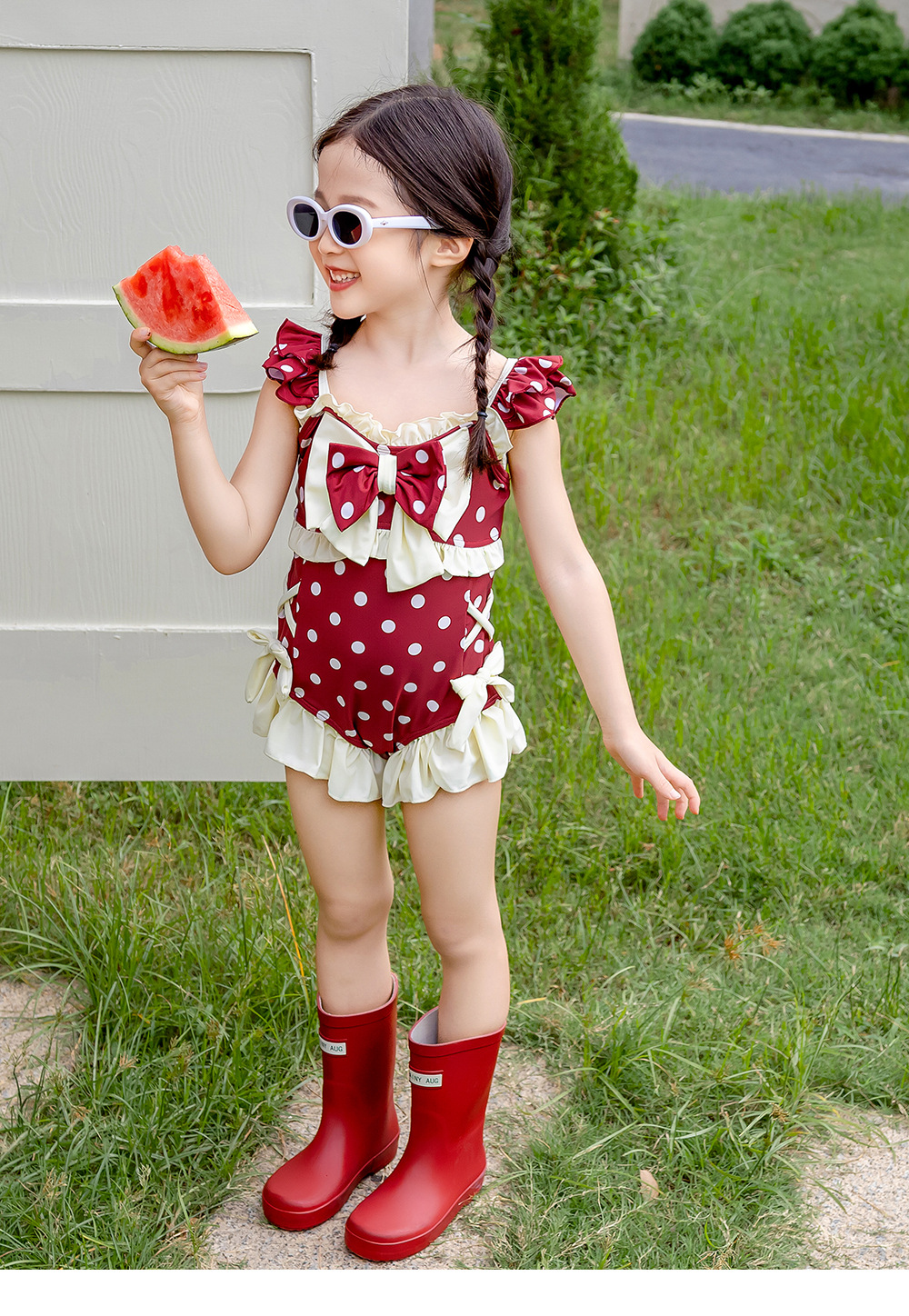 8582LS-夏裝女孩蝴蝶結游泳衣+泳帽