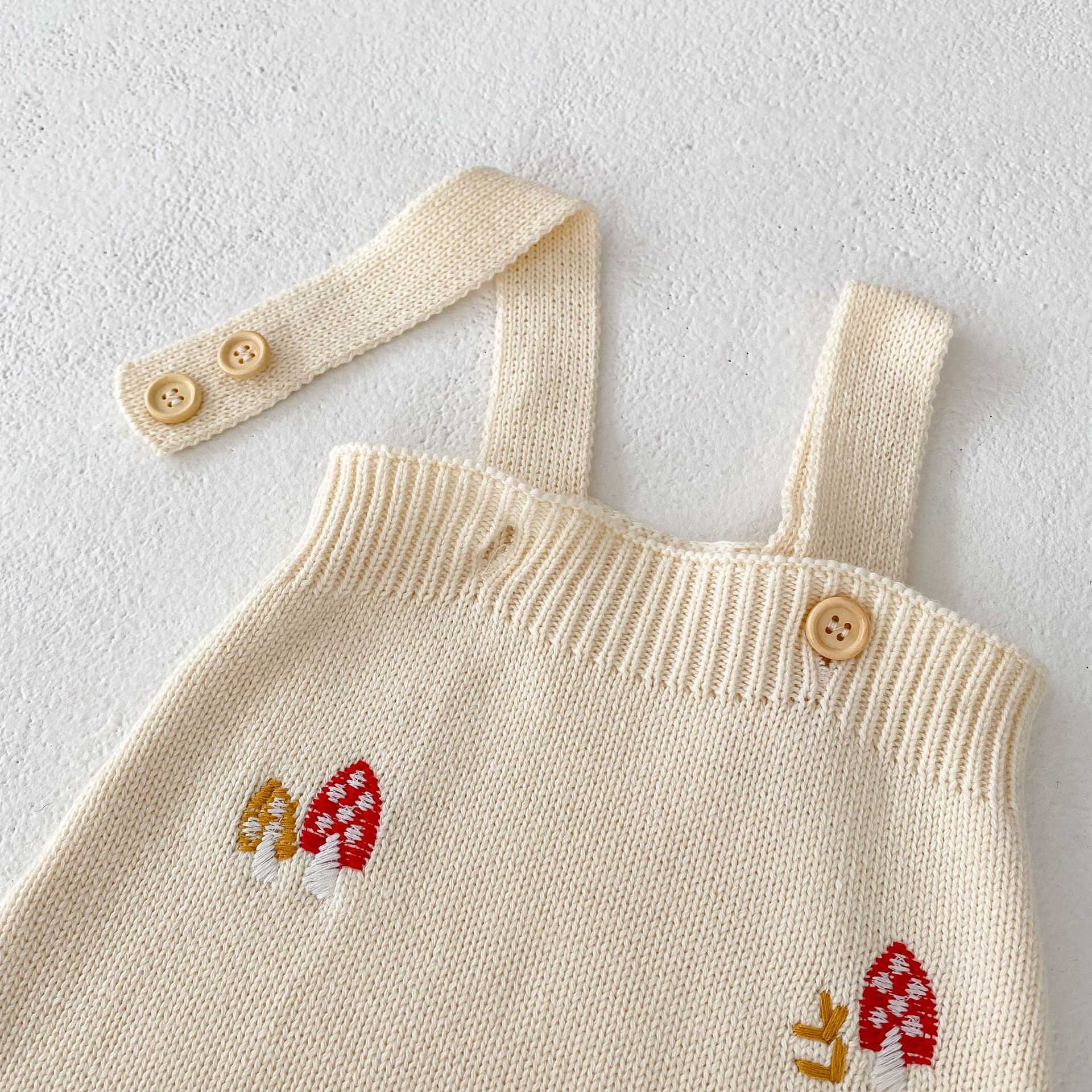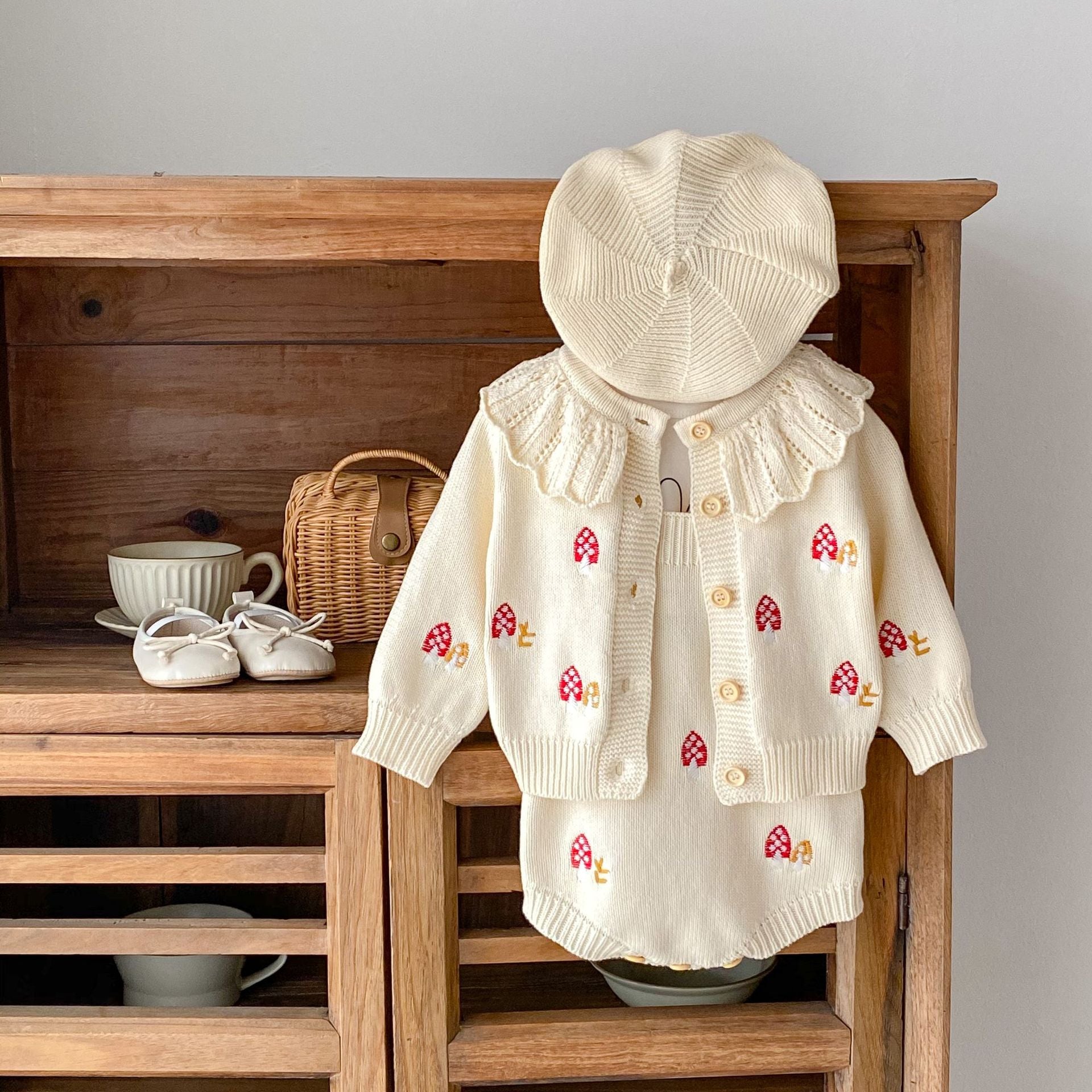 86111SE-秋季韓版嬰幼兒蘑菇刺繡荷葉領上衣外套&針織吊帶包屁