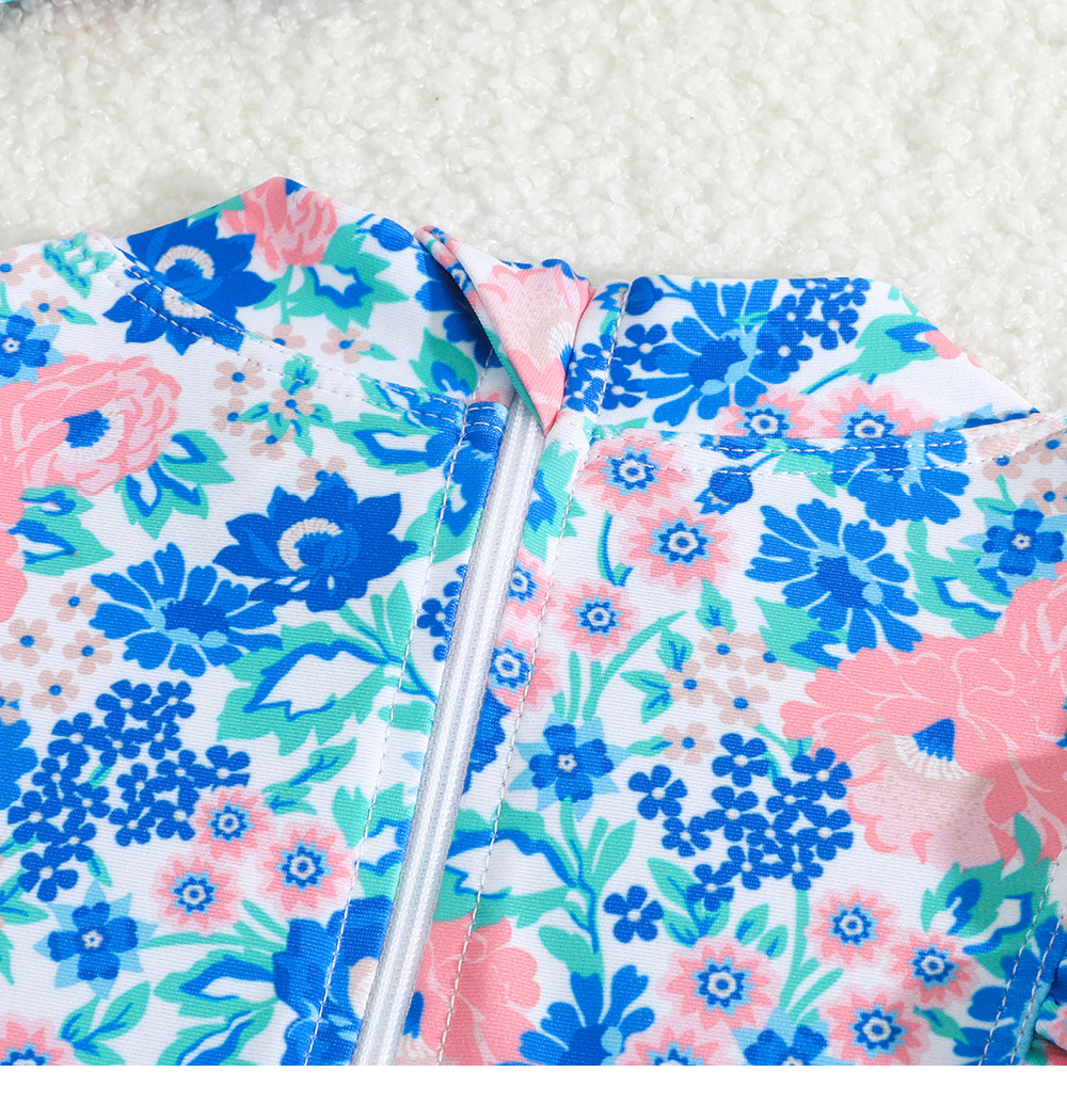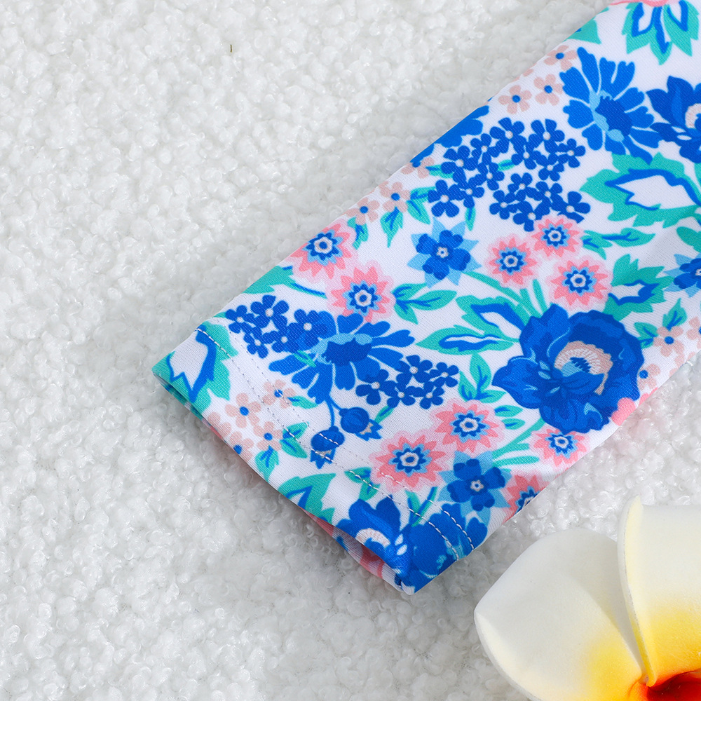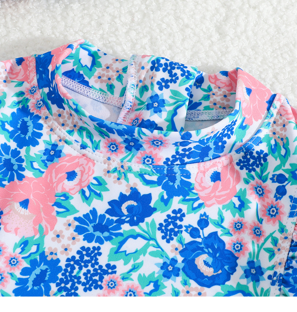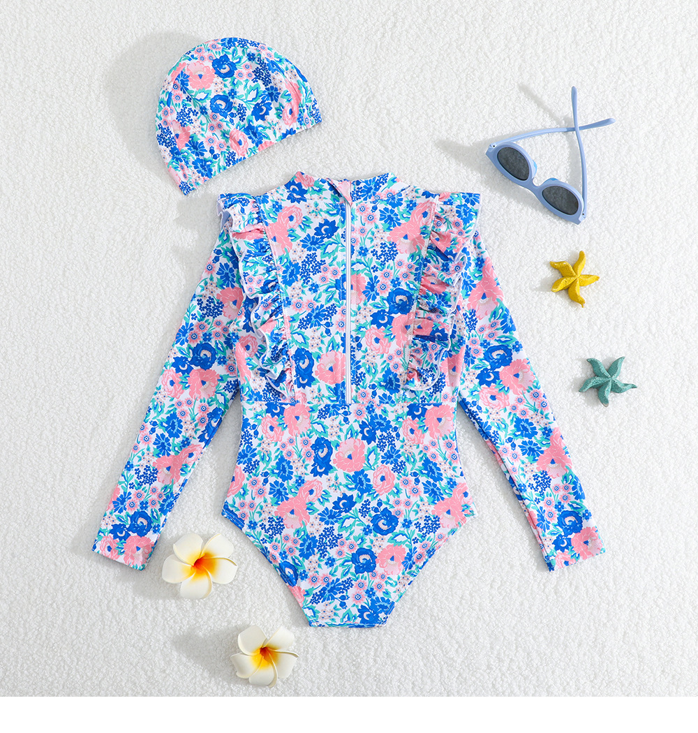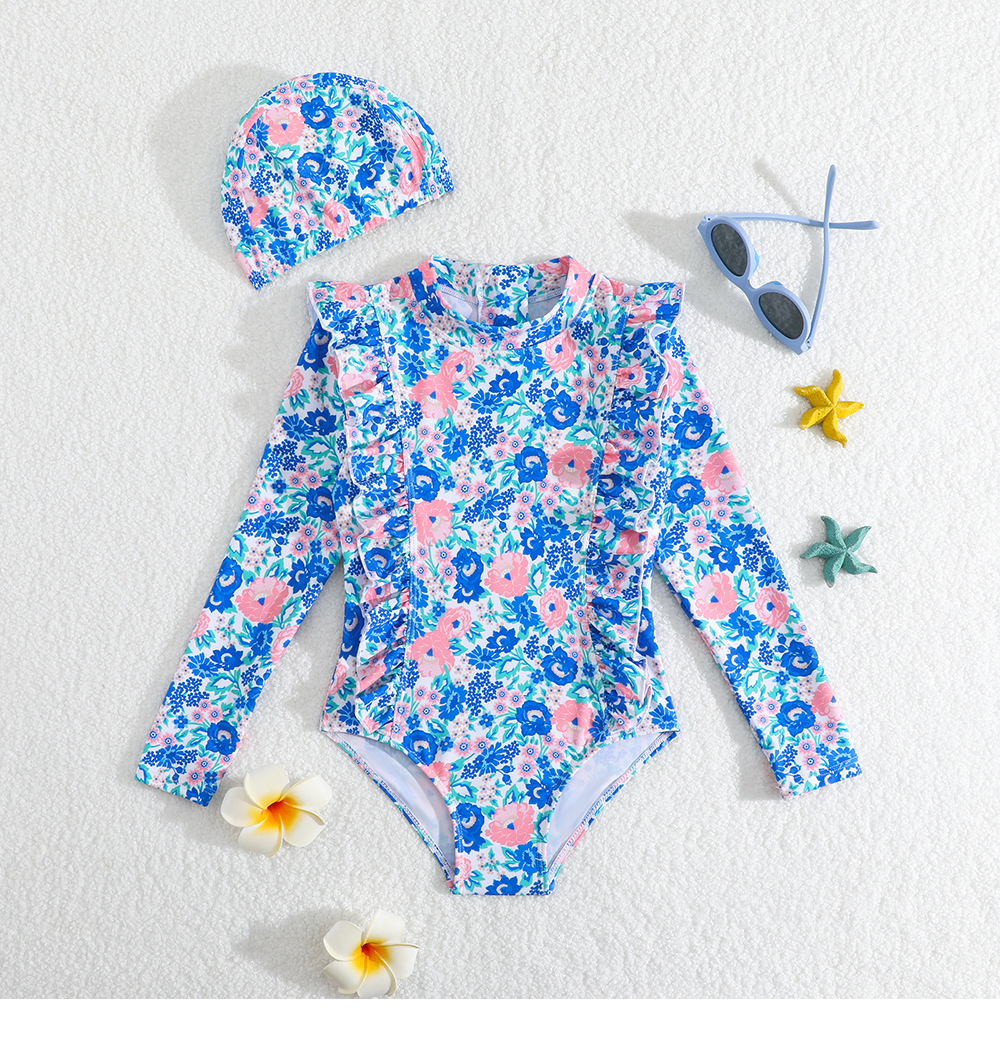 9509LS-夏季歐美碎花兒童長袖防曬泳衣+泳帽