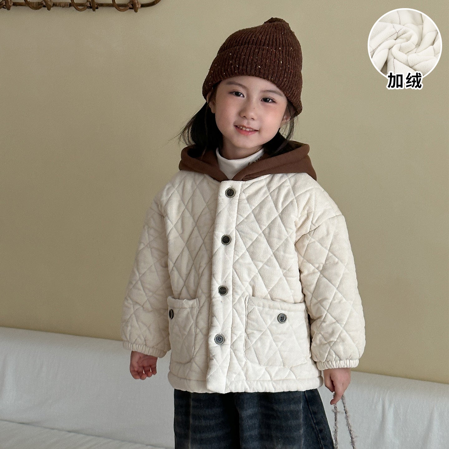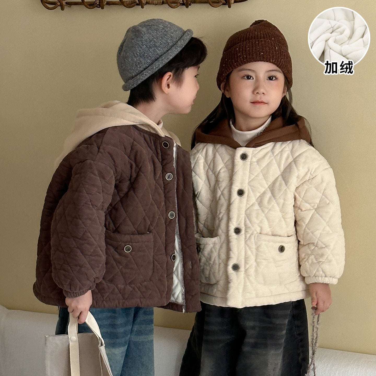 DM250628SE-冬季加絨燈芯絨壓格紋連帽外套