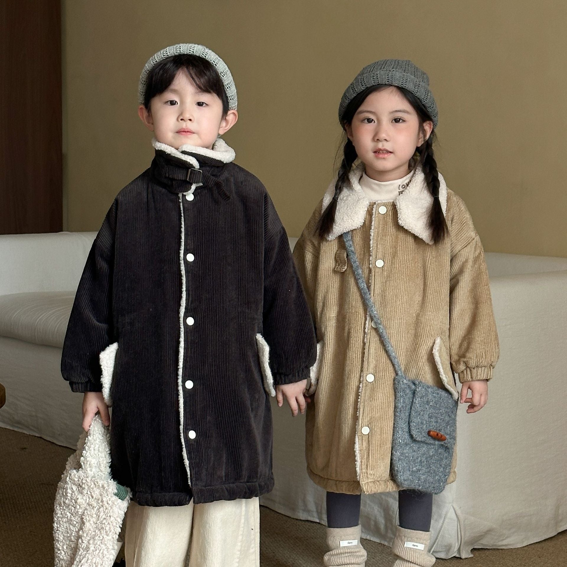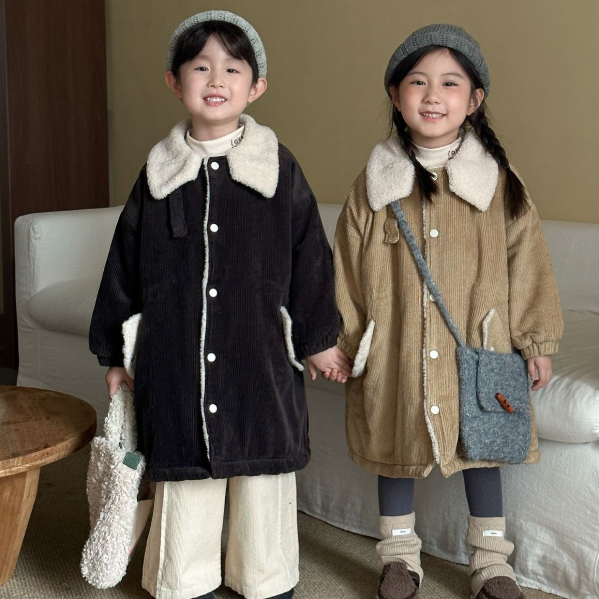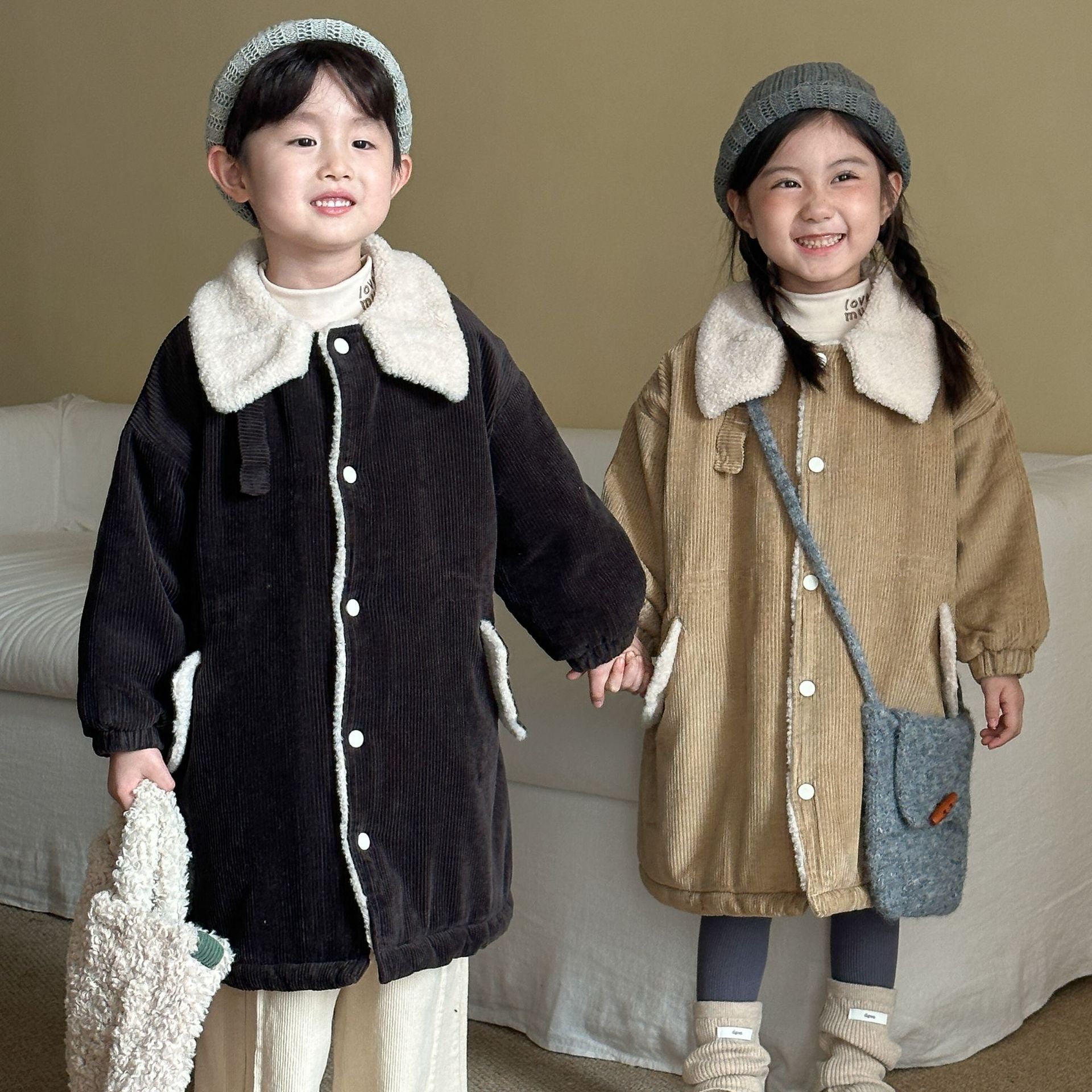 DM250634SE-冬季燈芯絨毛領長版棉風衣外套