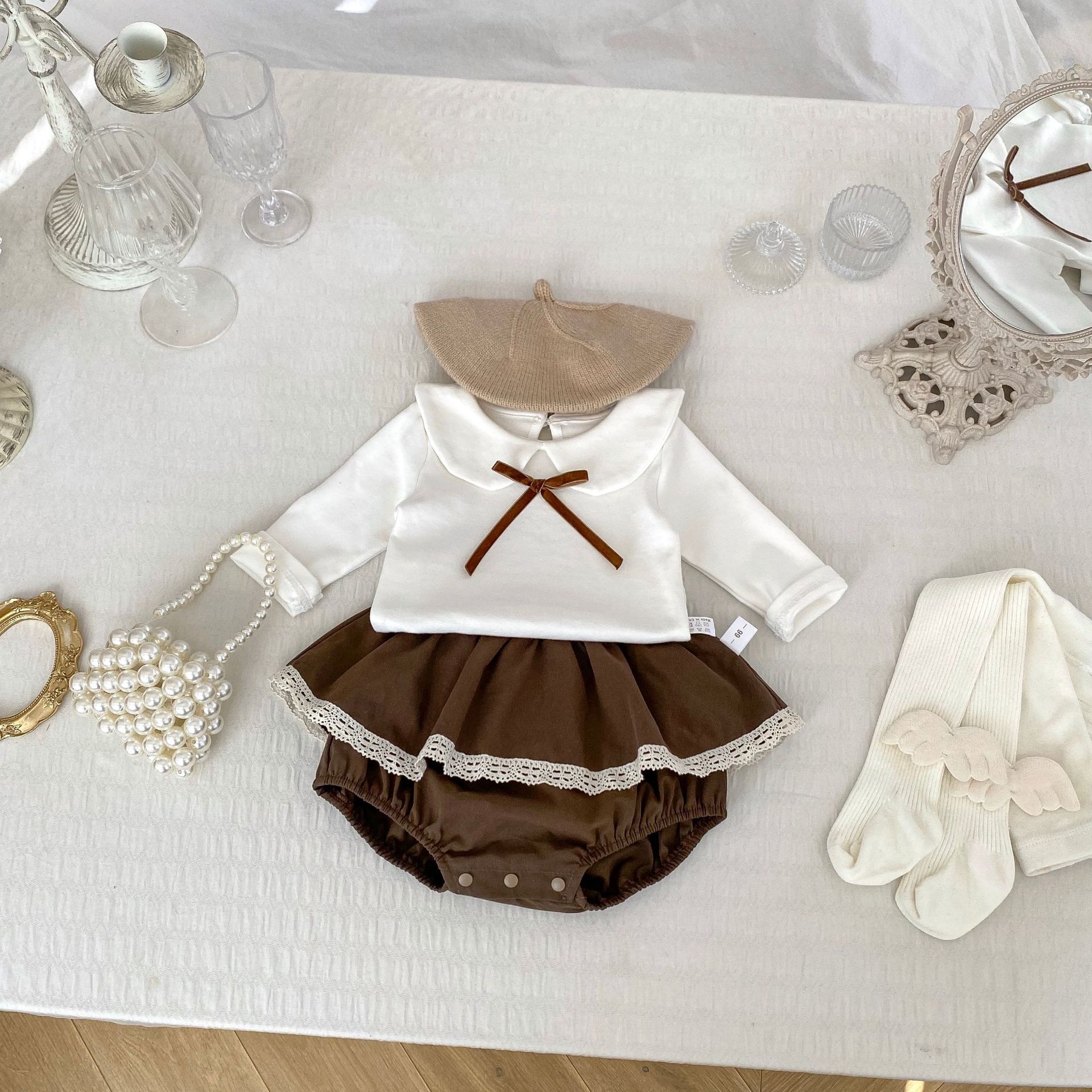 H10285TG-春秋蝴蝶結番領長袖上衣+花邊包屁裙兩件套