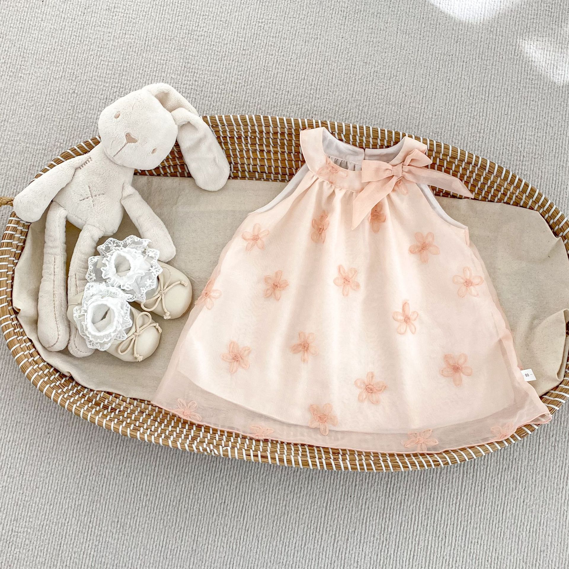 H10555DS-夏天女童無袖繡花網紗蝴蝶結洋裝