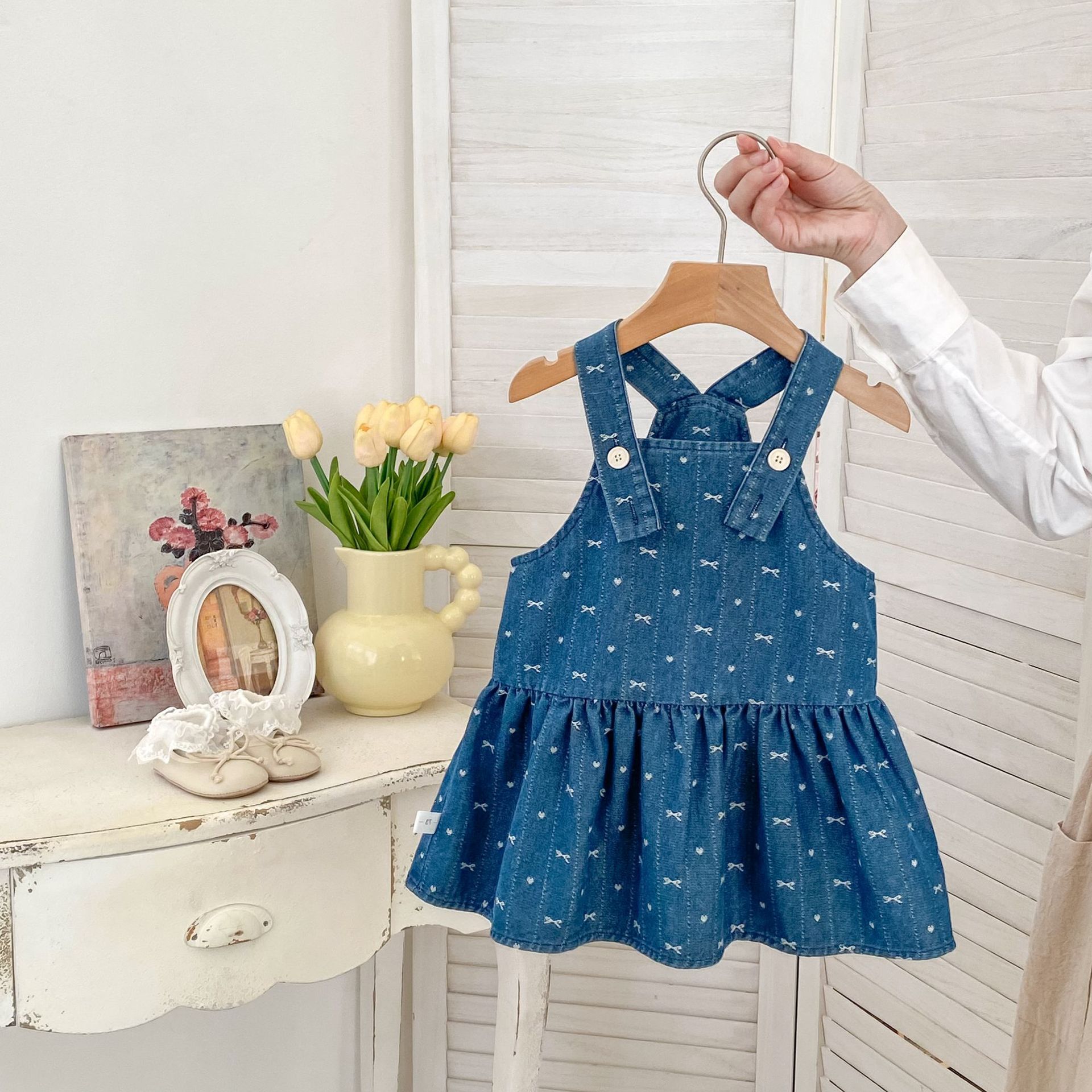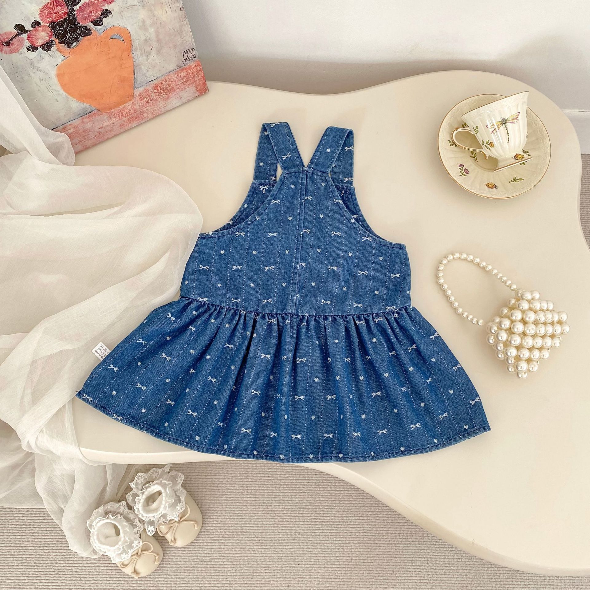 H10592LS-秋季女童蝴蝶結牛仔背帶裙&繡花娃娃領打底衫